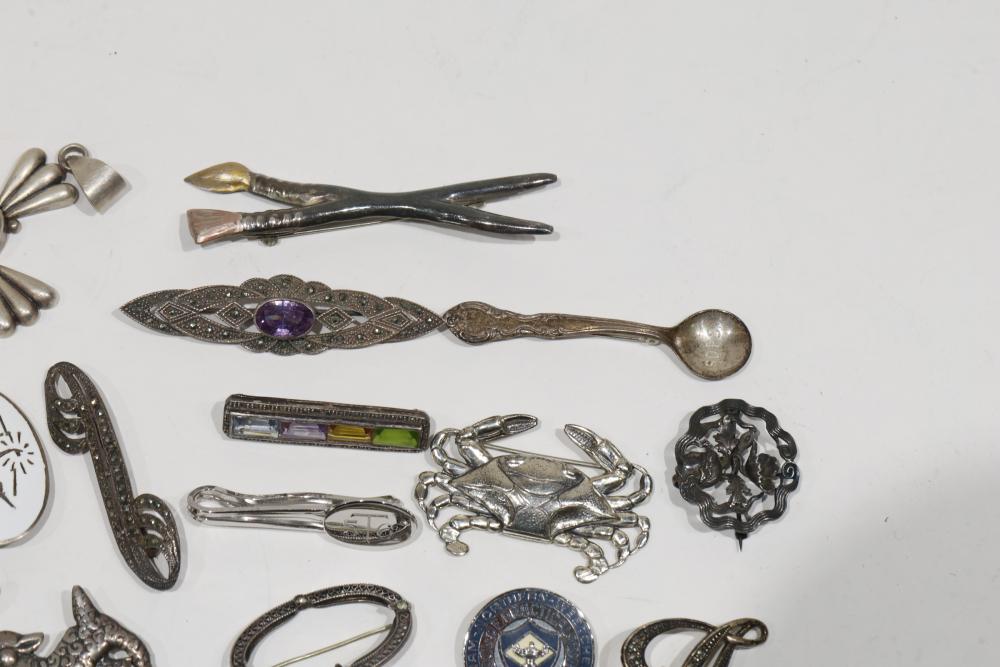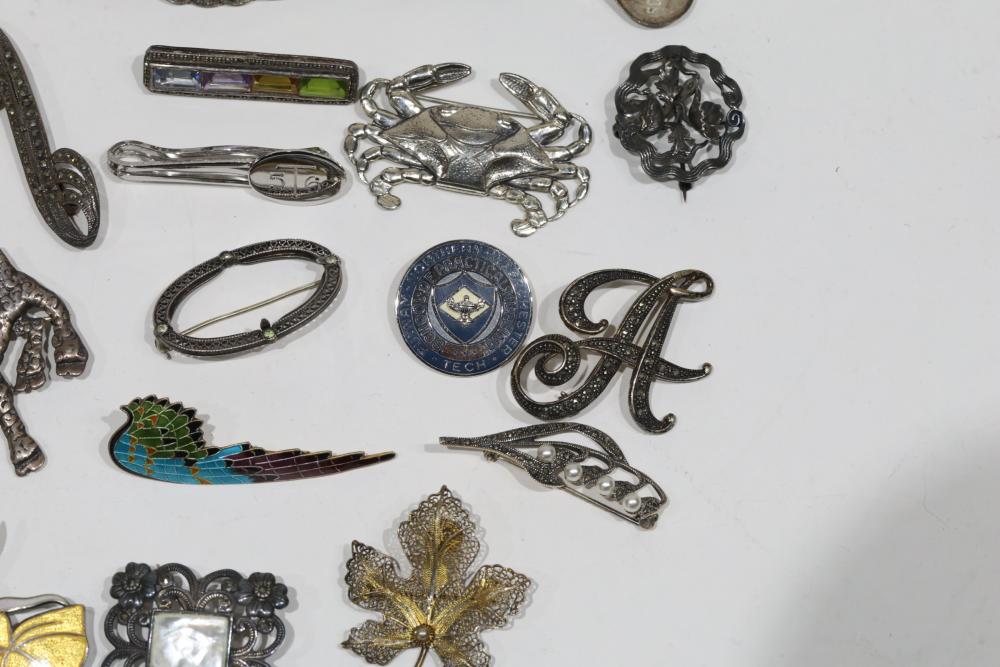 Sterling Silver Jewelry, Brooches, and Decorative Items. Includes various silver and enamel pins, brooches shaped as animals, and decorative spoons, with several stamped 925 or Sterling. Items range in styles and designs, incorporating elements like filigree and enamel. Total weight being 218 grams.
