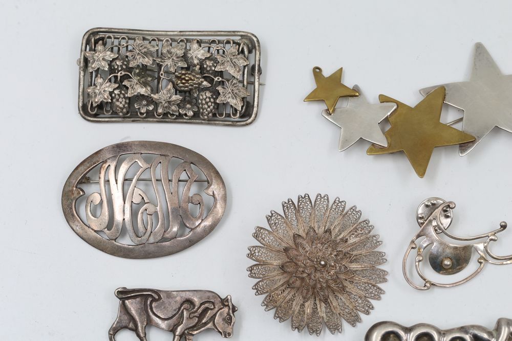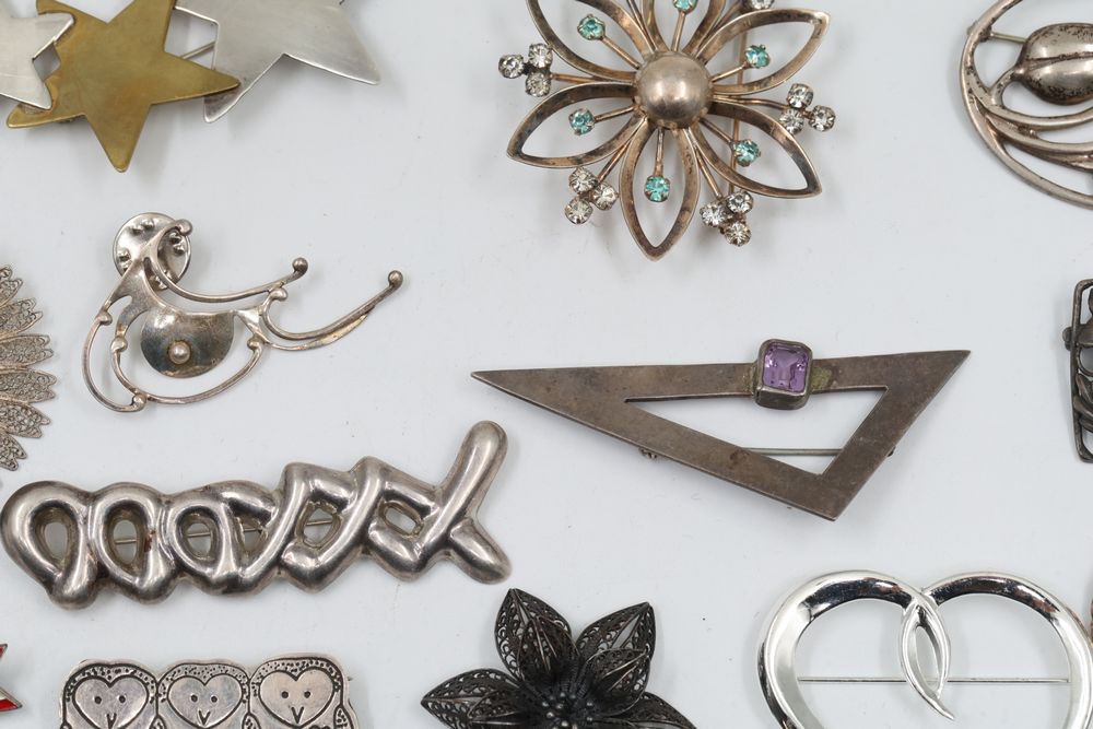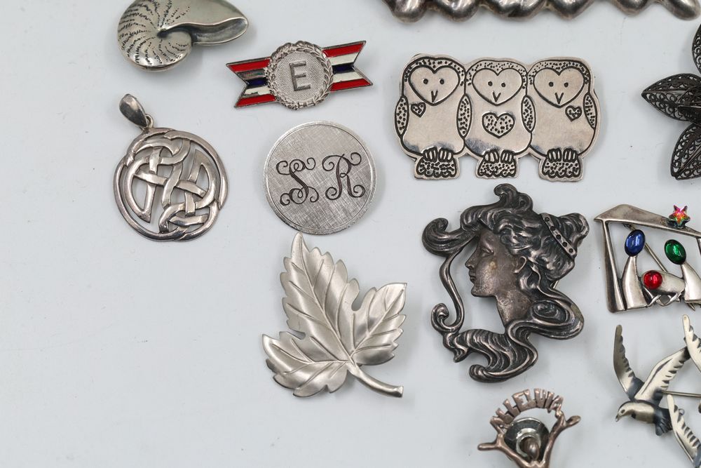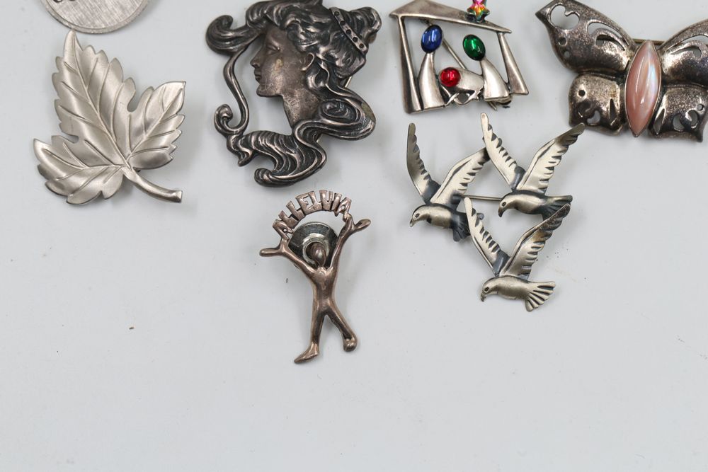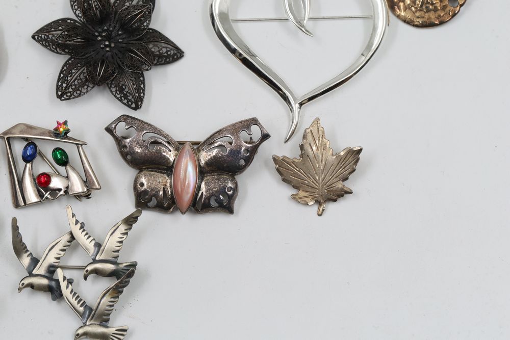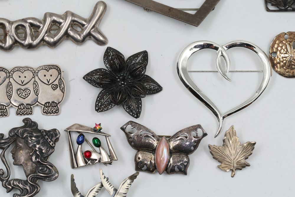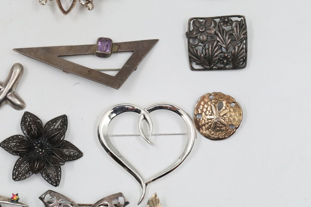 Sterling Silver Pins and Brooches with Varied Designs. Includes numerous sterling silver pieces stamped with "Sterling" or "925," featuring diverse forms such as hearts, floral motifs, animals, geometric shapes, and stars. Some pieces include gemstones or enamel accents. Sterling weight being 182 grams. Total weight being 206 grams total.
