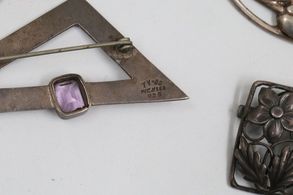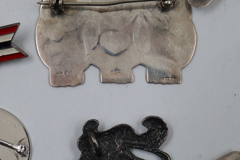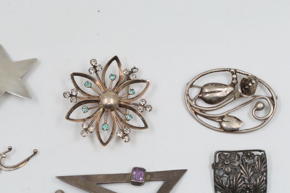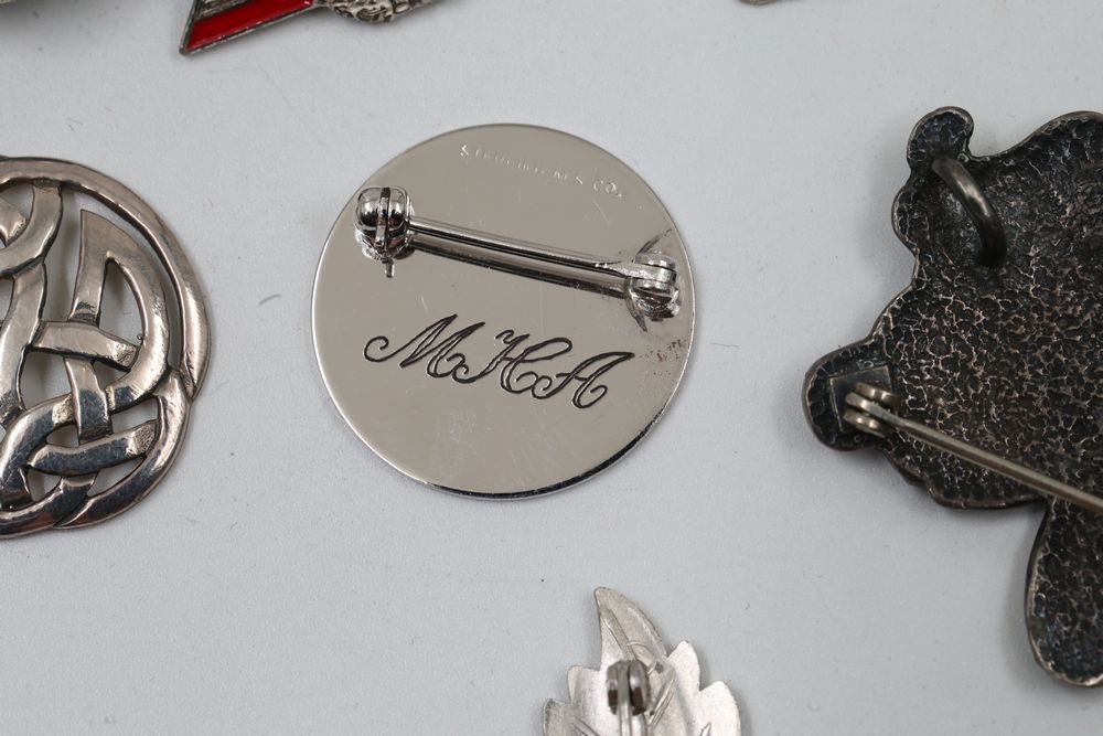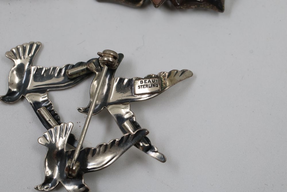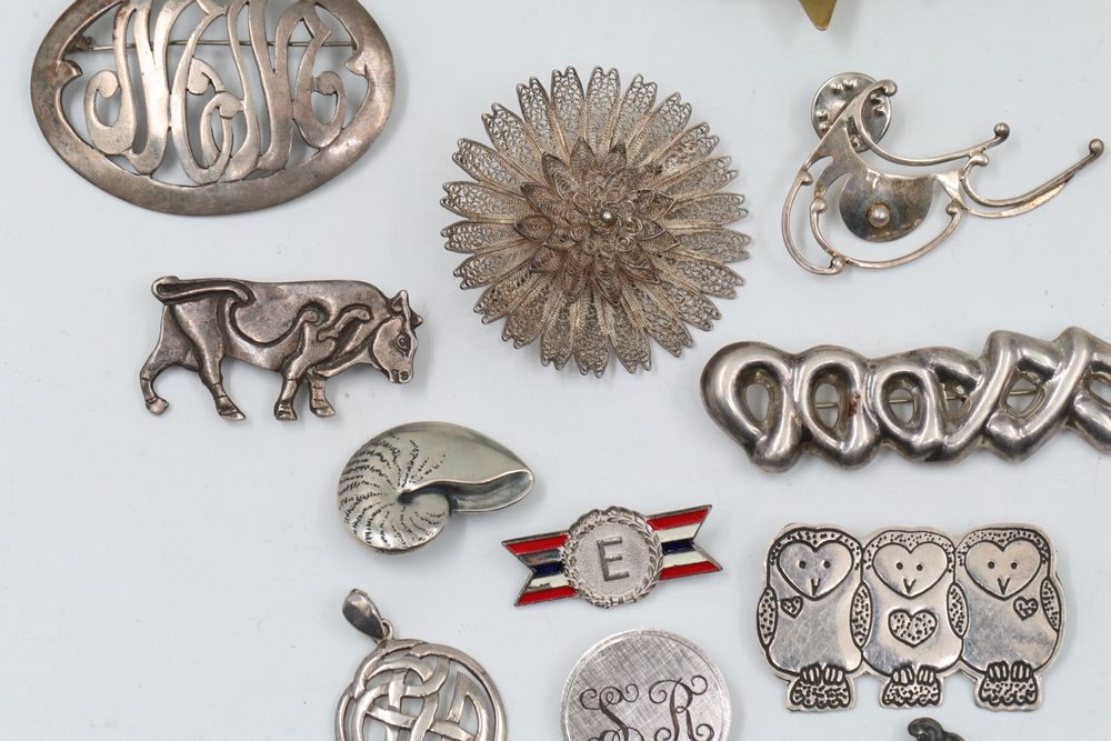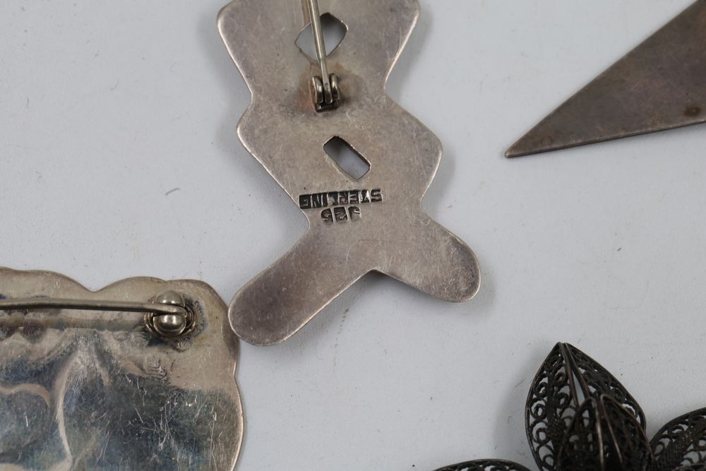 Sterling Silver Pins and Brooches with Varied Designs. Includes numerous sterling silver pieces stamped with "Sterling" or "925," featuring diverse forms such as hearts, floral motifs, animals, geometric shapes, and stars. Some pieces include gemstones or enamel accents. Sterling weight being 182 grams. Total weight being 206 grams total.