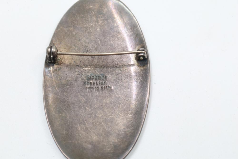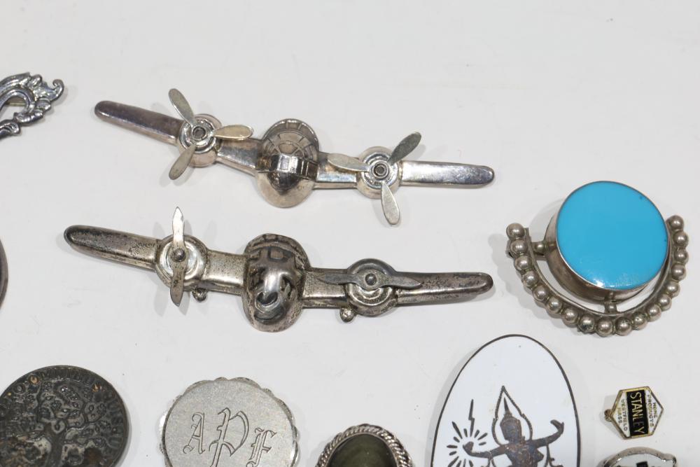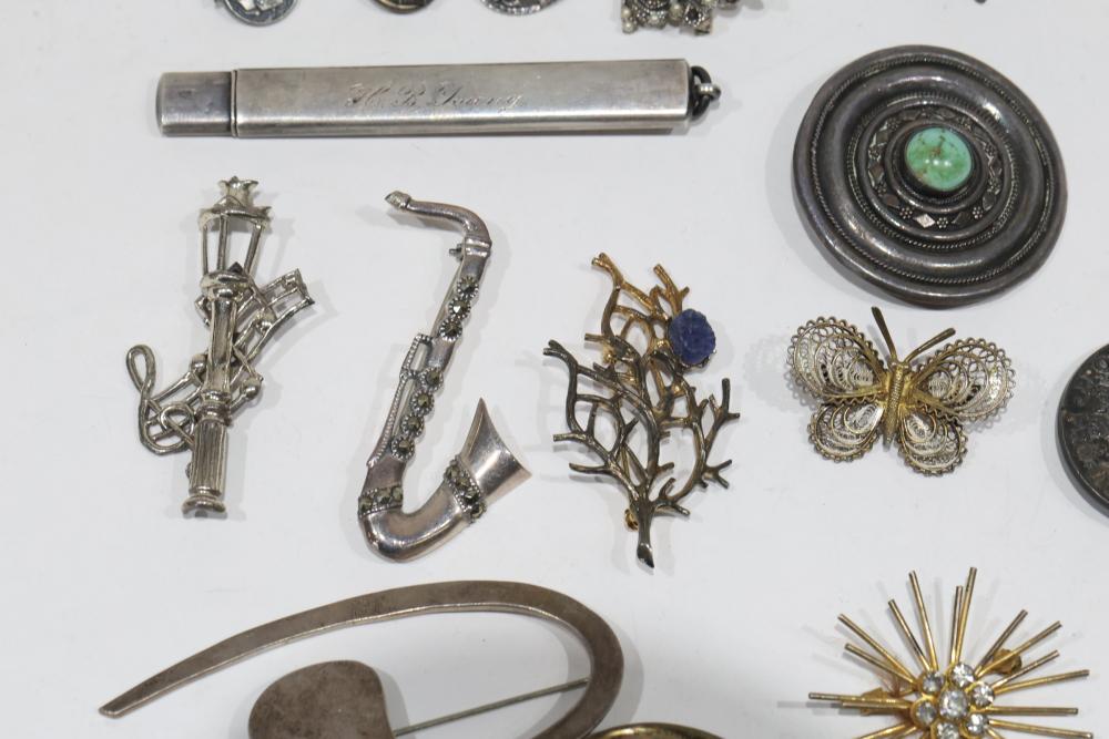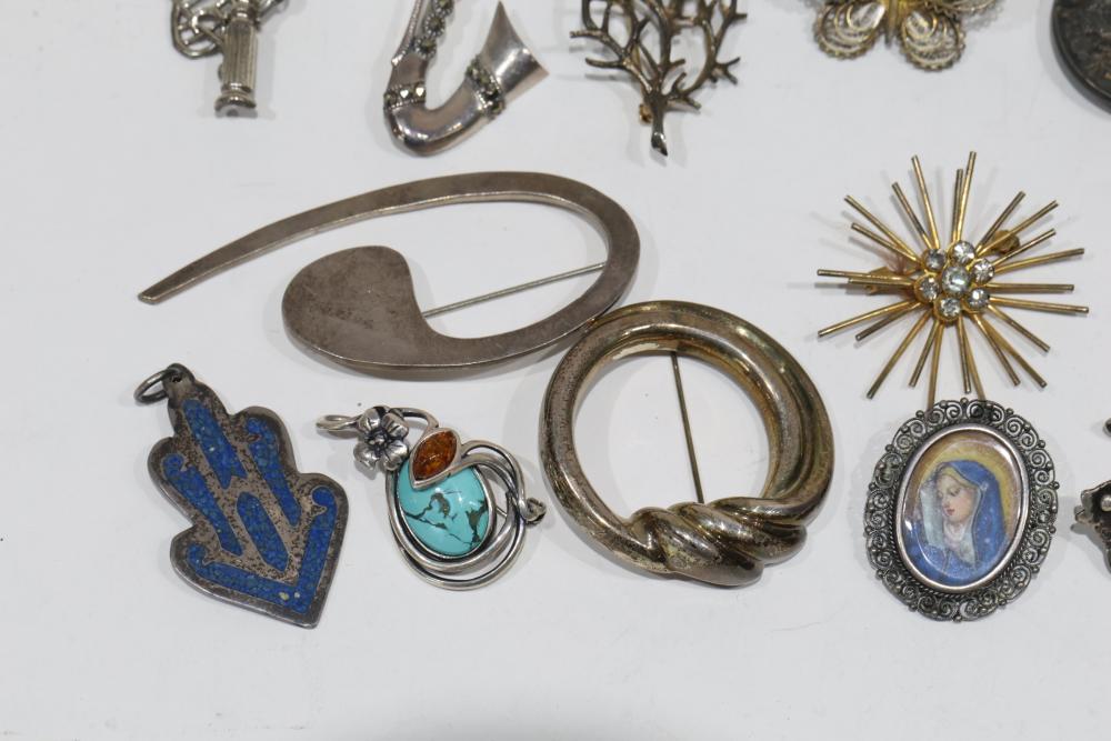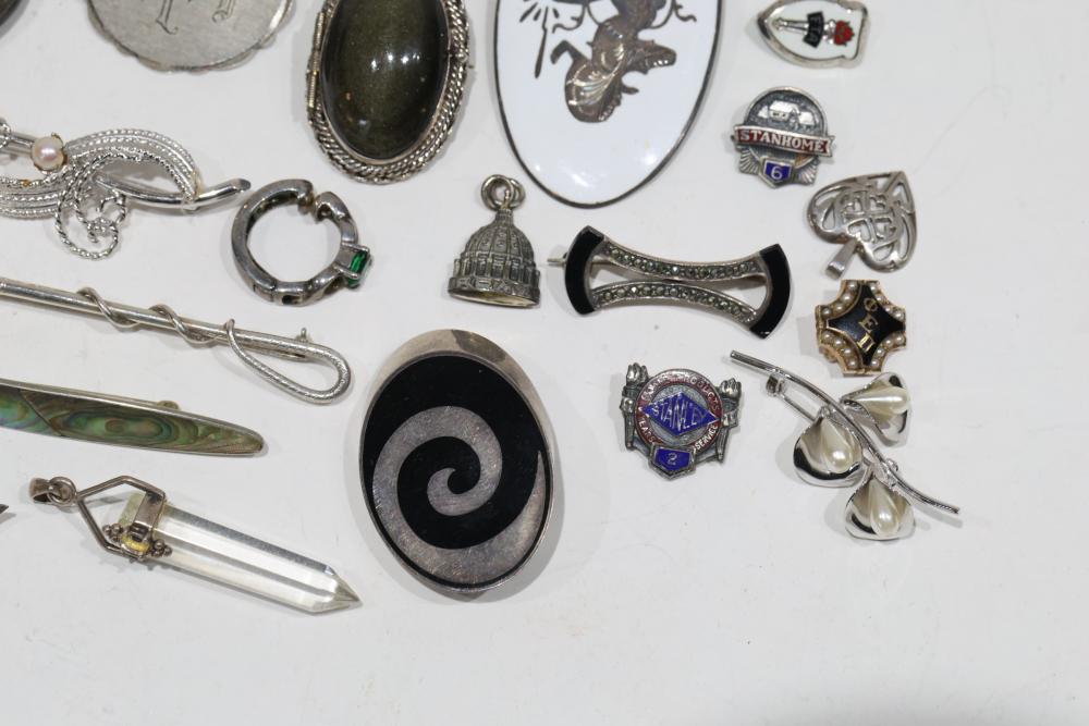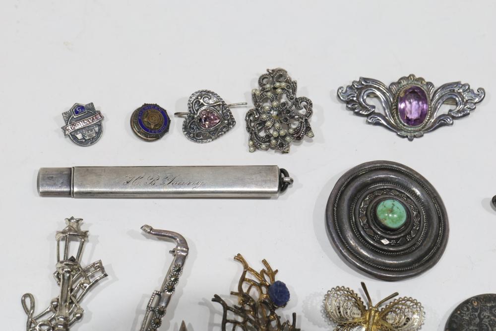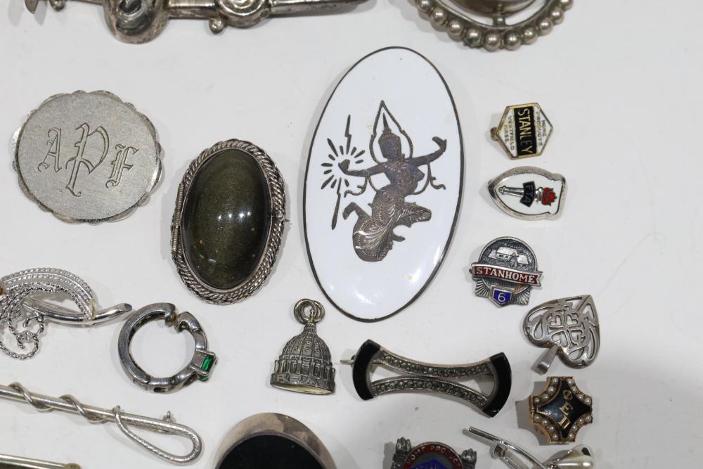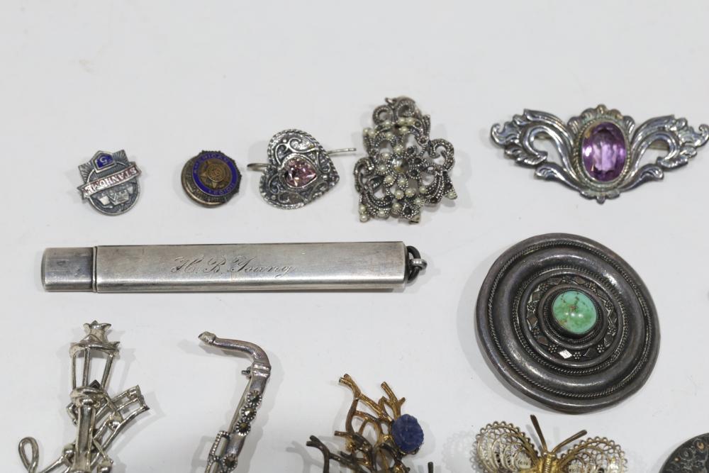 Sterling Silver Jewelry Pieces. Includes brooches, pins, pendants, rings, and other items. Several pieces are marked Sterling or 925. Wide variety of designs and styles, featuring elements like gemstones, enamel, and intricate metalwork. Items show various signs of wear. Total weight not including pencil being 237 grams.