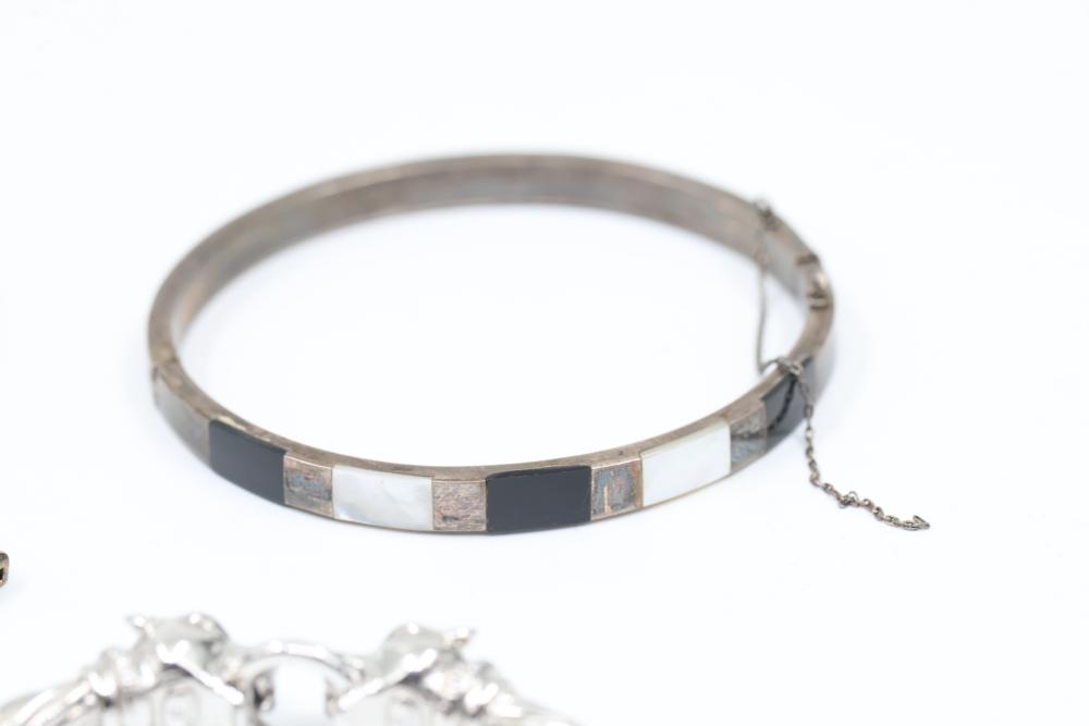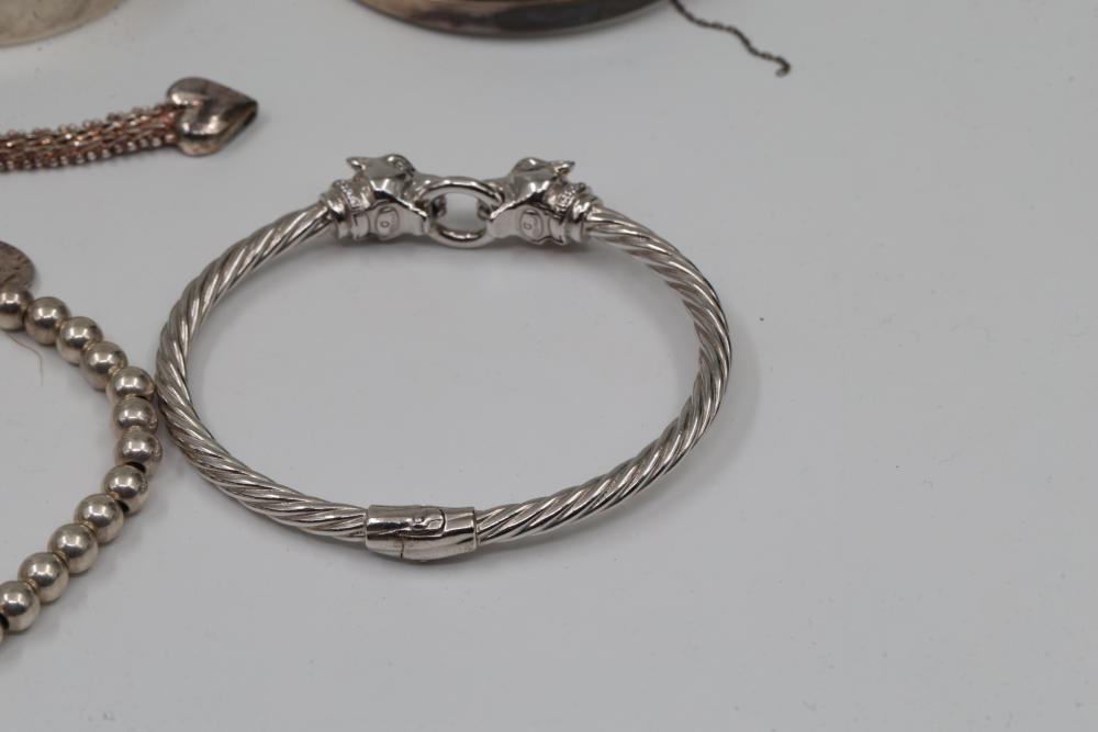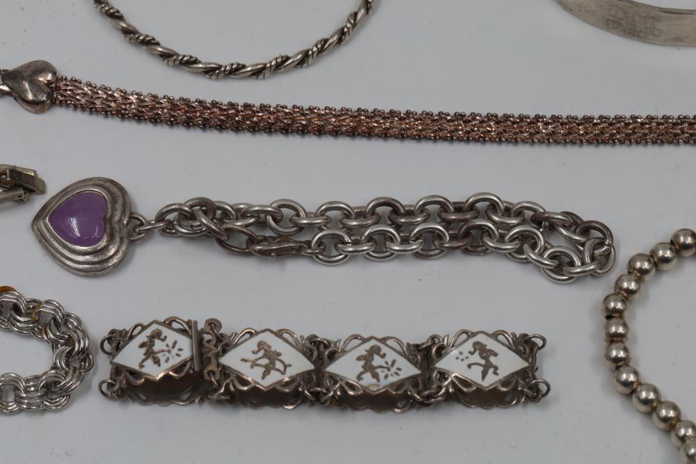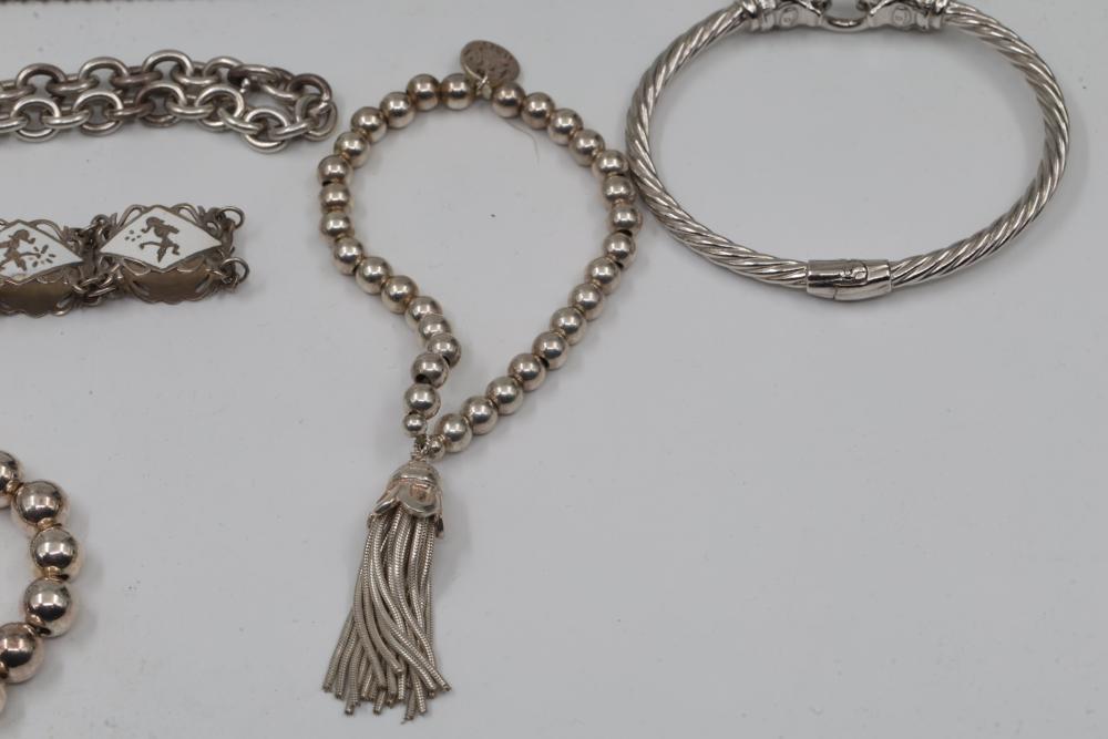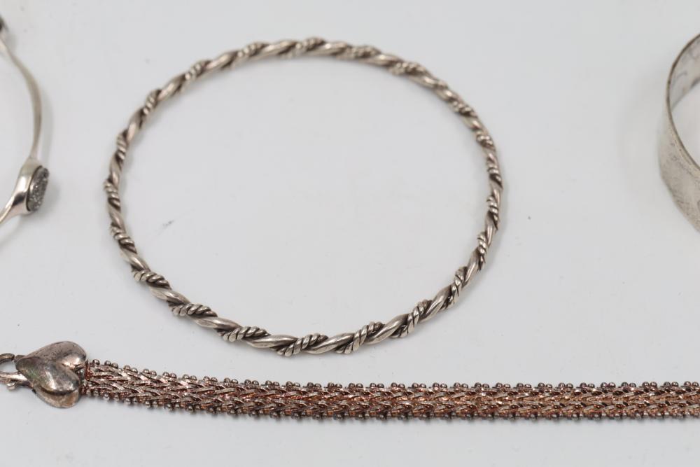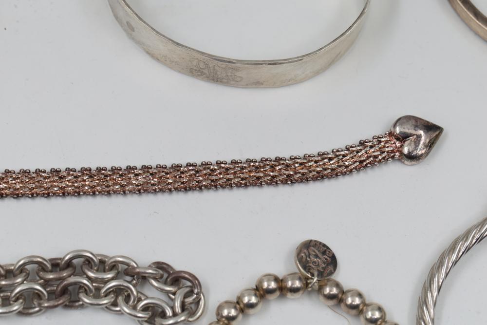 Sterling Silver and Assorted Jewelry Pieces including bracelets, bangles, a chain, and a charm. Some items are stamped with markings such as '925' and 'Sterling.' Varied styles and designs, with materials including silver and potential mixed metals. Total weight being 209 grams.