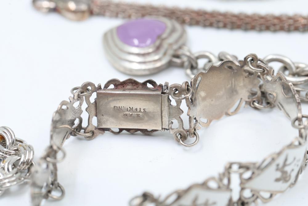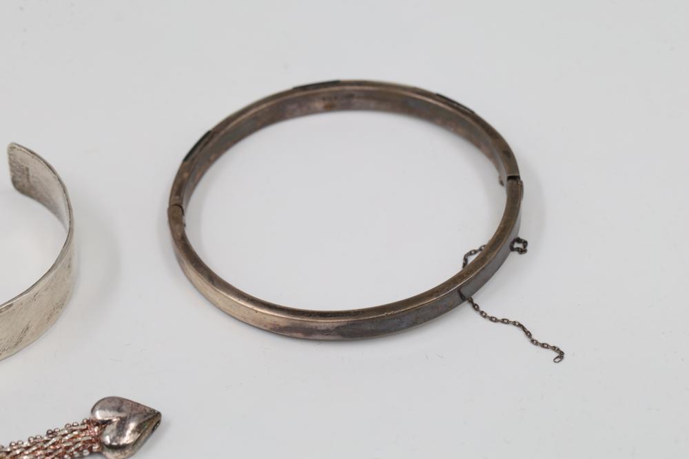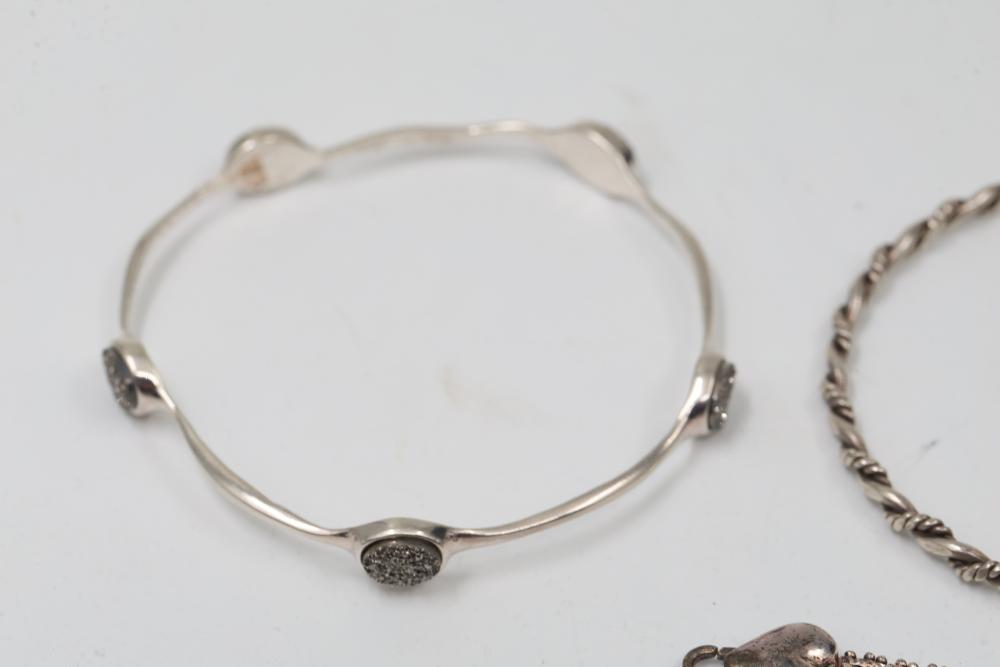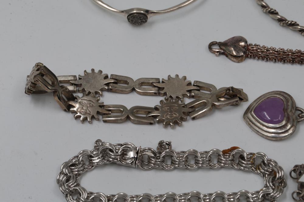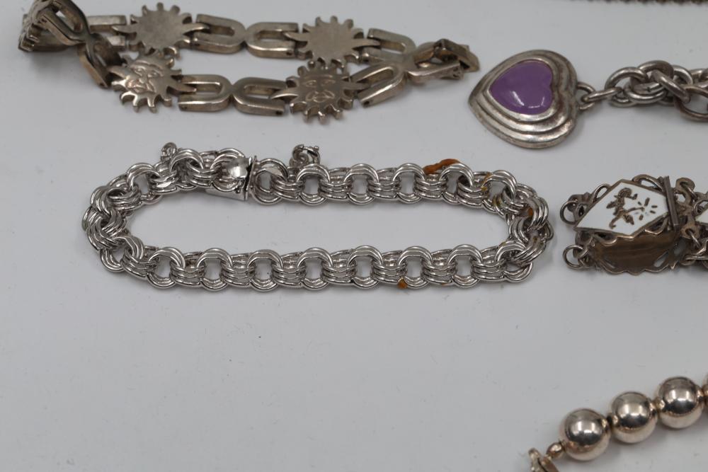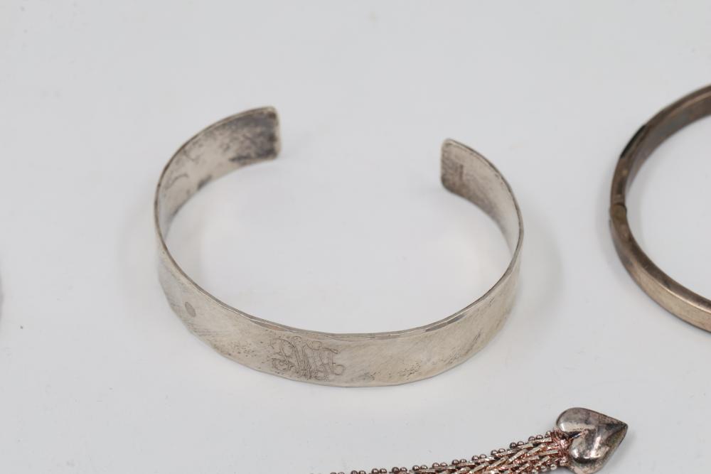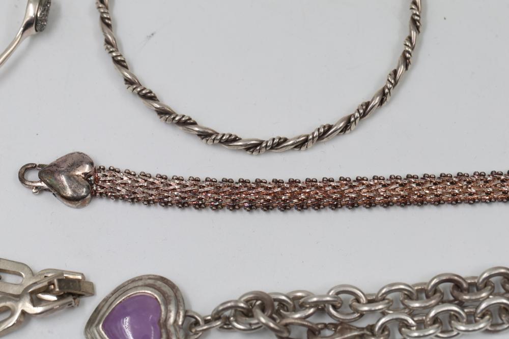 Sterling Silver and Assorted Jewelry Pieces including bracelets, bangles, a chain, and a charm. Some items are stamped with markings such as '925' and 'Sterling.' Varied styles and designs, with materials including silver and potential mixed metals. Total weight being 209 grams.