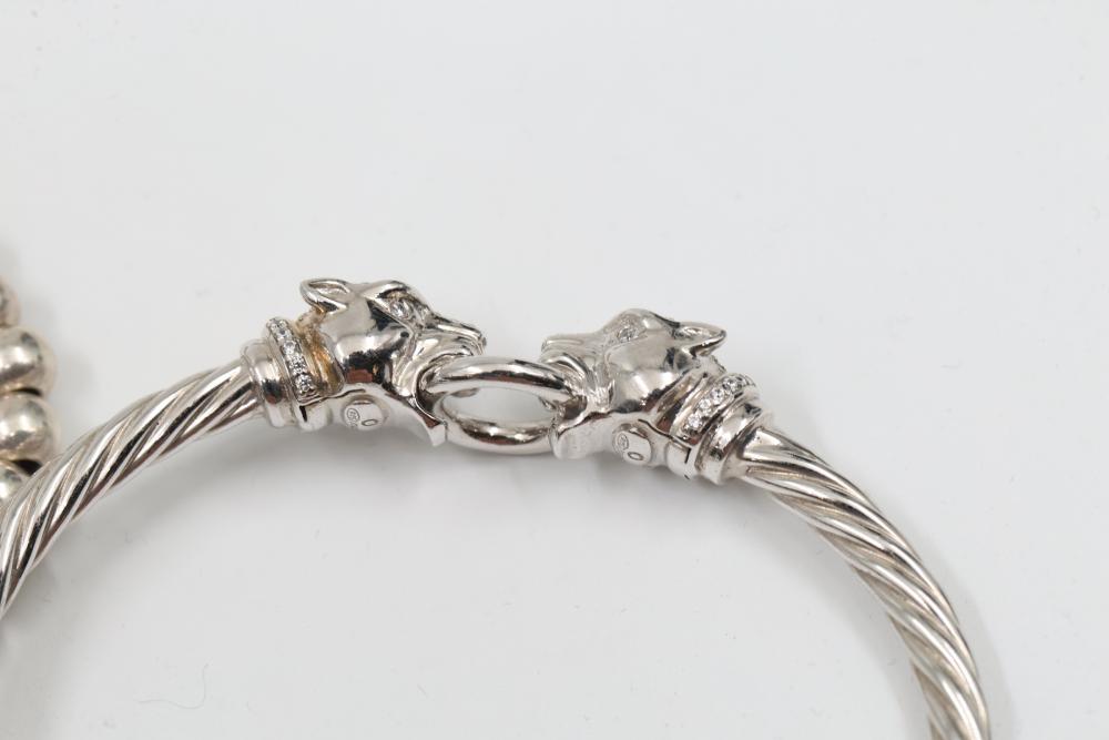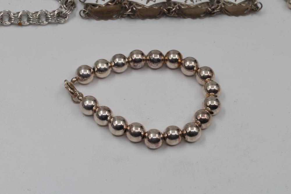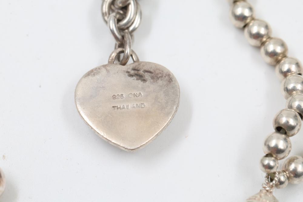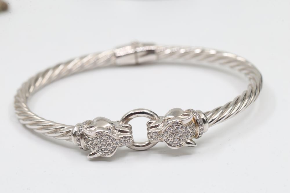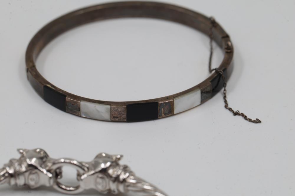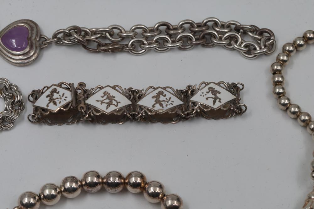 Sterling Silver and Assorted Jewelry Pieces including bracelets, bangles, a chain, and a charm. Some items are stamped with markings such as '925' and 'Sterling.' Varied styles and designs, with materials including silver and potential mixed metals. Total weight being 209 grams.
