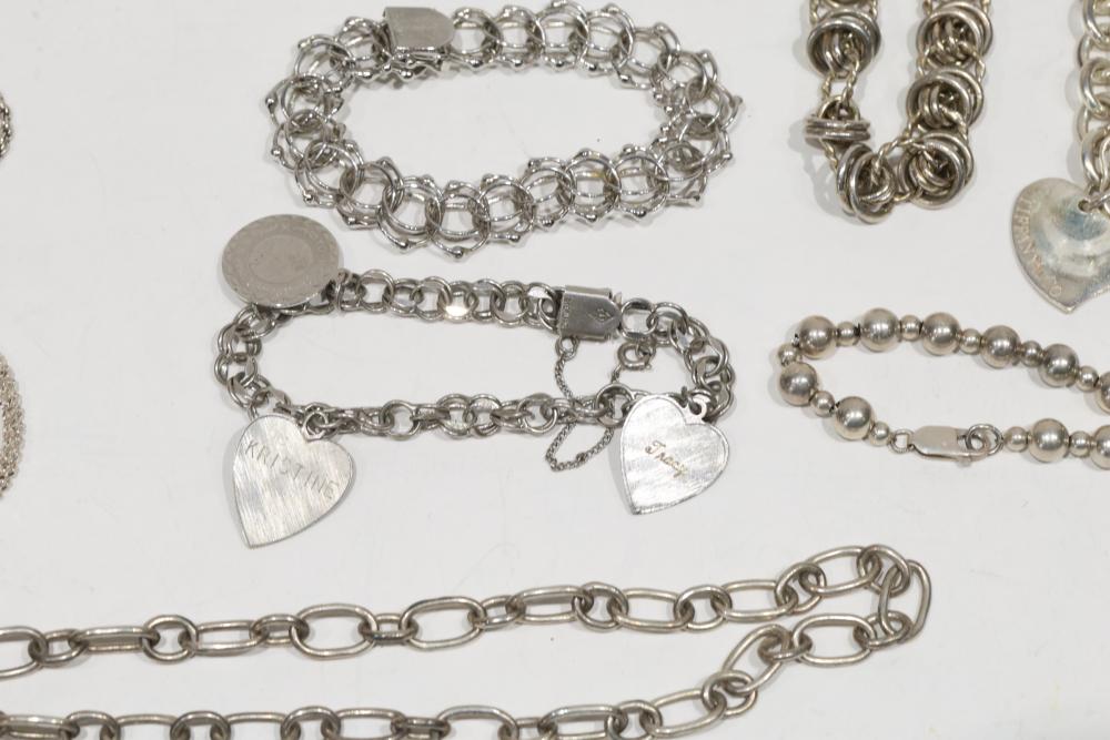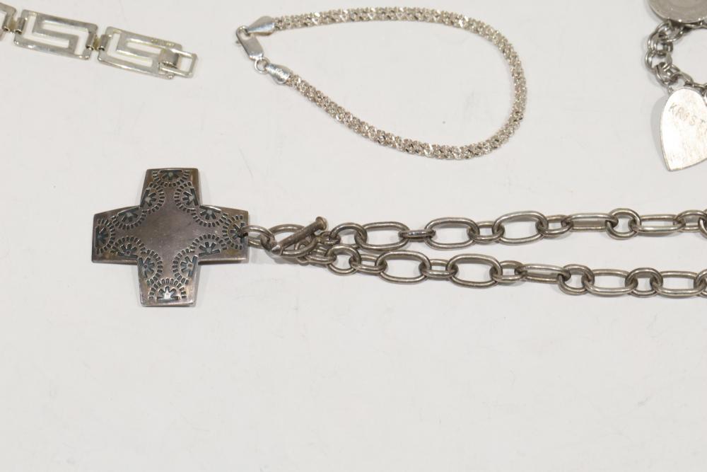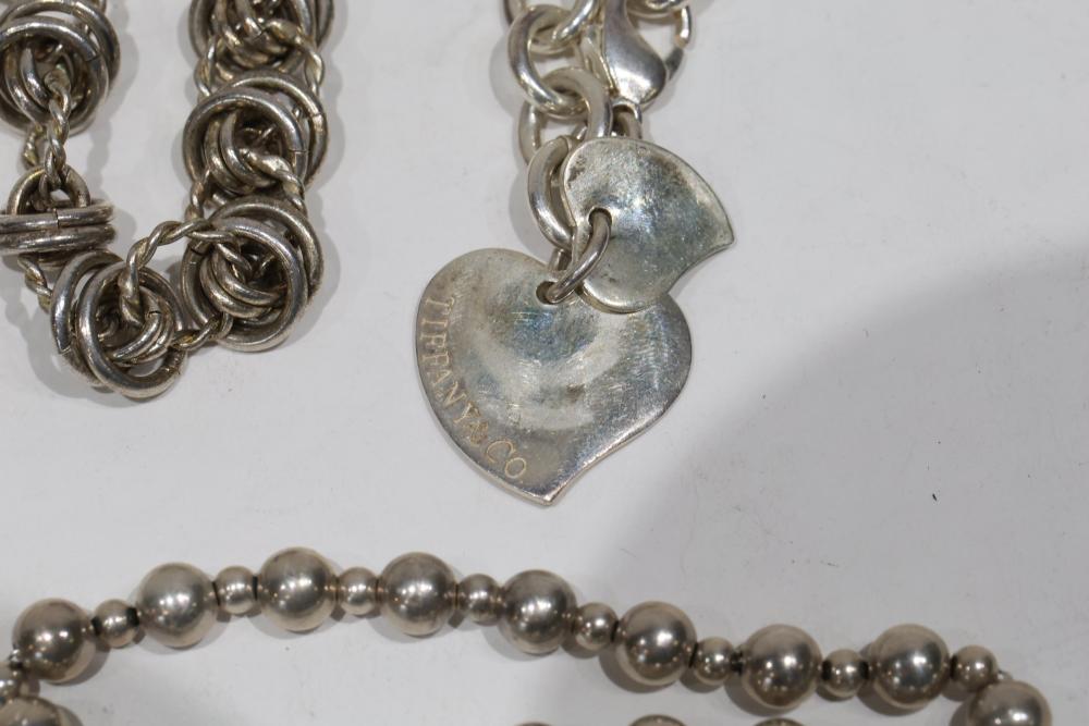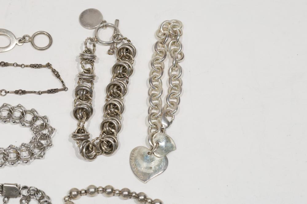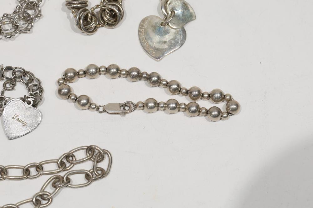 Sterling silver jewelry featuring bracelets and necklaces, including pieces marked Tiffany & Co., Spencer, and stamped 925. Some items include heart and cross pendants. Total weight being 207 grams.
