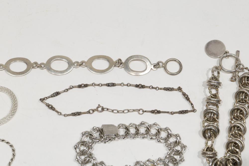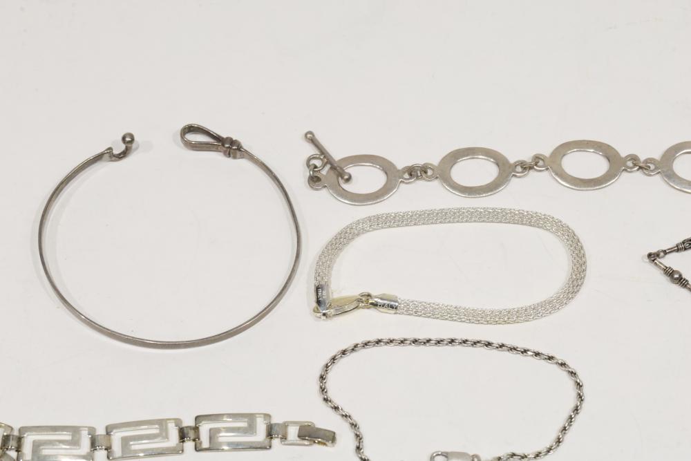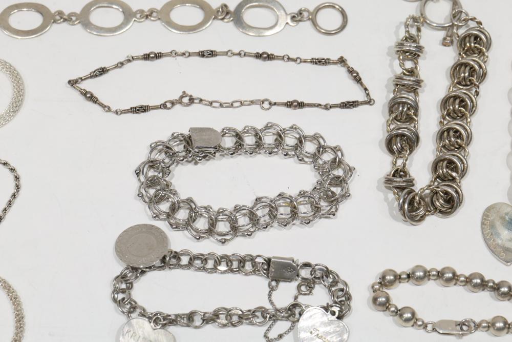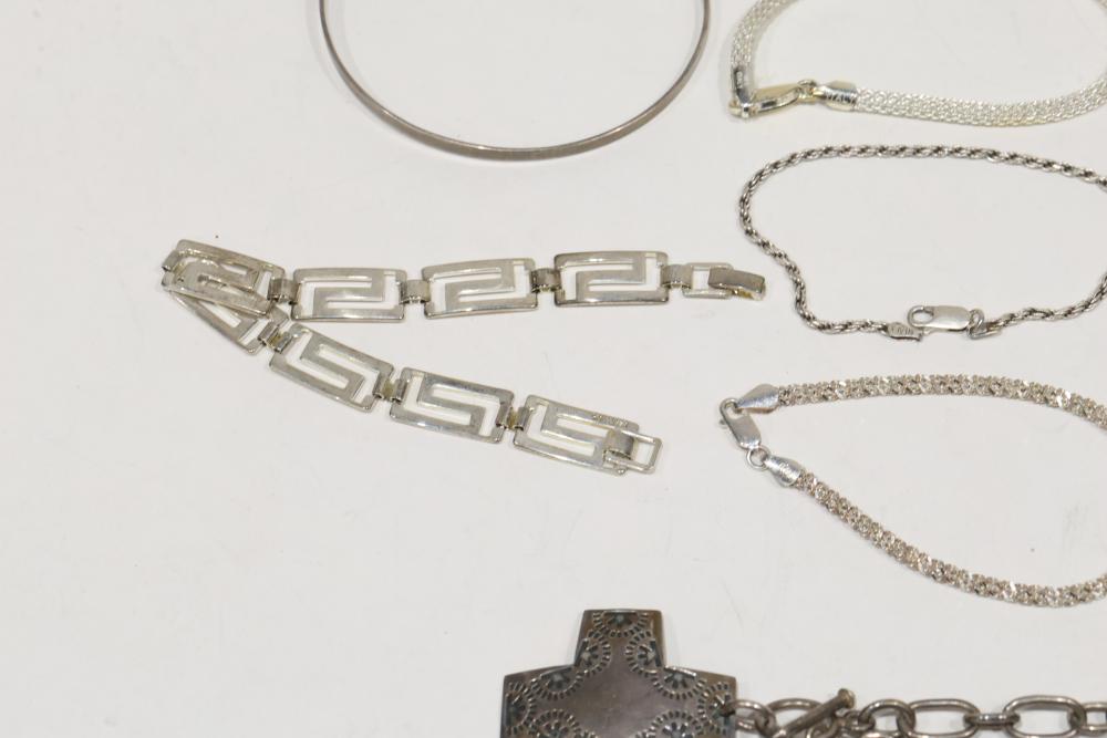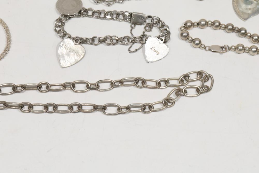 Sterling silver jewelry featuring bracelets and necklaces, including pieces marked Tiffany & Co., Spencer, and stamped 925. Some items include heart and cross pendants. Total weight being 207 grams.