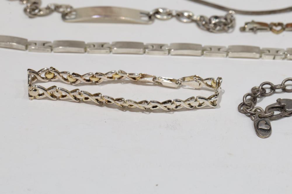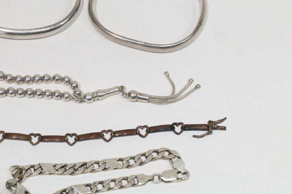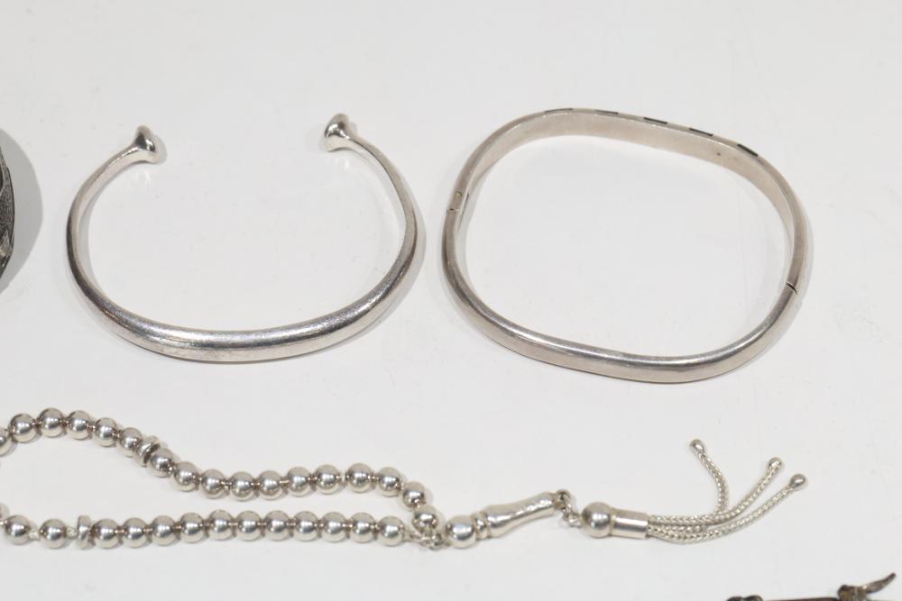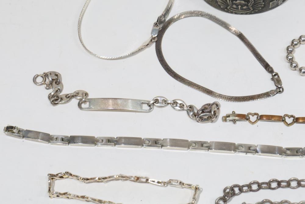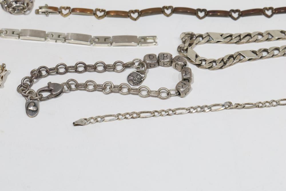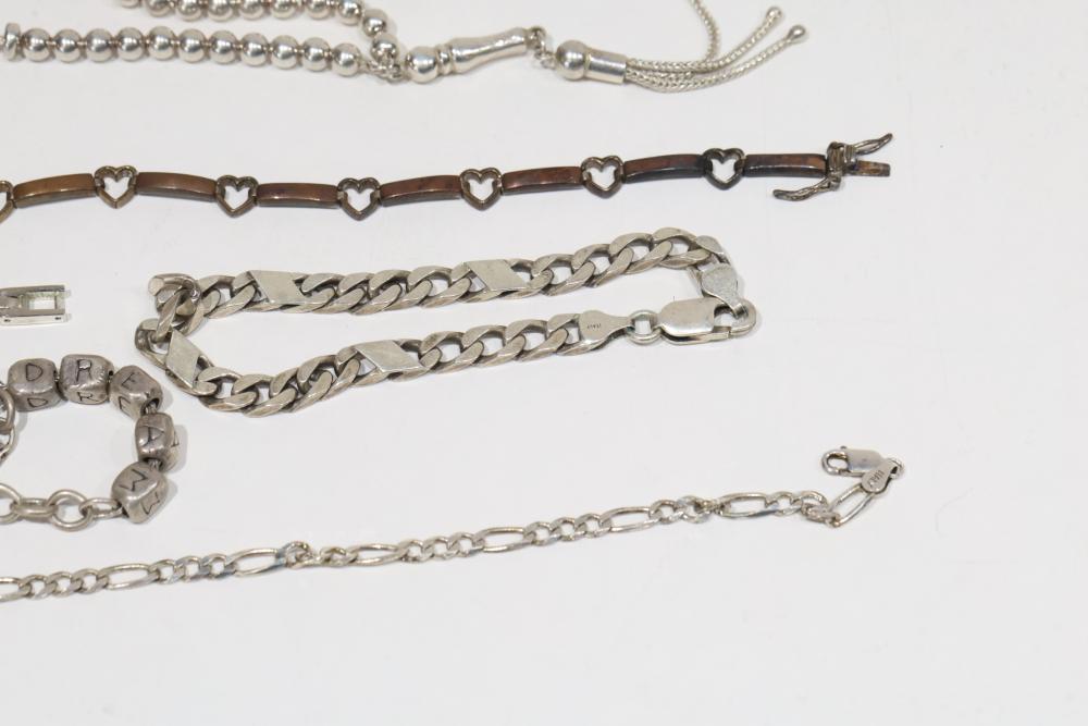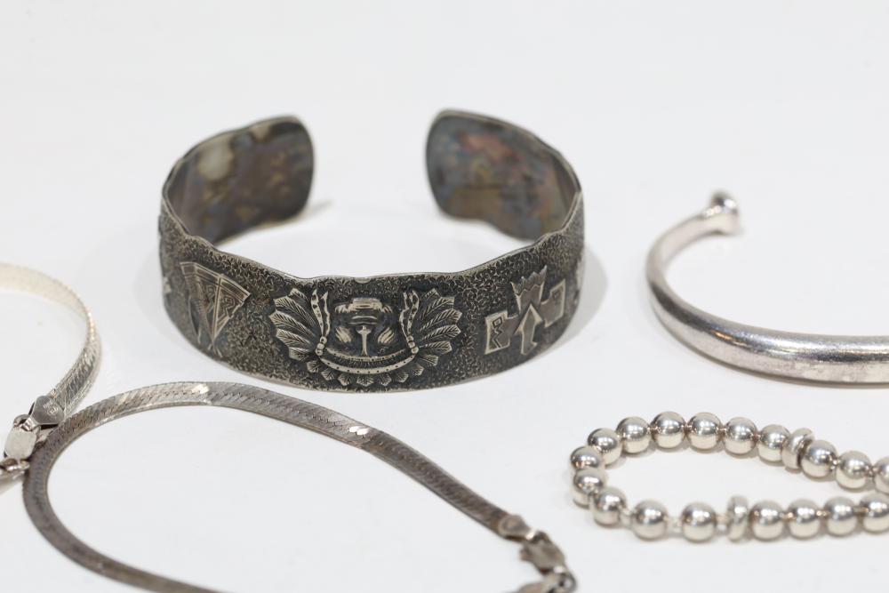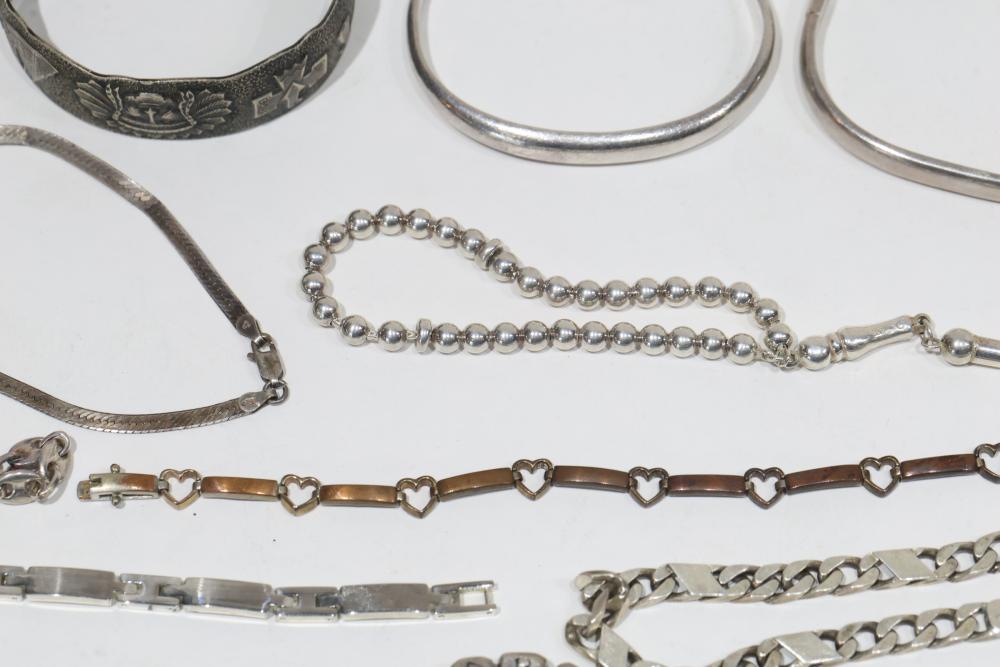 Sterling Silver Jewelry Includes bracelets, necklaces, and bangles, stamped 925. Features a variety of designs including chain links, beadwork, and engraved details. Total weight being 206 grams.