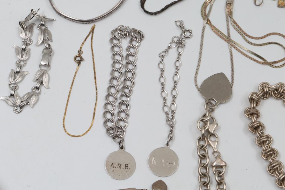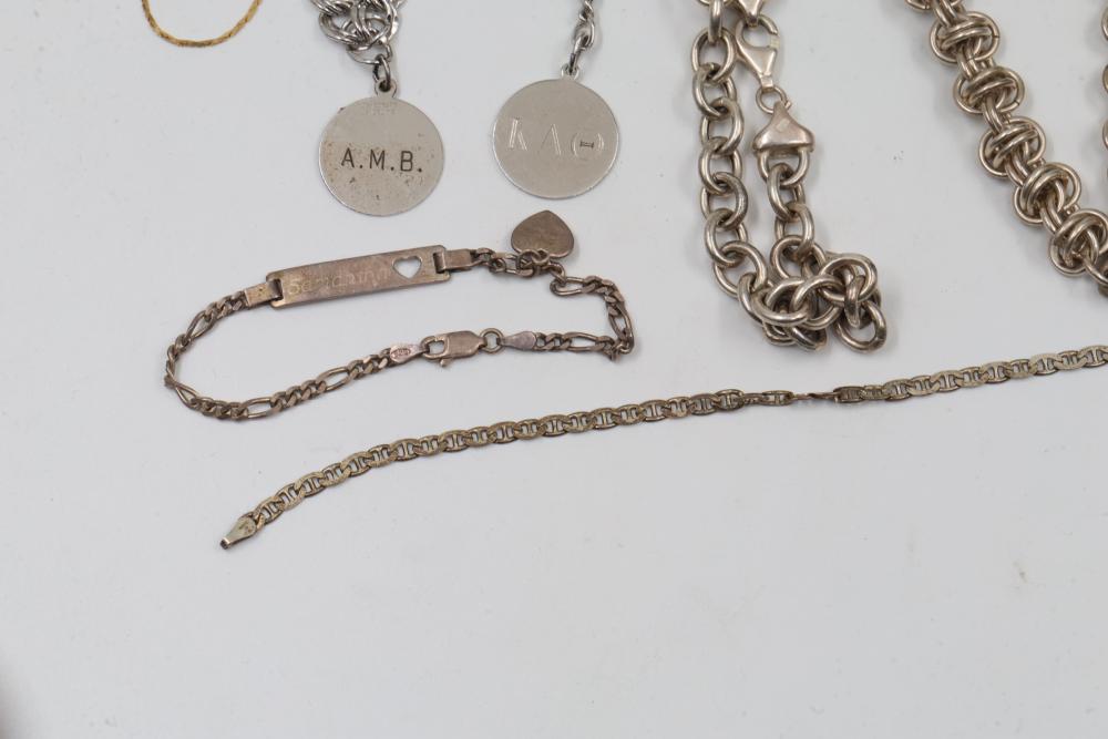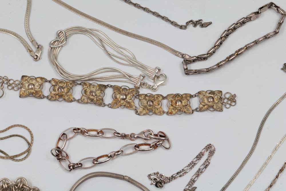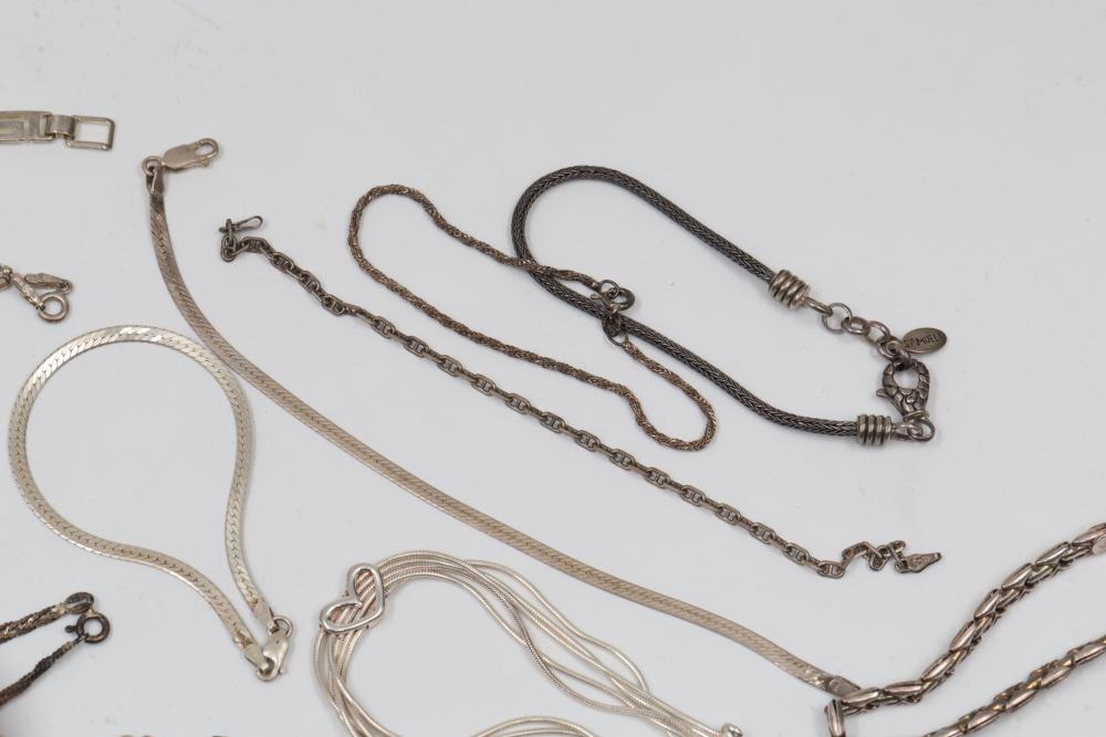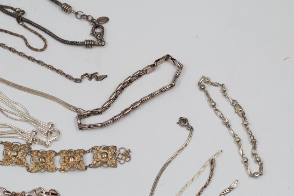 Sterling Silver Jewelry, Including Bracelets and Necklaces. Assortment of jewelry pieces featuring various styles and designs. Includes necklaces, bracelets, and decorative charms. Items are marked with sterling and other hallmarks. Total weight being 211 grams.