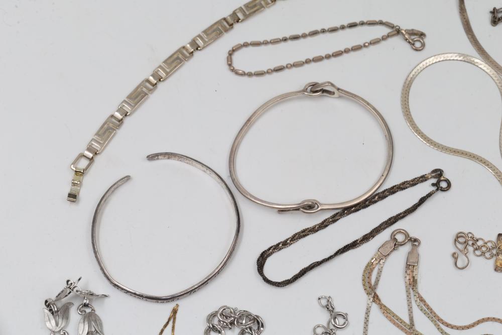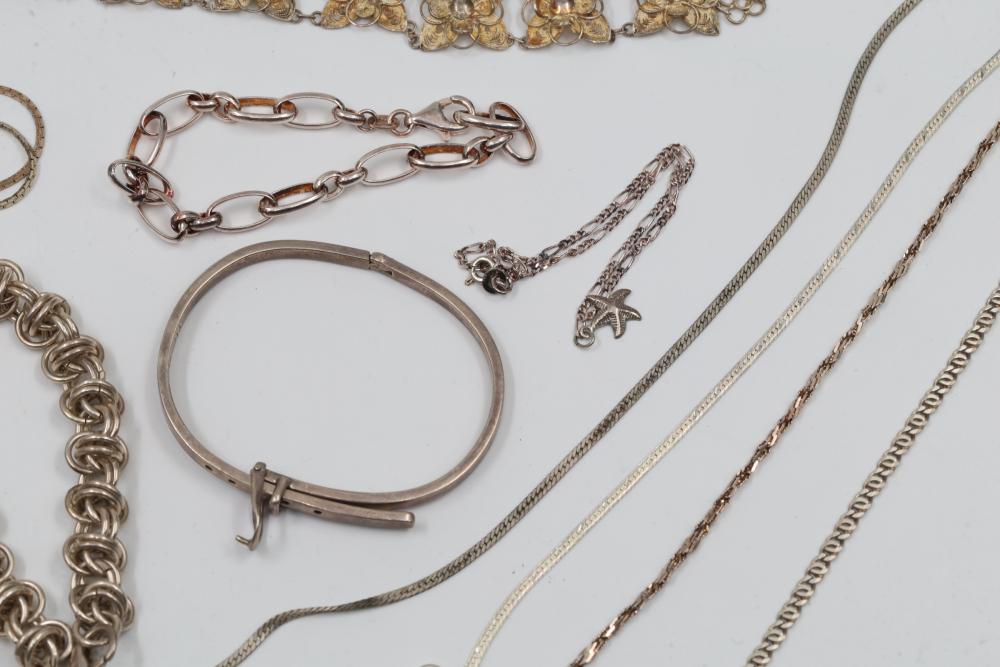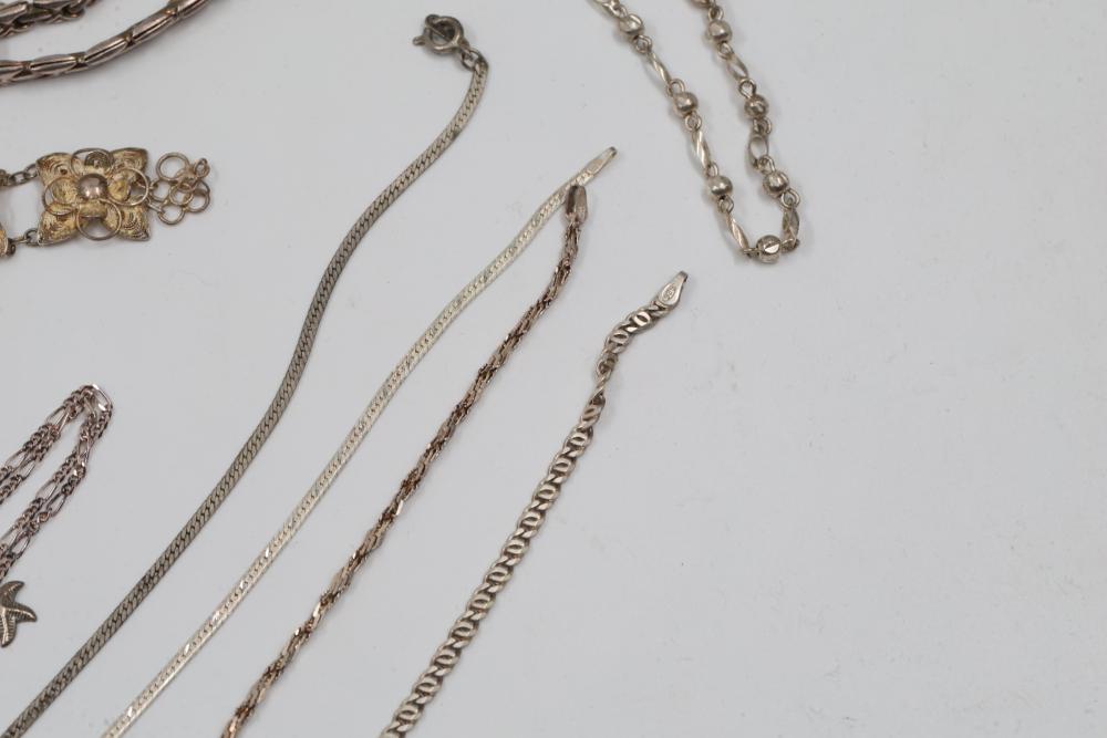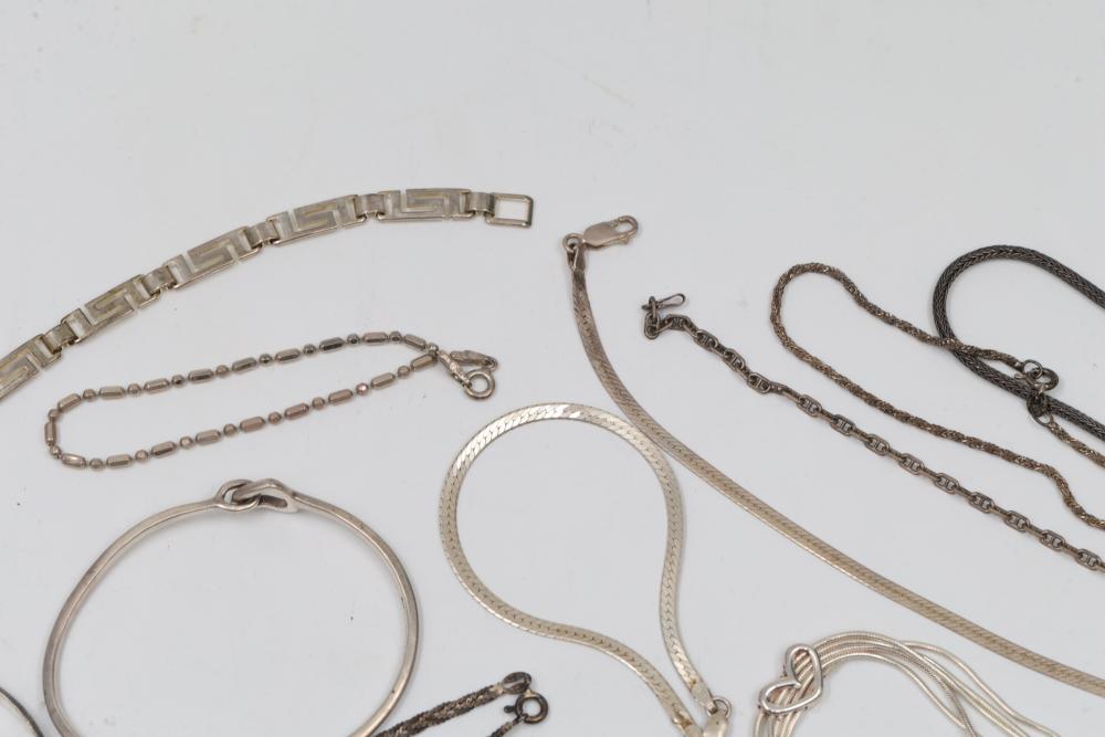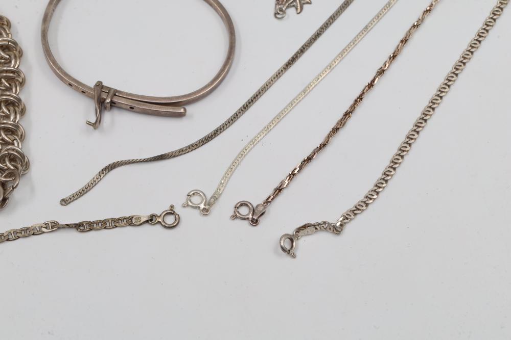 Sterling Silver Jewelry, Including Bracelets and Necklaces. Assortment of jewelry pieces featuring various styles and designs. Includes necklaces, bracelets, and decorative charms. Items are marked with sterling and other hallmarks. Total weight being 211 grams.