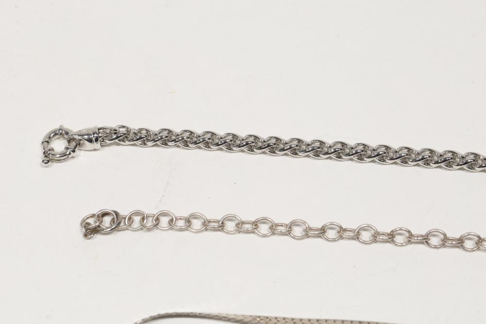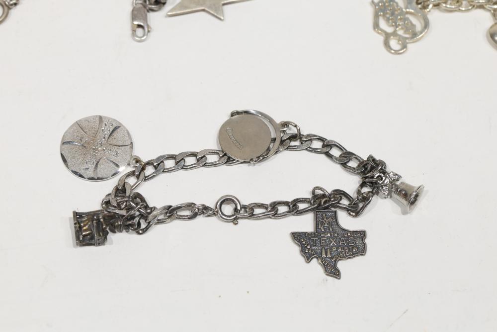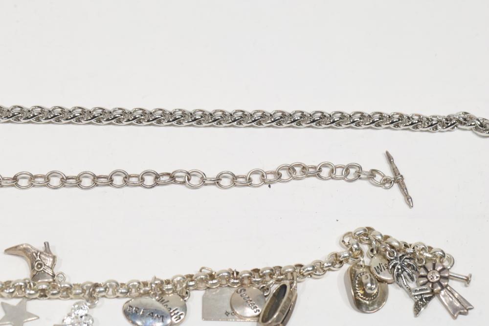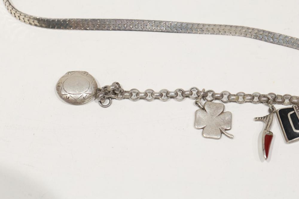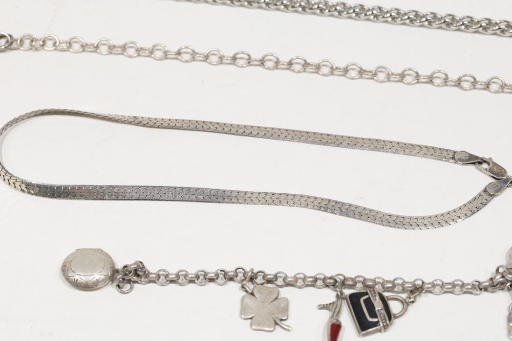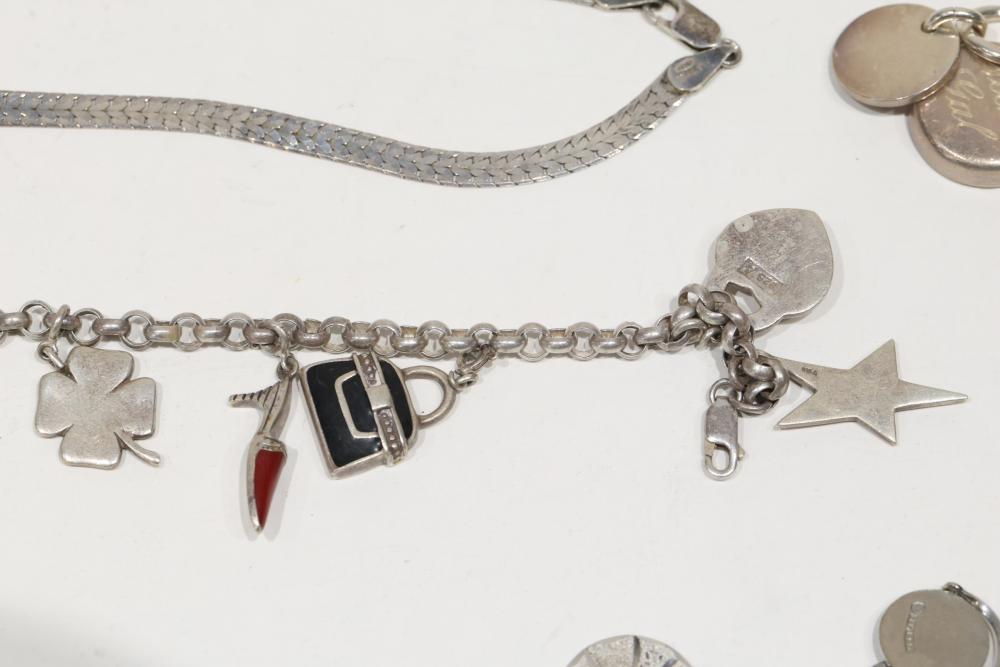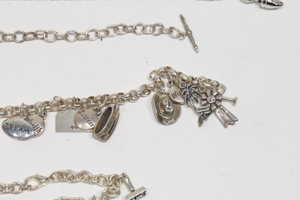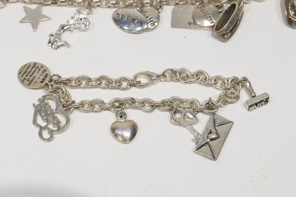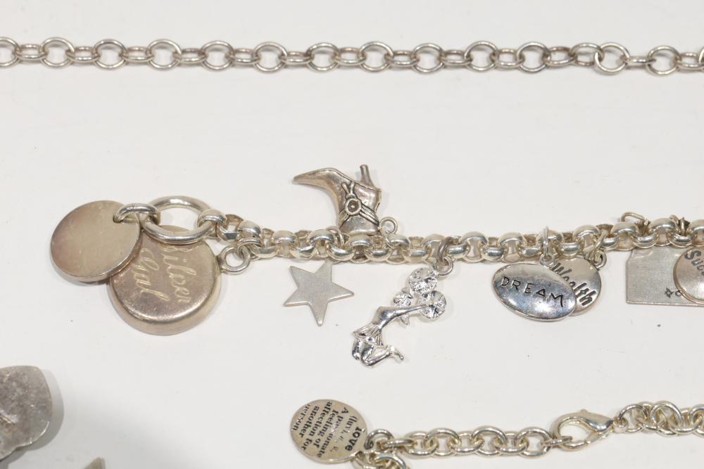 Sterling Silver Bracelets and Necklaces Assortment with Charms. Includes multiple chain link designs and charm bracelets featuring various themed charms, marked as sterling or 925. Total weight being 206 grams.