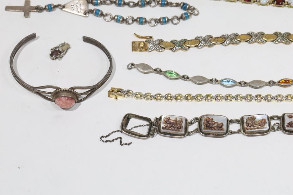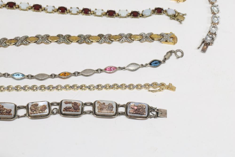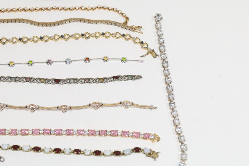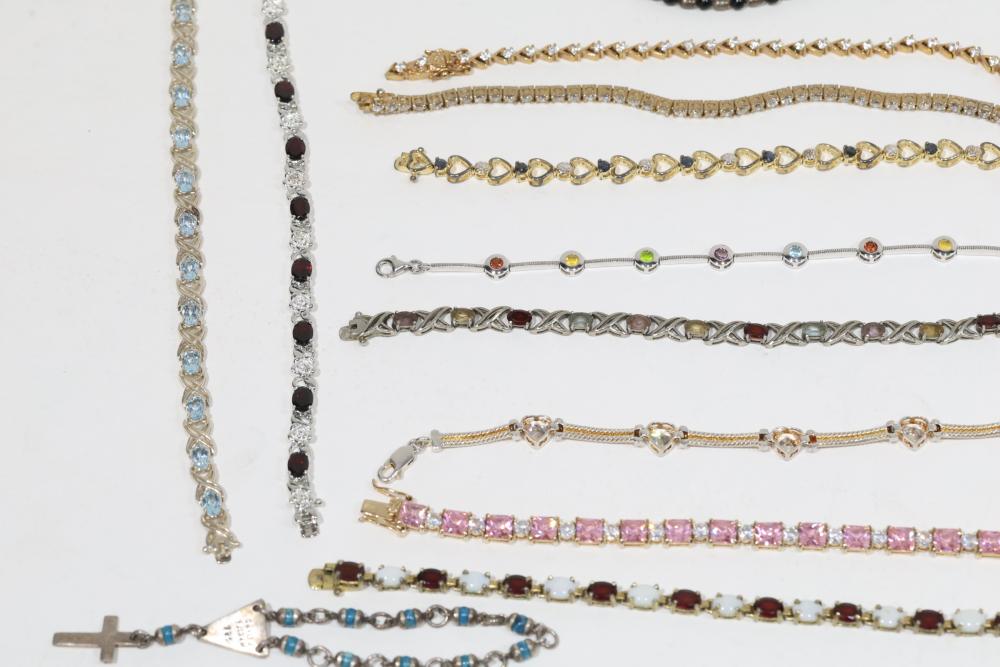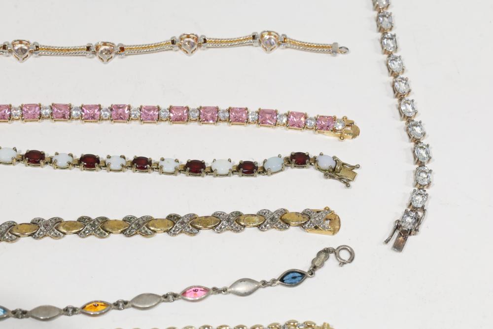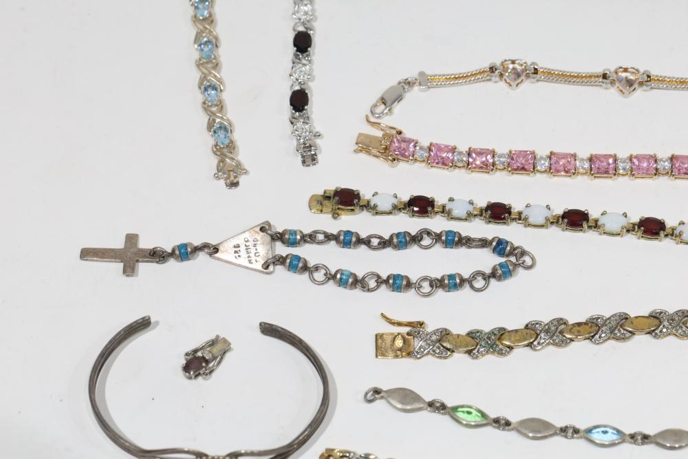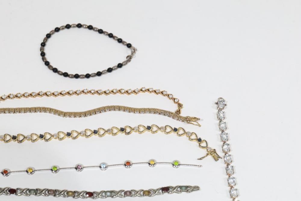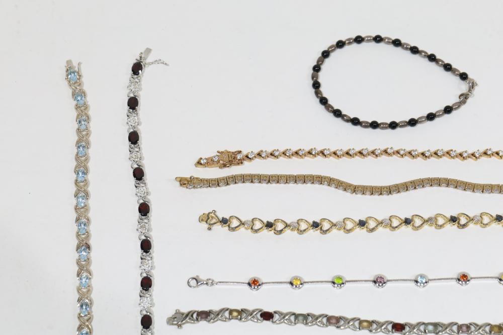 Sterling Silver Bracelets with Various Precious Stones. A collection featuring sterling silver bracelets adorned with various stones including diamonds, aqua, topaz, marked 925. Total weight being 203 grams.