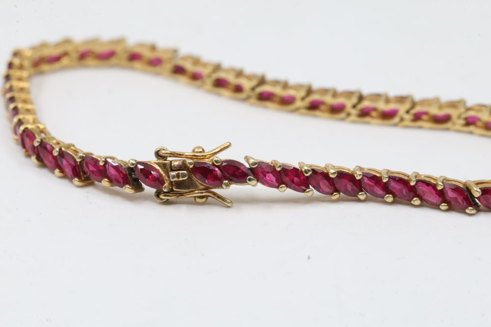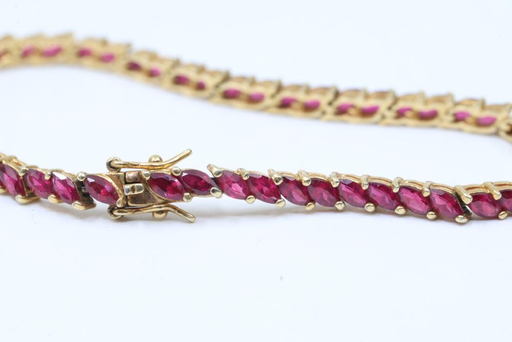 Sterling silver bracelet set with 50 rubies in a vibrant design. The bracelet features a secure clasp and reflective finish, adding a sleek touch to the piece. Each ruby is carefully aligned, enhancing the overall appeal. Total weight being 10 grams.