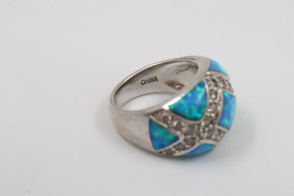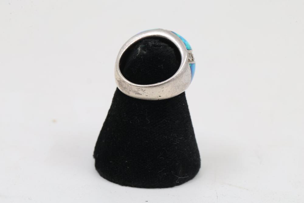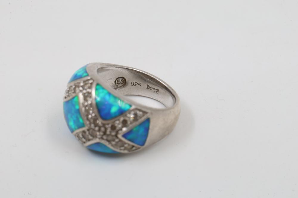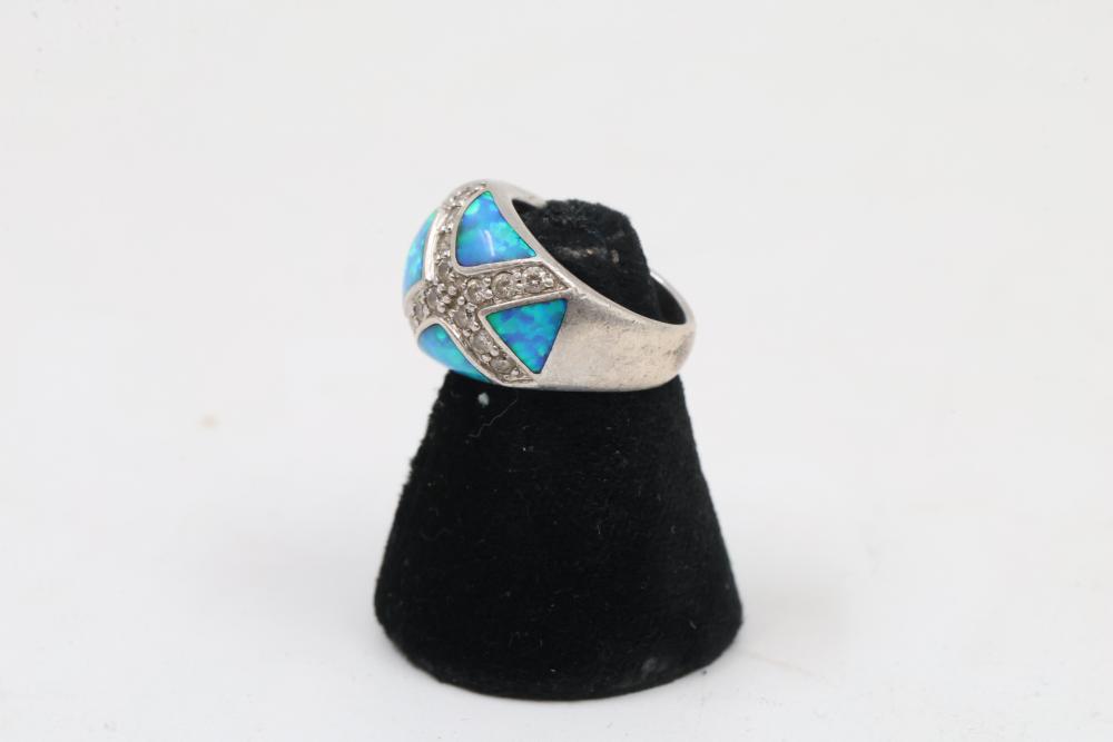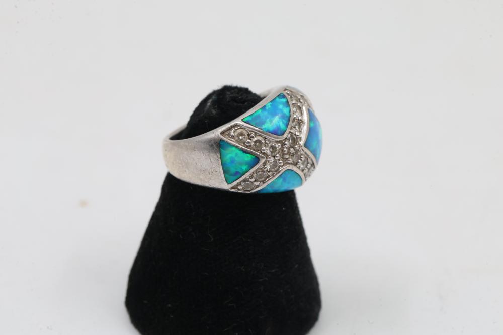 Sterling silver ring featuring blue opal inlays in a geometric motif, complemented by clear stone accents arranged in a cross-shaped design. The interior band is marked "925." Total weight being 7 grams.