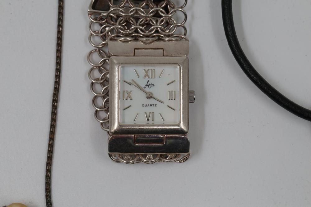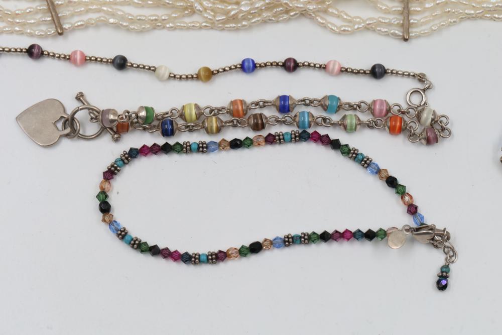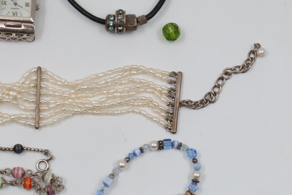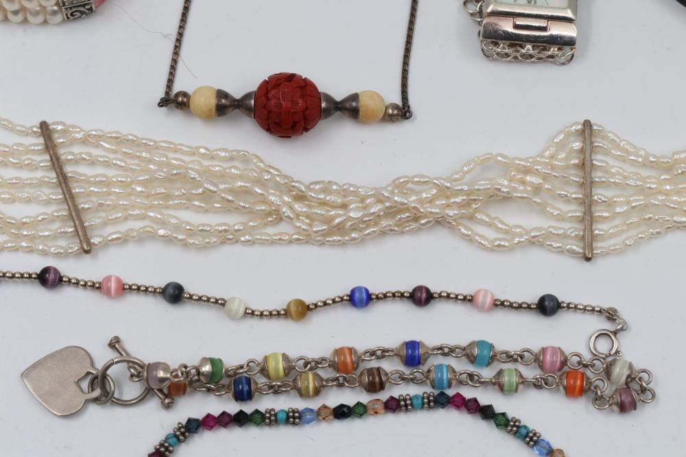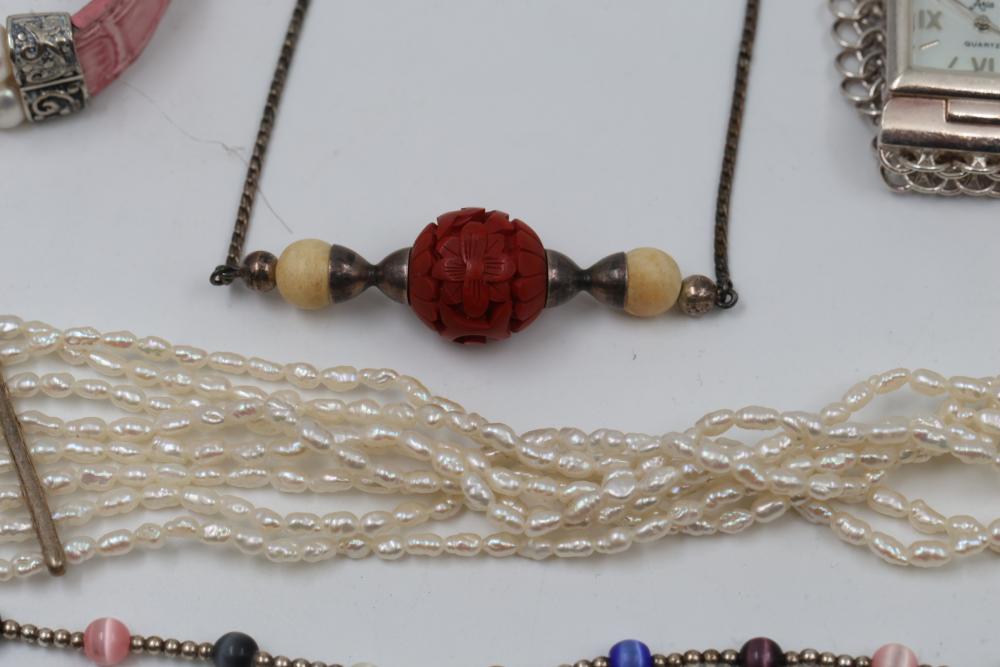 Jewelry pieces including beaded necklaces, pearl and gem bracelets, and a silver-tone quartz watch with Roman numeral markers. Highlights include a red carved bead necklace, pearl-like multi-strand bracelet sets, and colorful bead strands. Includes a black cord bracelet with rhinestone details and a single glass bead. Total weight being 156 grams.