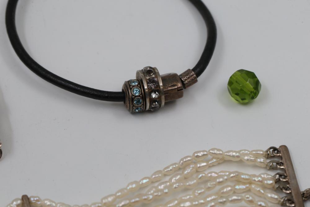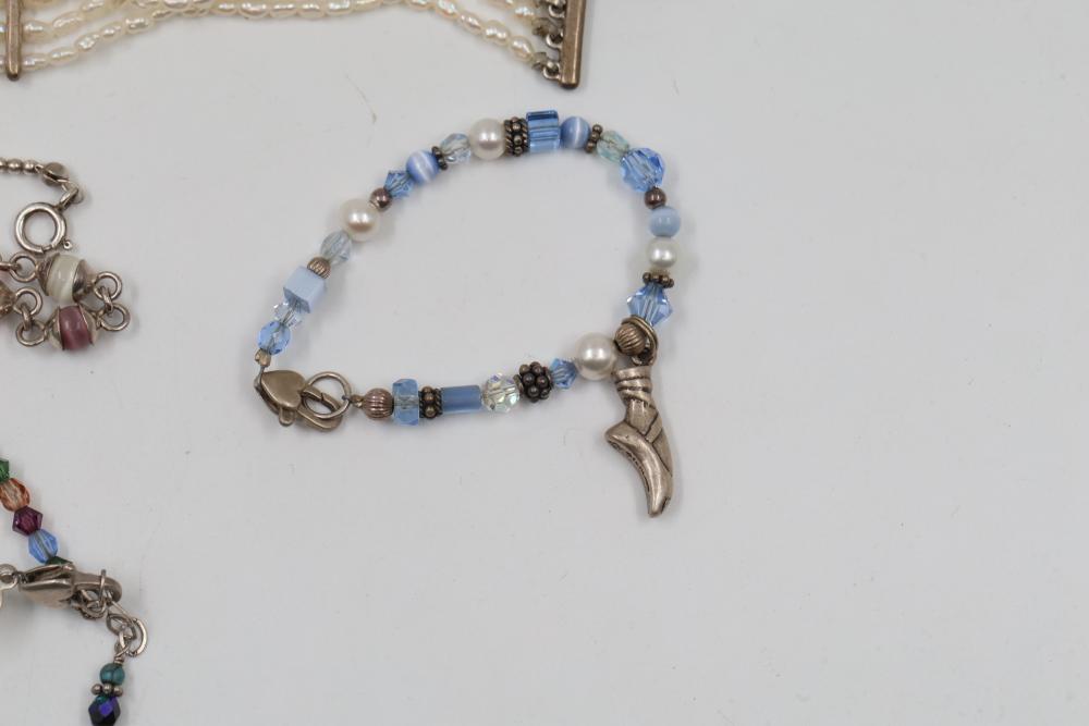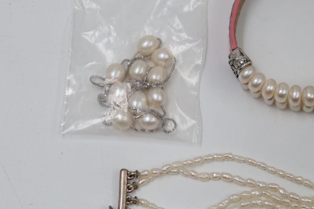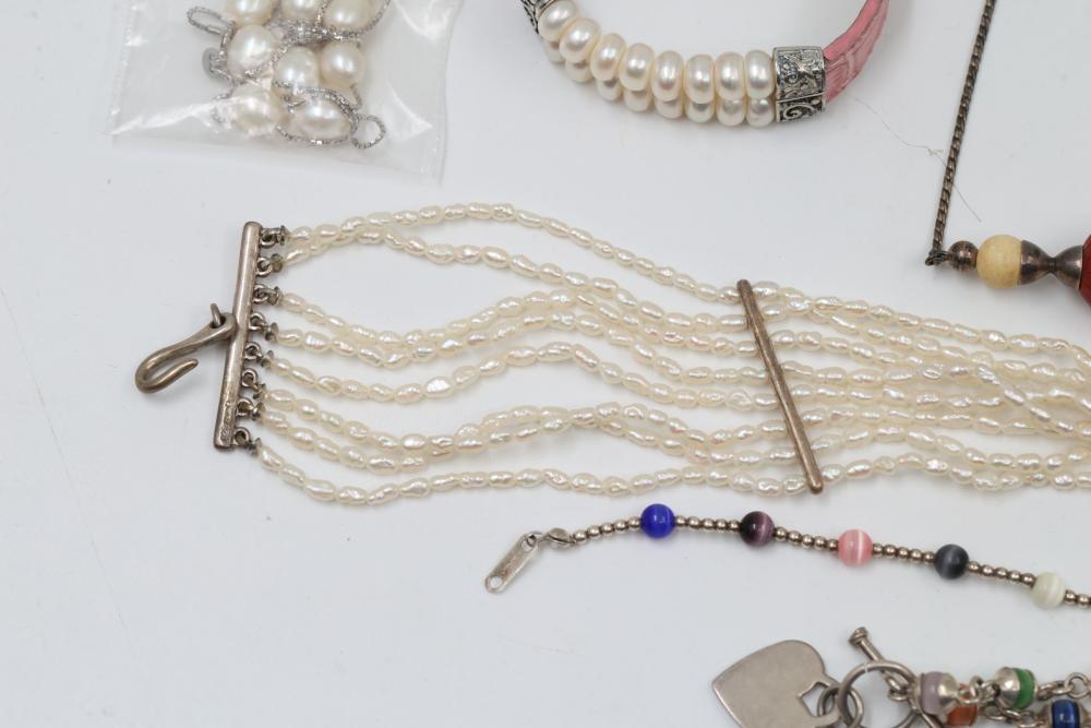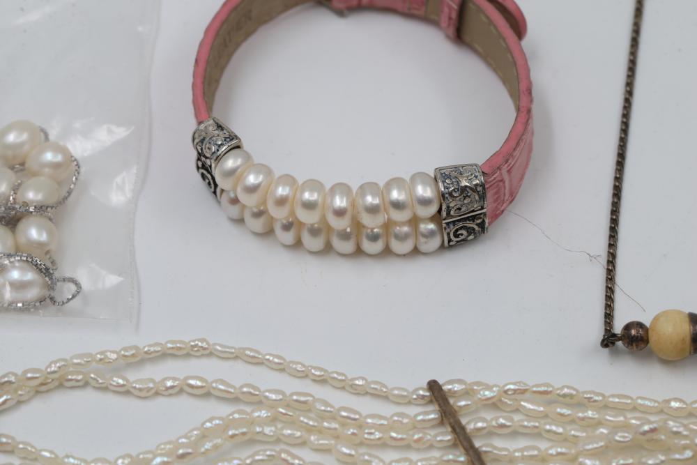 Jewelry pieces including beaded necklaces, pearl and gem bracelets, and a silver-tone quartz watch with Roman numeral markers. Highlights include a red carved bead necklace, pearl-like multi-strand bracelet sets, and colorful bead strands. Includes a black cord bracelet with rhinestone details and a single glass bead. Total weight being 156 grams.