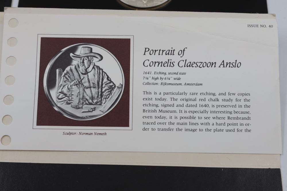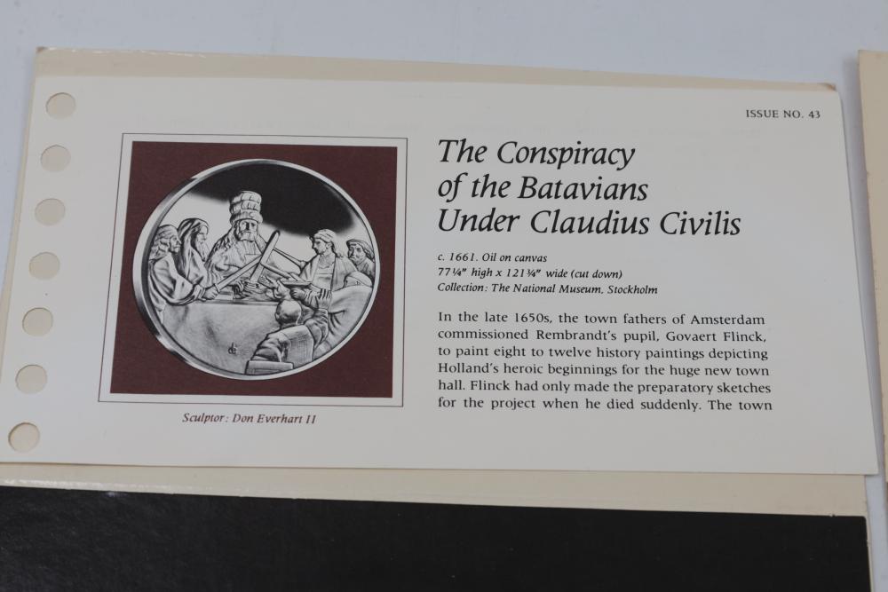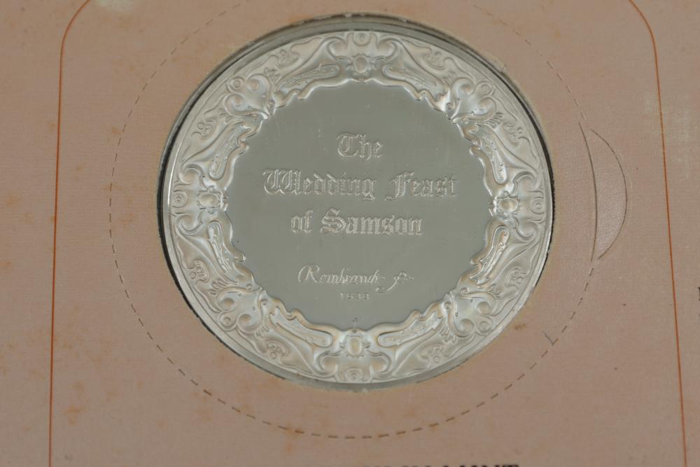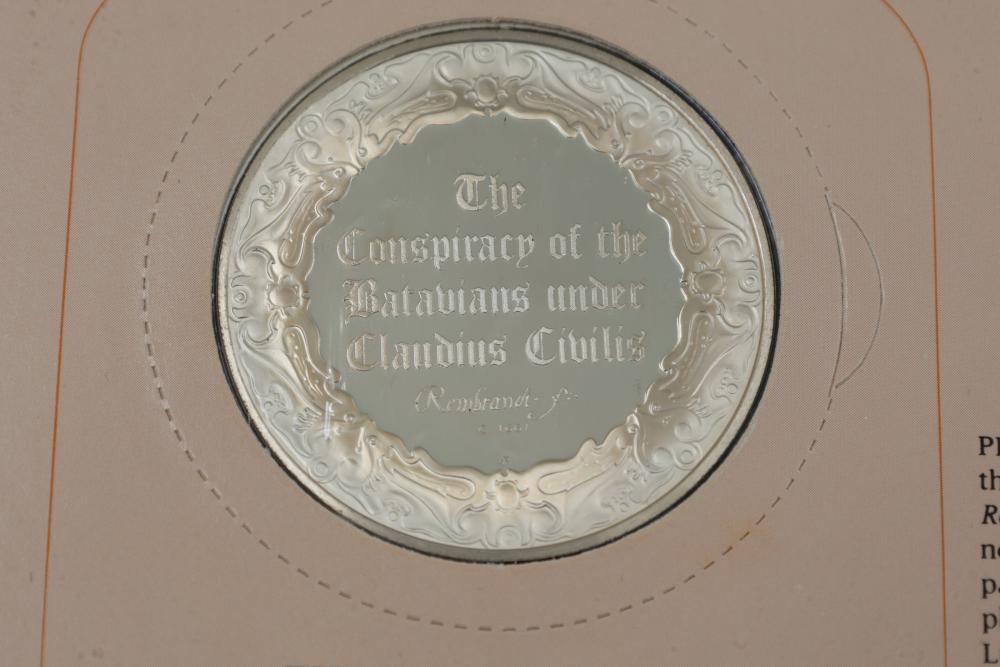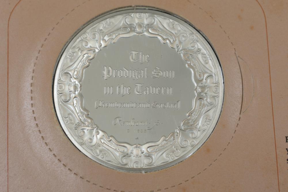 (4) Franklin Mint Sterling Silver medallions featuring detailed engravings inspired by Rembrandt's artwork, including "The Prodigal Son in the Tavern", "Portrait of Cornelis Claesz Anslo", "The Wedding Feast of Samson" and "The Conspiracy of the Batavians Under Claudius Civilis". Includes informational certificates for each piece. Total weight being 264 grams.