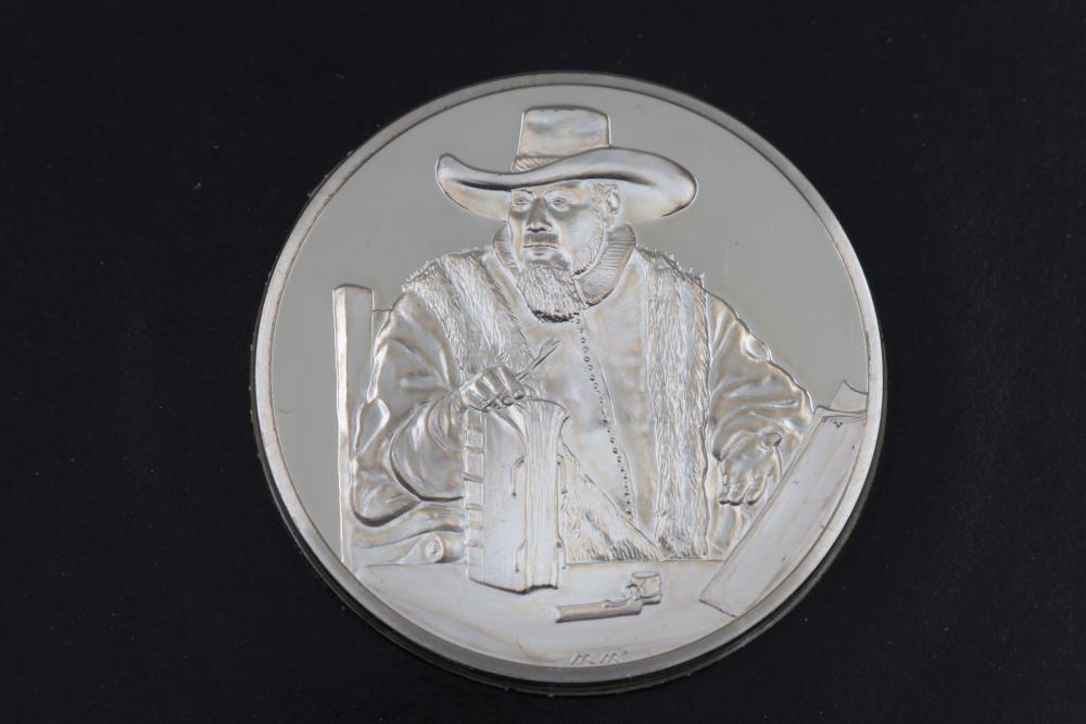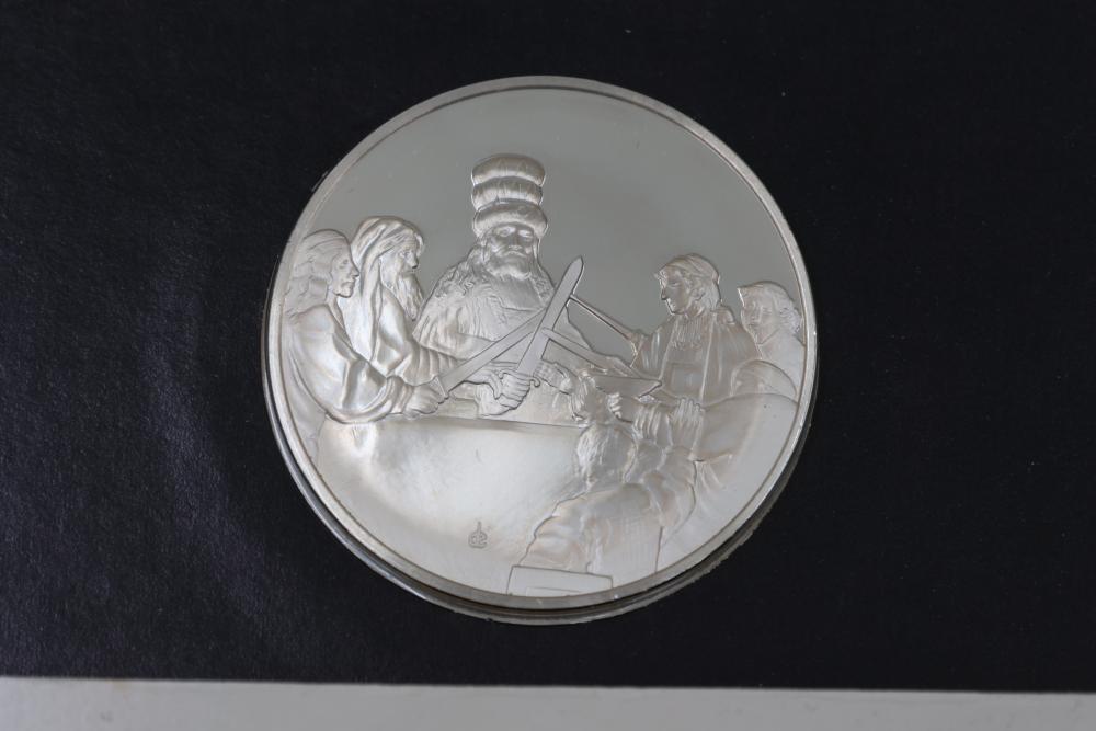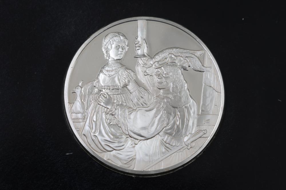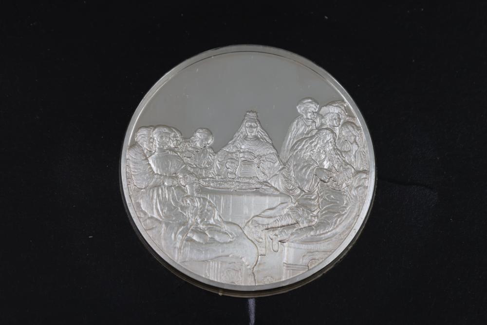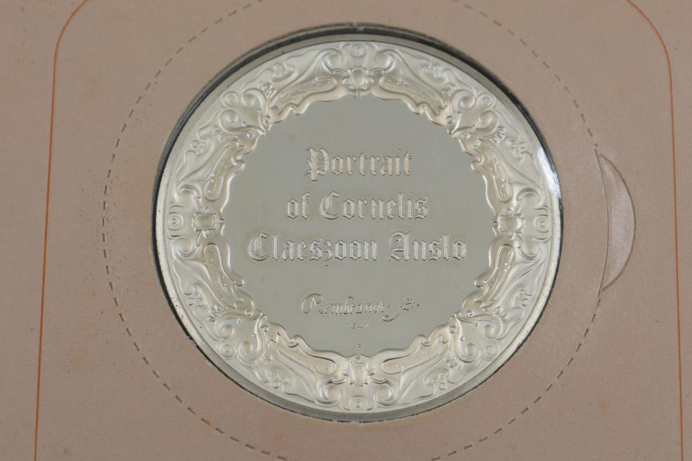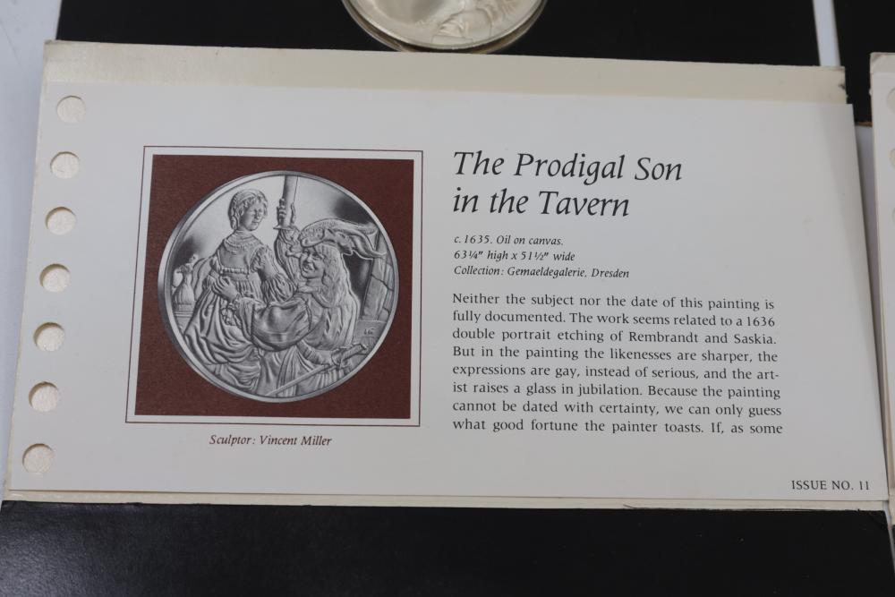 (4) Franklin Mint Sterling Silver medallions featuring detailed engravings inspired by Rembrandt's artwork, including "The Prodigal Son in the Tavern", "Portrait of Cornelis Claesz Anslo", "The Wedding Feast of Samson" and "The Conspiracy of the Batavians Under Claudius Civilis". Includes informational certificates for each piece. Total weight being 264 grams.