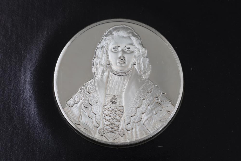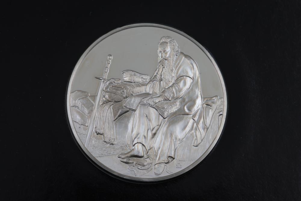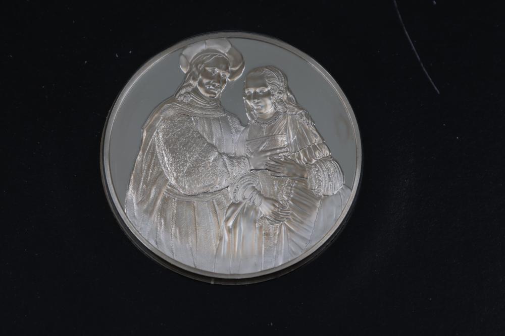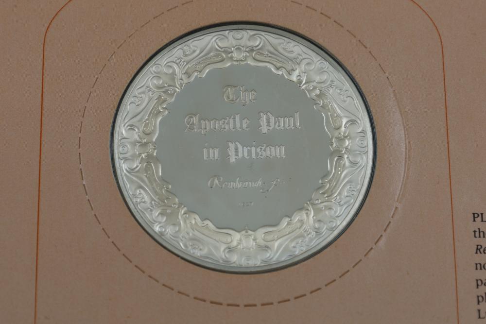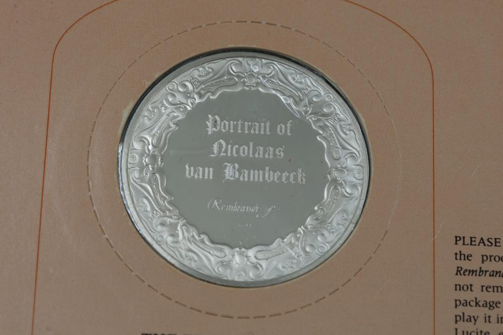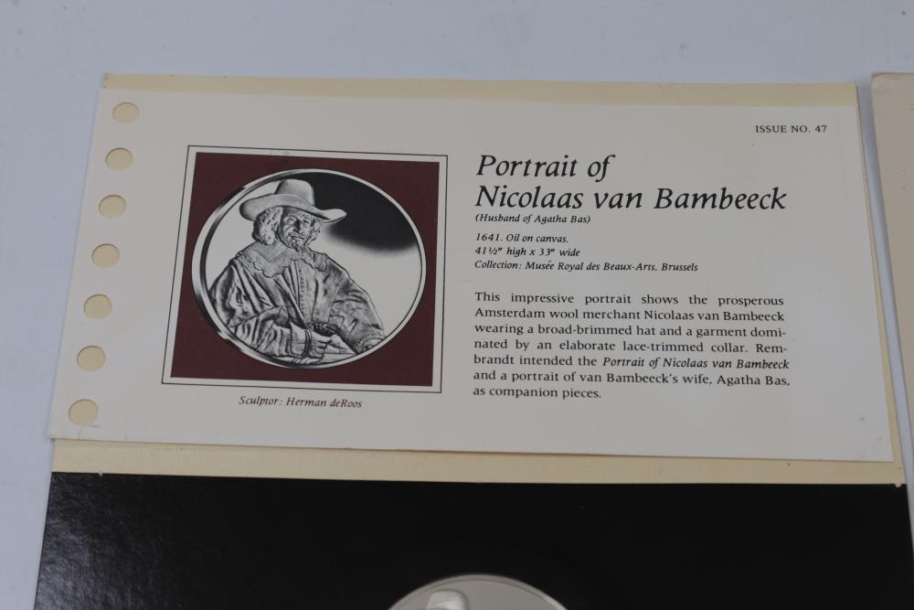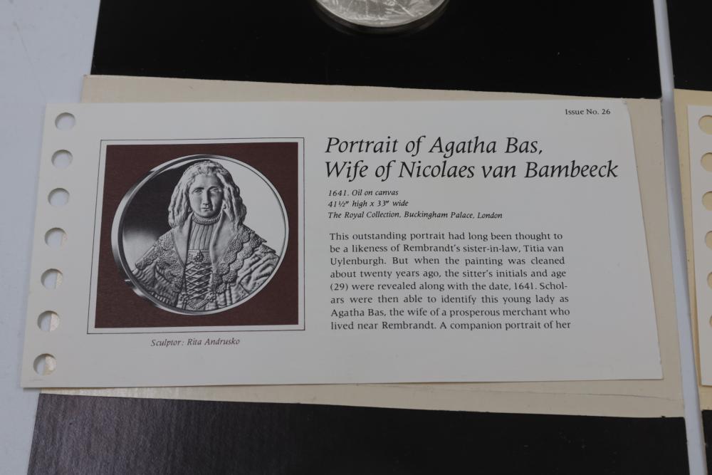 (4) Franklin Mint sterling silver medallions depicting works inspired by Rembrandt, including "Portrait of Nicolaas van Bambeeck", "Portrait of Agatha Bas" and "The Apostle Paul in Prison". Each medallion features etched details with inscriptions on the reverse, presented alongside descriptive inserts. Total weight being 264 grams.