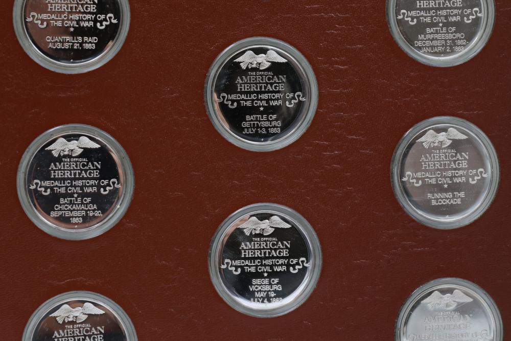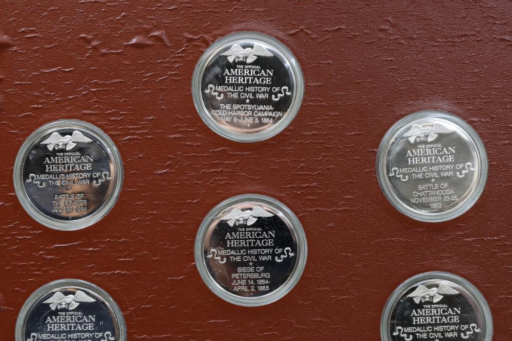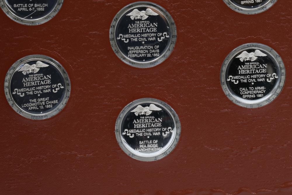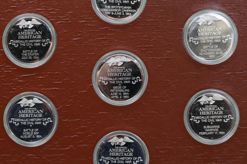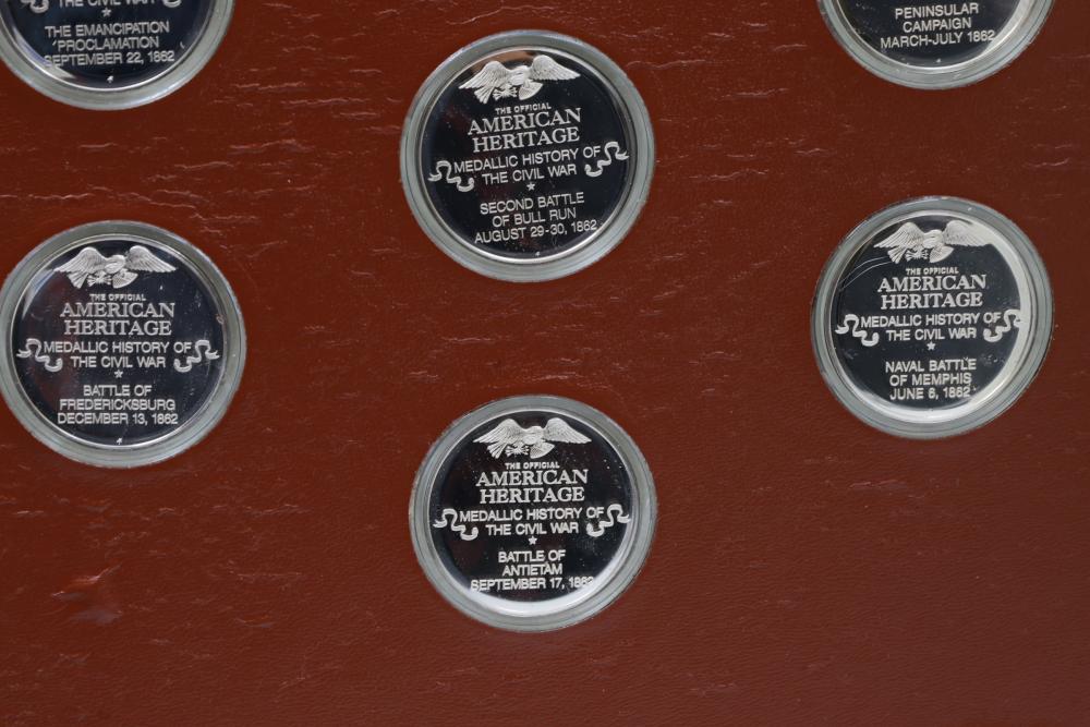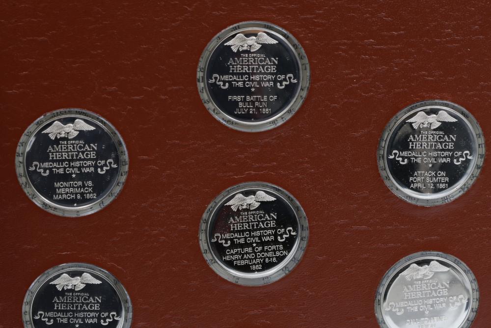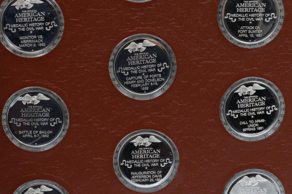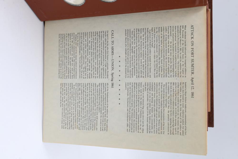 American Heritage "Medallic History of the Civil War" commemorative 50 1oz sterling silver coin set housed in an album with descriptive text. Coins depict significant Civil War events, with titles inscribed, such as the Battle of Shiloh and the First Battle of Bull Run. Includes a brown hard bound album with accompanying historical documentation. Each coin marked Sterling, weighing approx 1 oz, 50 total.