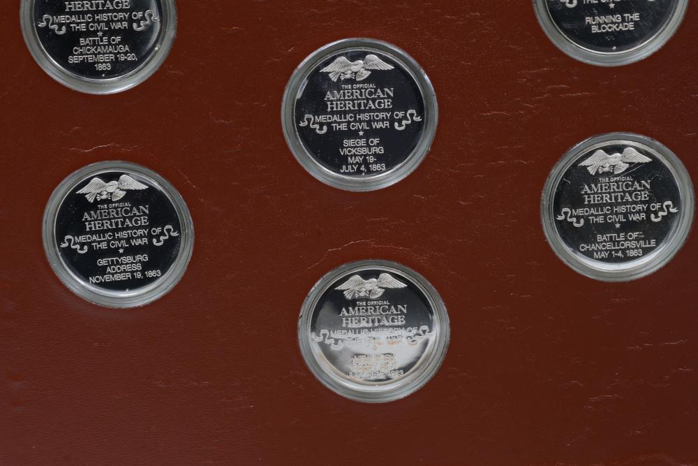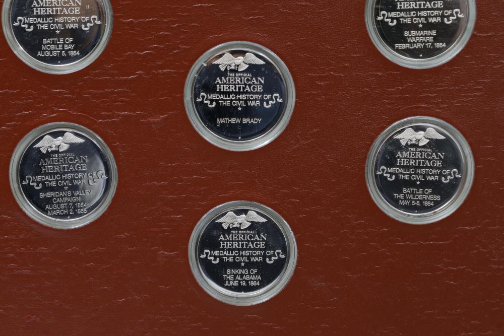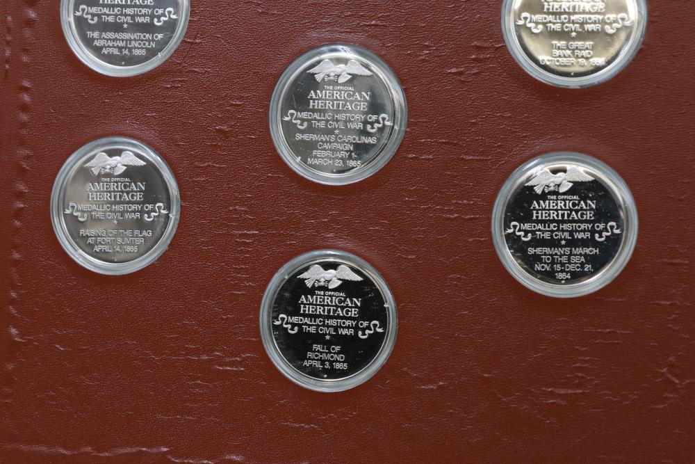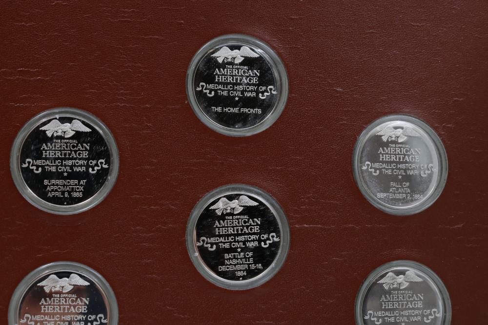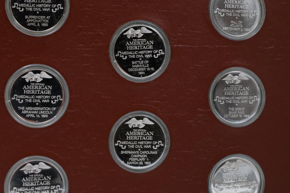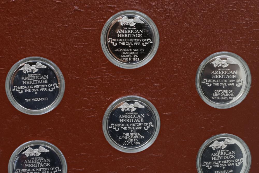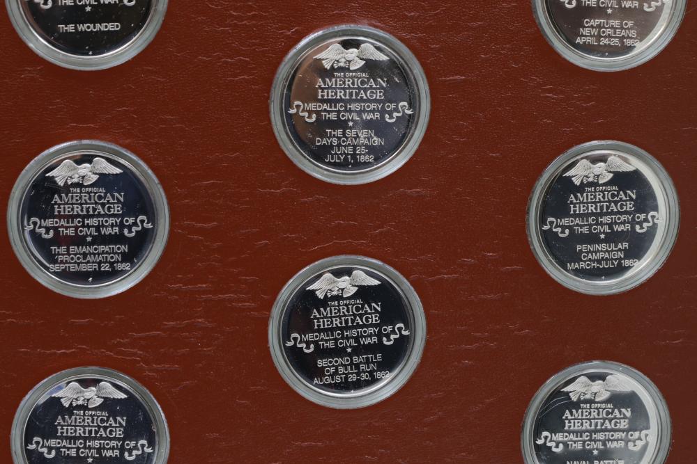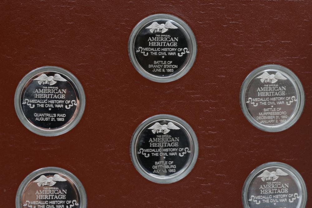 American Heritage "Medallic History of the Civil War" commemorative 50 1oz sterling silver coin set housed in an album with descriptive text. Coins depict significant Civil War events, with titles inscribed, such as the Battle of Shiloh and the First Battle of Bull Run. Includes a brown hard bound album with accompanying historical documentation. Each coin marked Sterling, weighing approx 1 oz, 50 total.