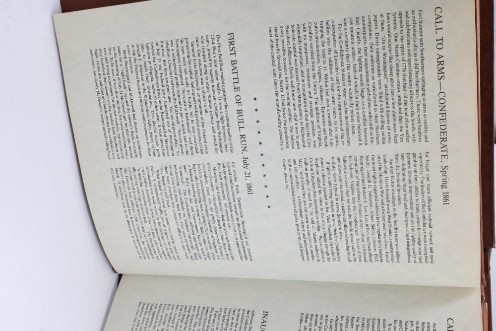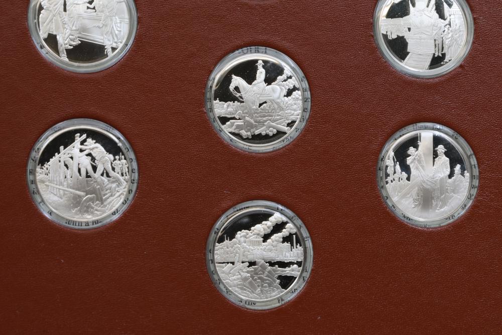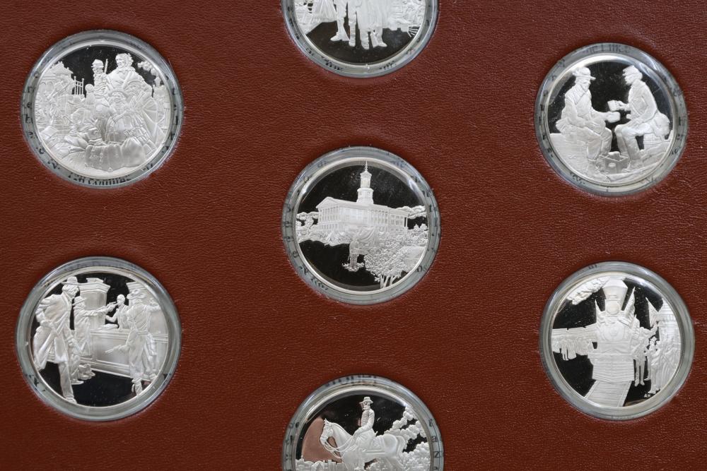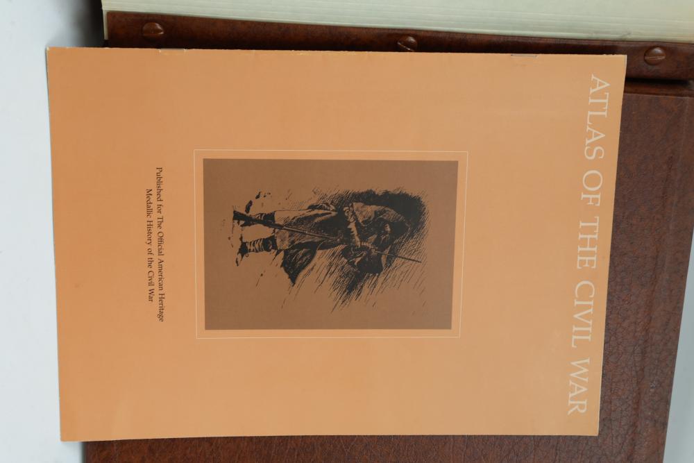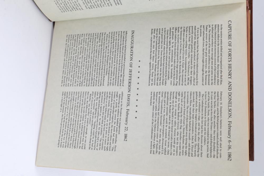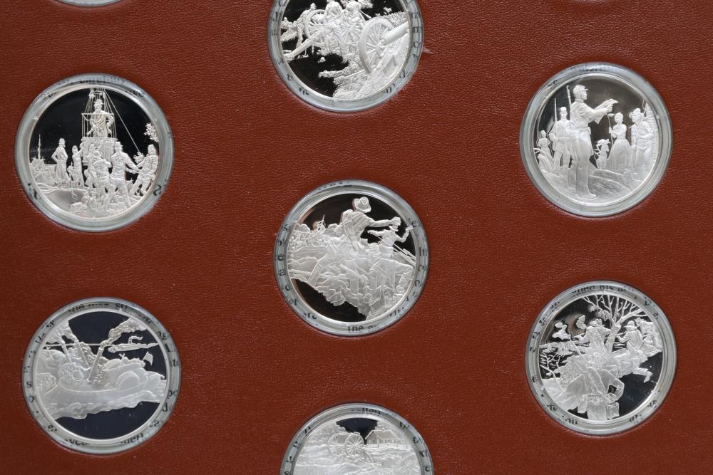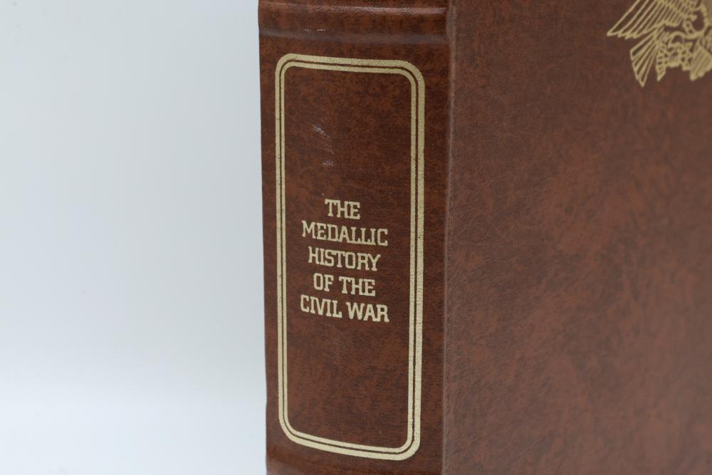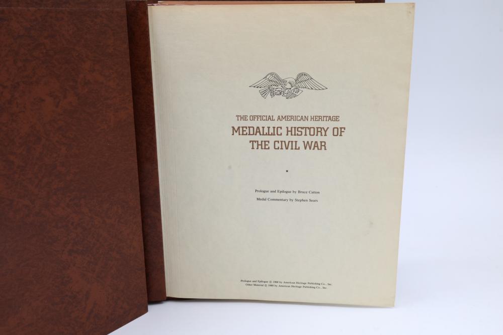 American Heritage "Medallic History of the Civil War" commemorative 50 1oz sterling silver coin set housed in an album with descriptive text. Coins depict significant Civil War events, with titles inscribed, such as the Battle of Shiloh and the First Battle of Bull Run. Includes a brown hard bound album with accompanying historical documentation. Each coin marked Sterling, weighing approx 1 oz, 50 total.