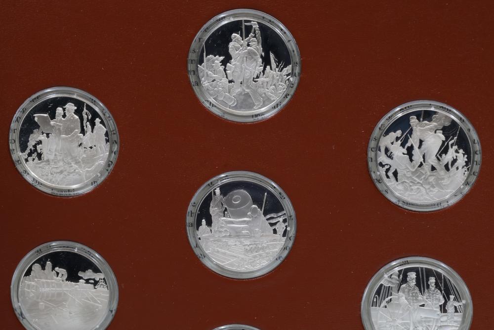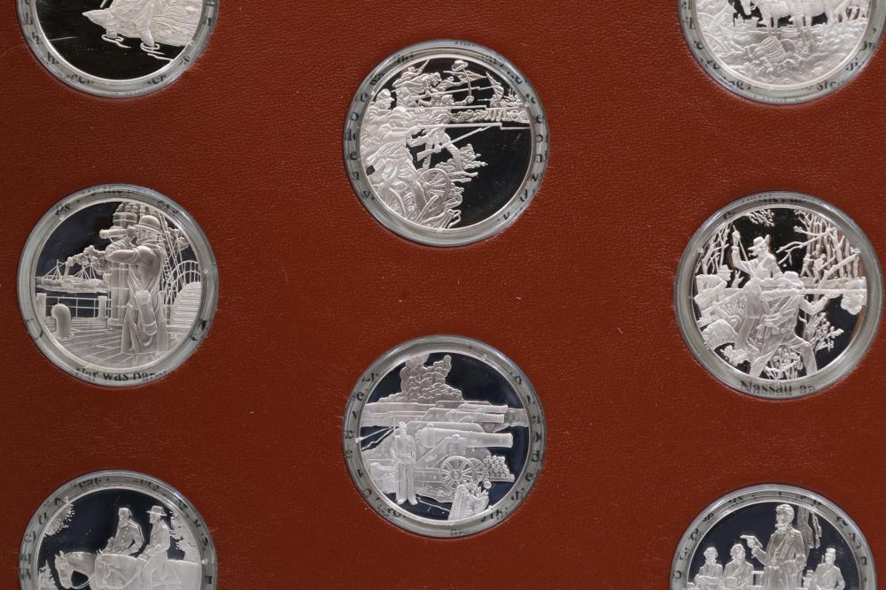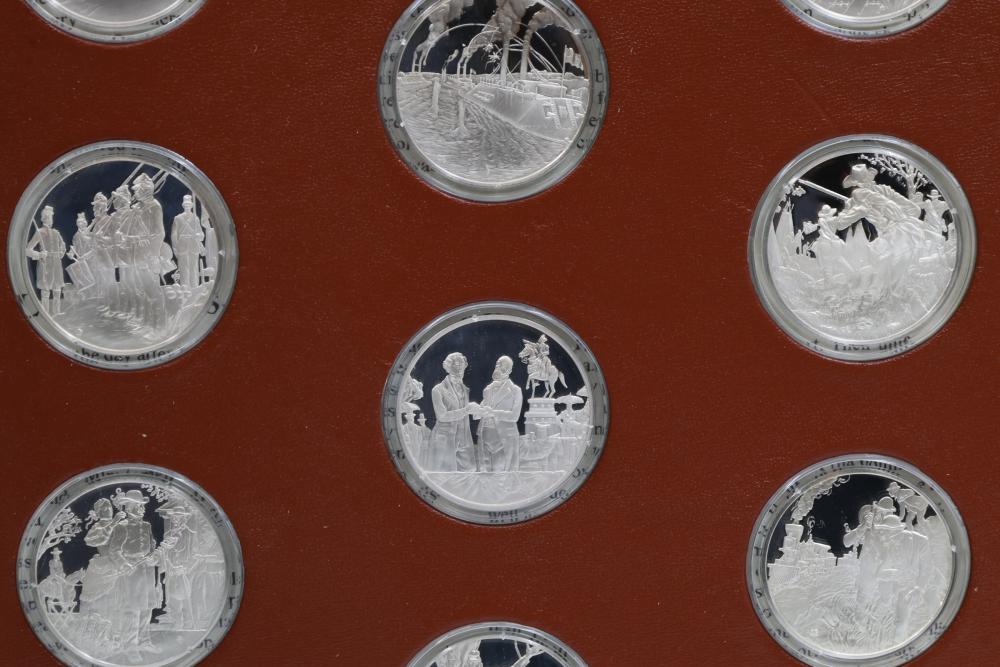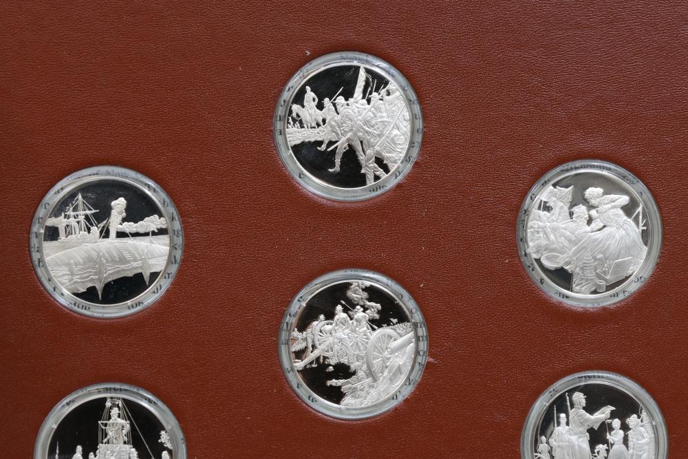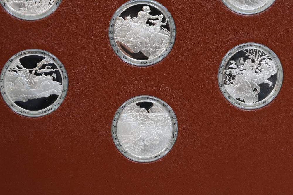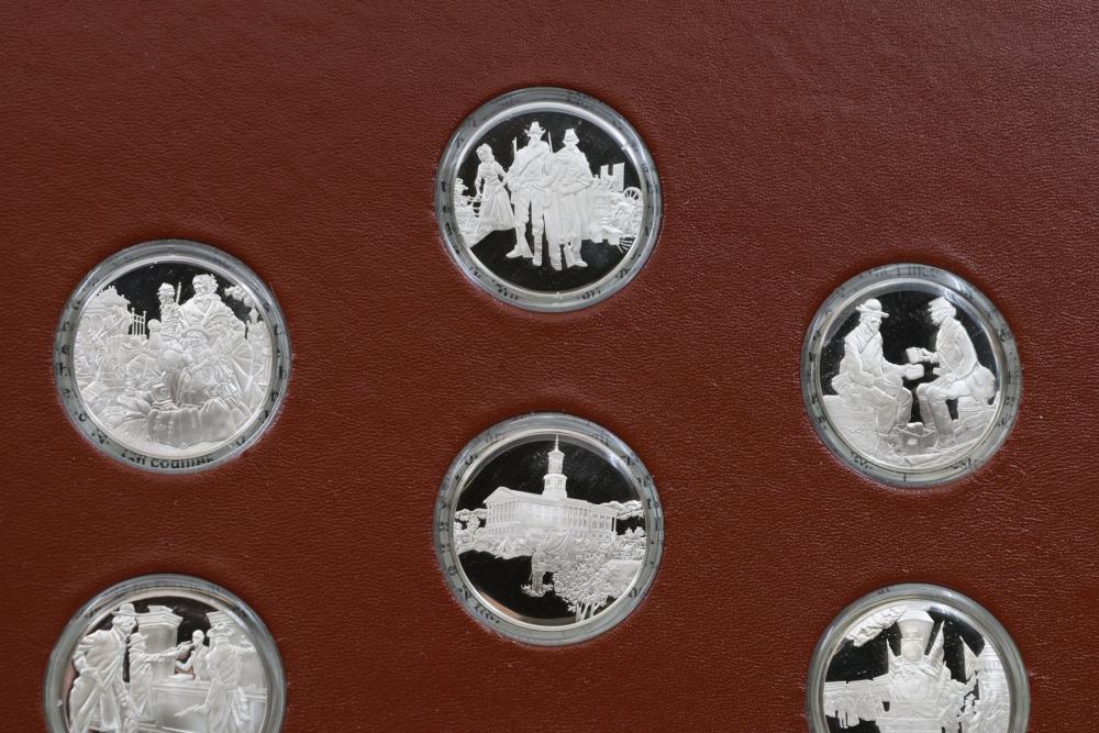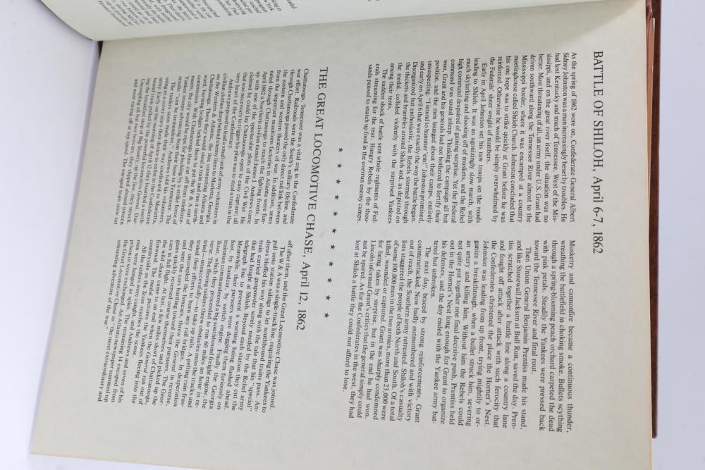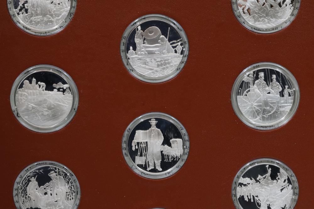 American Heritage "Medallic History of the Civil War" commemorative 50 1oz sterling silver coin set housed in an album with descriptive text. Coins depict significant Civil War events, with titles inscribed, such as the Battle of Shiloh and the First Battle of Bull Run. Includes a brown hard bound album with accompanying historical documentation. Each coin marked Sterling, weighing approx 1 oz, 50 total.