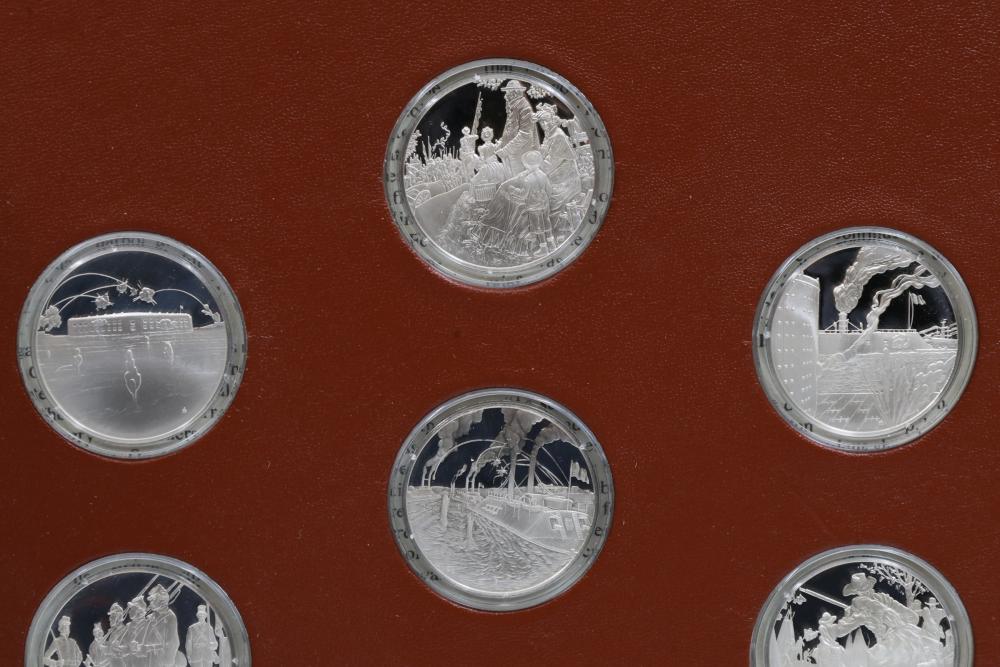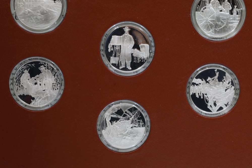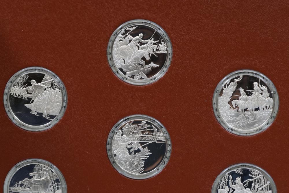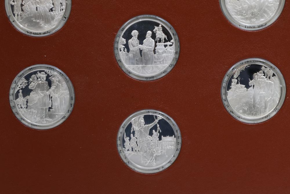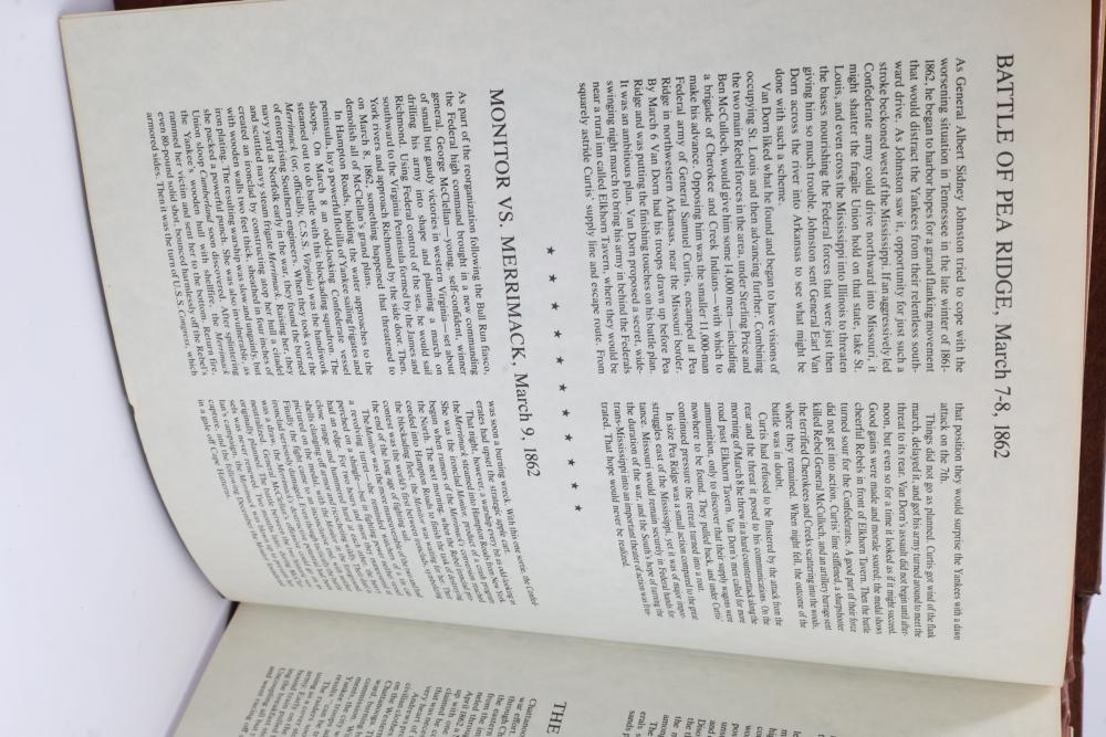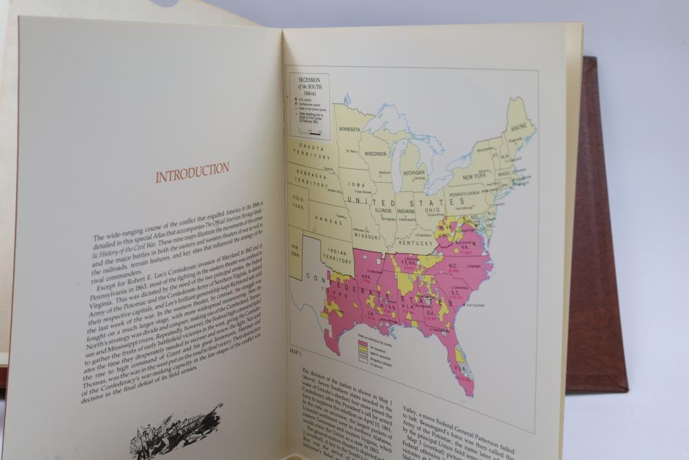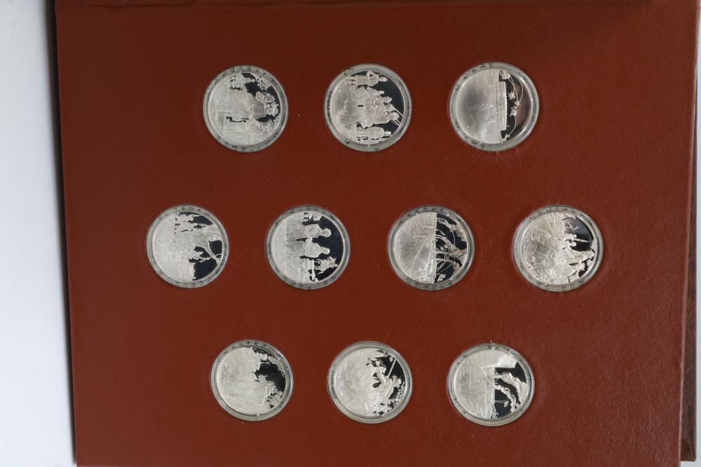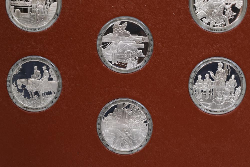 American Heritage "Medallic History of the Civil War" commemorative 50 1oz sterling silver coin set housed in an album with descriptive text. Coins depict significant Civil War events, with titles inscribed, such as the Battle of Shiloh and the First Battle of Bull Run. Includes a brown hard bound album with accompanying historical documentation. Each coin marked Sterling, weighing approx 1 oz, 50 total.