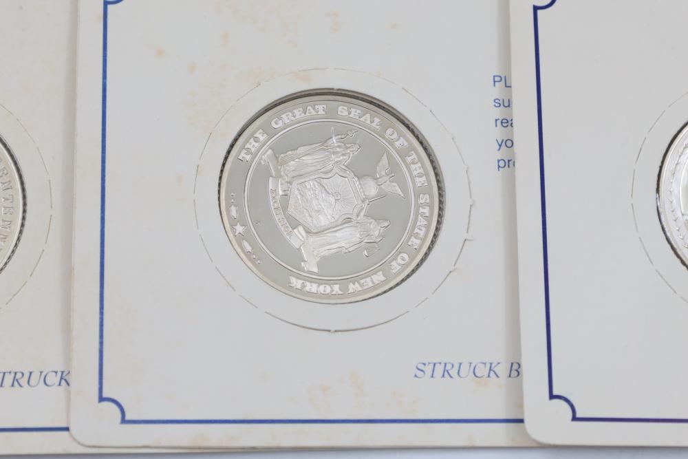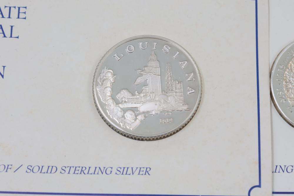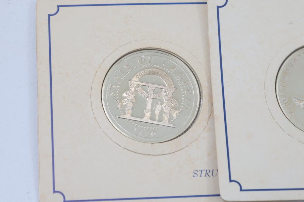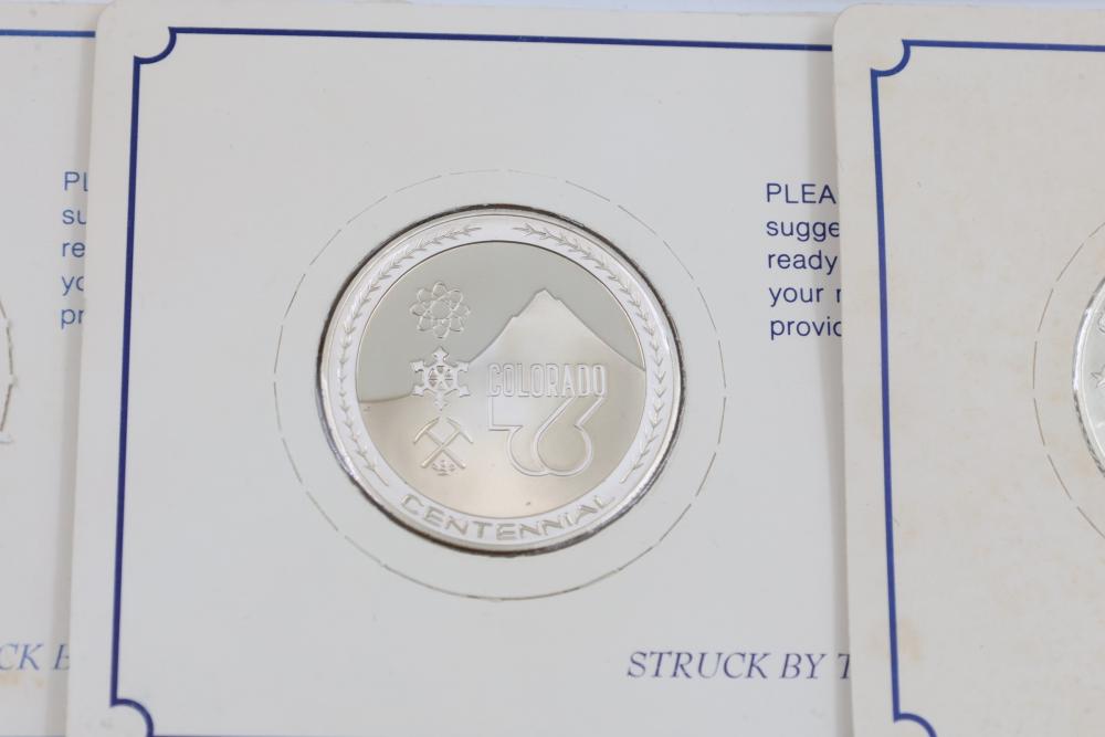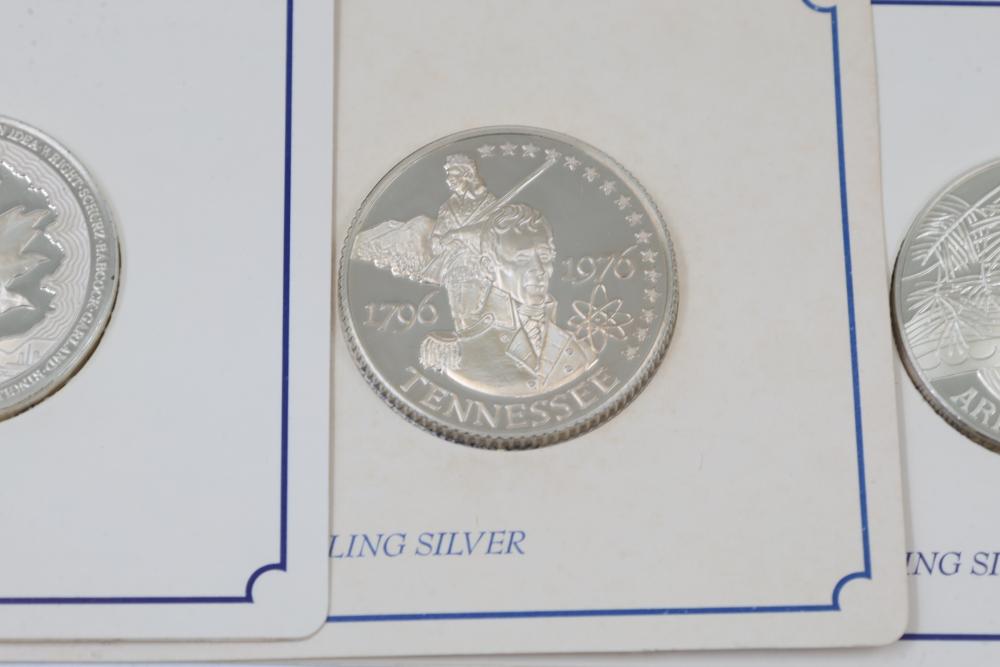 (10) Solid sterling silver bicentennial proof medals featuring detailed designs representing various states. Medals are housed in protective holders labeled with state names and include intricate depictions of each state's historical or cultural symbols. 10 coins total. Total weight 288 grams. Each coin weighs approximately 32 grams.