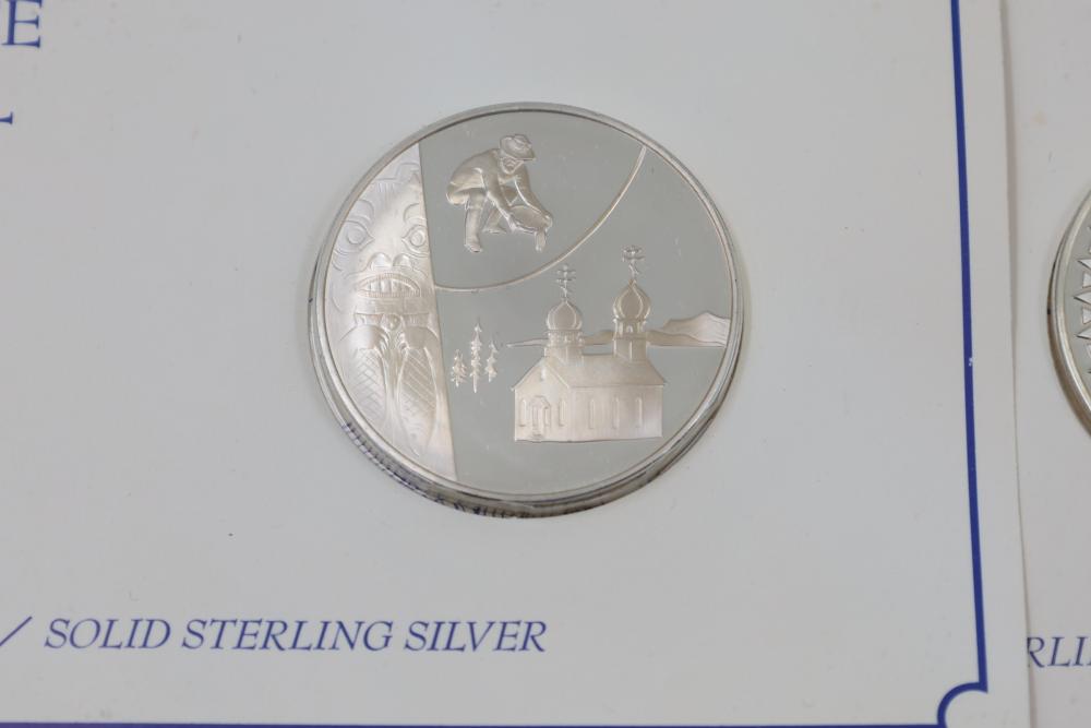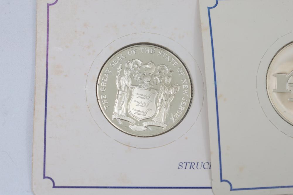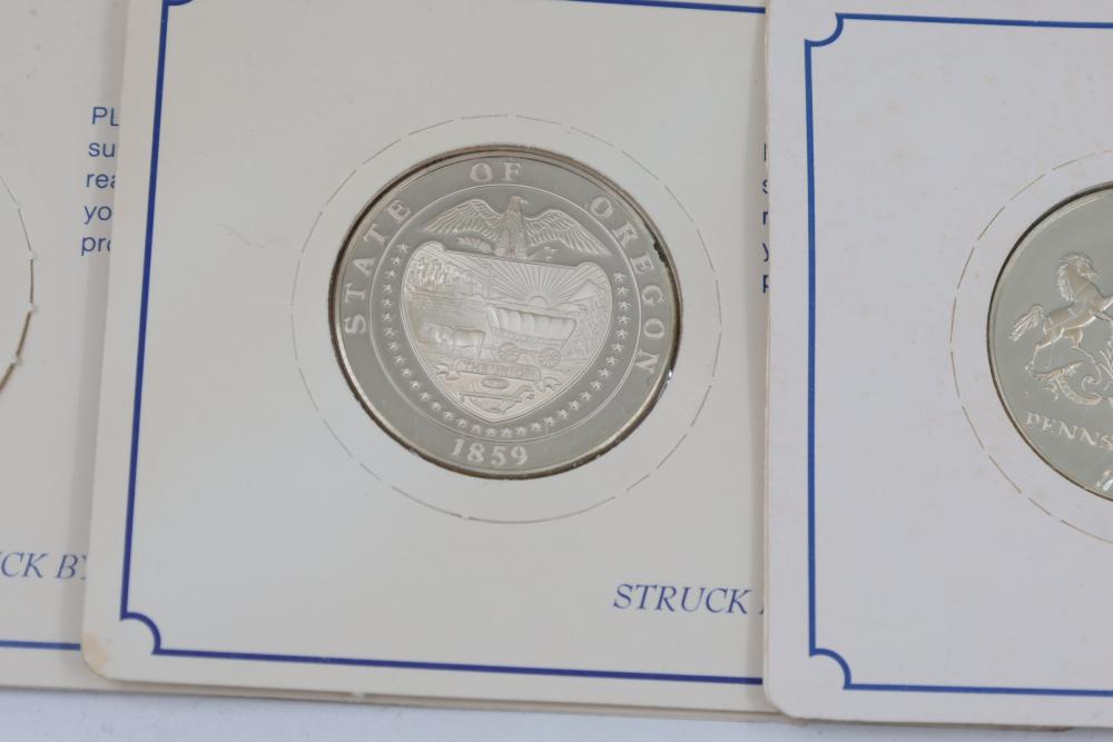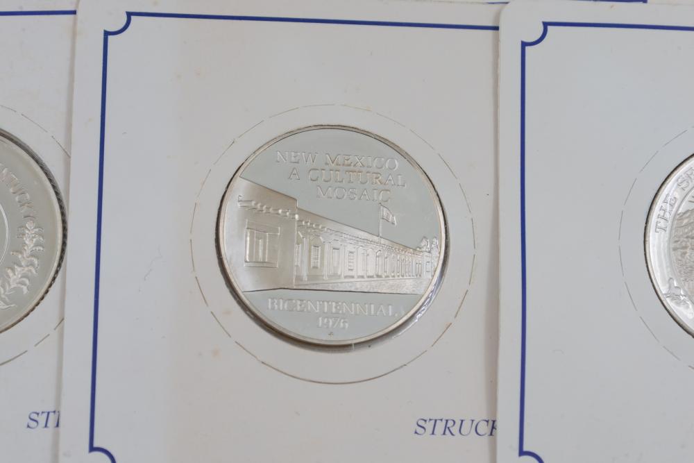 (10) Fifty Sterling Silver Bicentennial Medals. Each medal represents a U.S. state and is struck in solid sterling silver. The set is mounted in presentation cards. 10 coins total. Total weight being 320 grams. Each coin weighs approximately 32 grams.