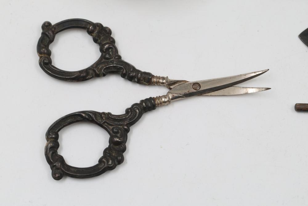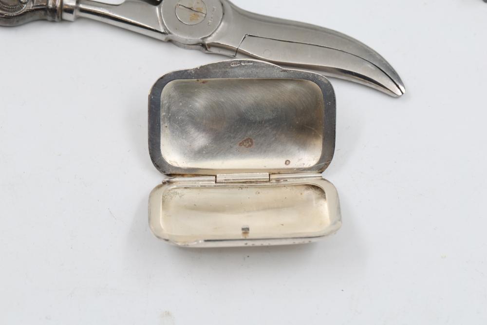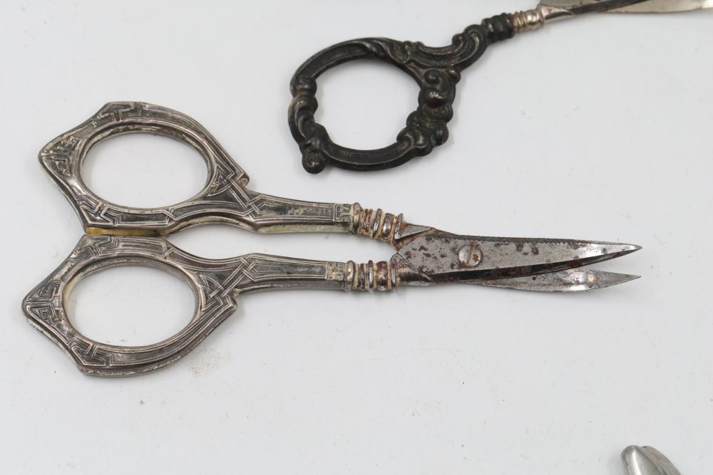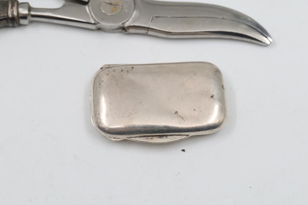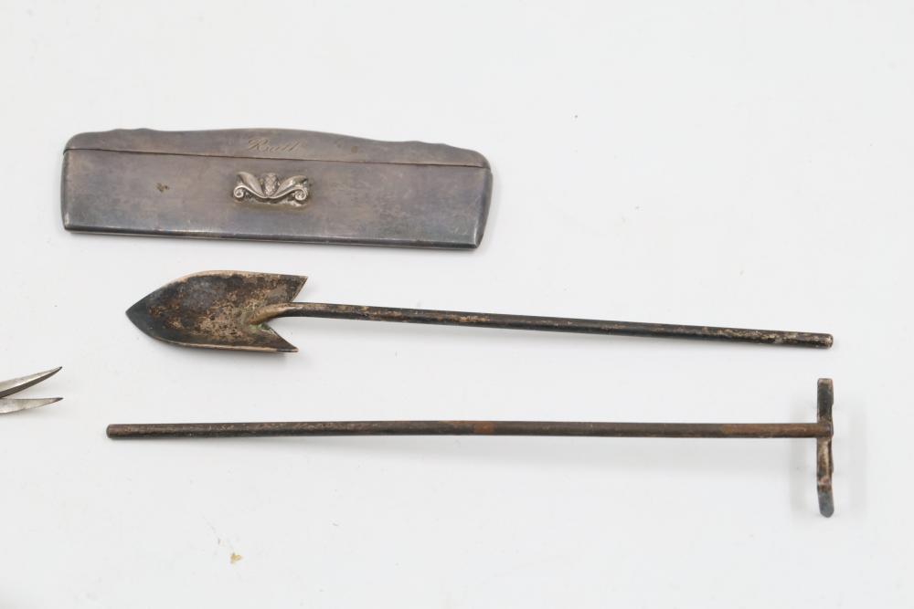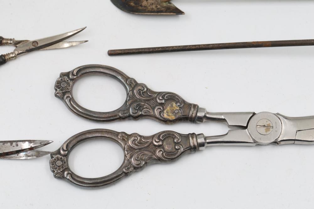 Sterling and Silver Decorative scissors, shears, box, small bowl, and metal hand tools. Includes ornate scissors with detailed silver handles, shears with a locking mechanism and shaped blade, a small storage box with hinged lid, a bowl with marked "sterling 925", and metal tools such as a rake and spade-shaped implement. Handles are sterling. Total weight being 248 grams.
