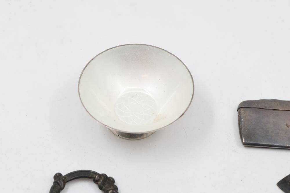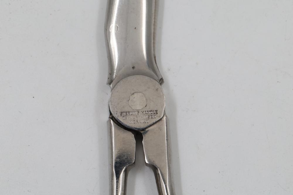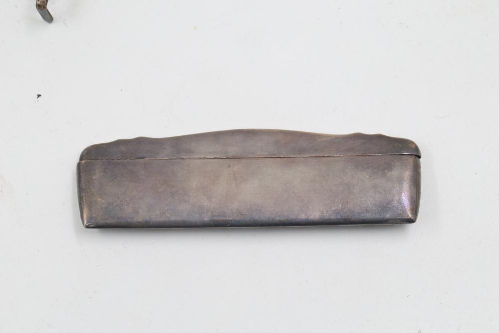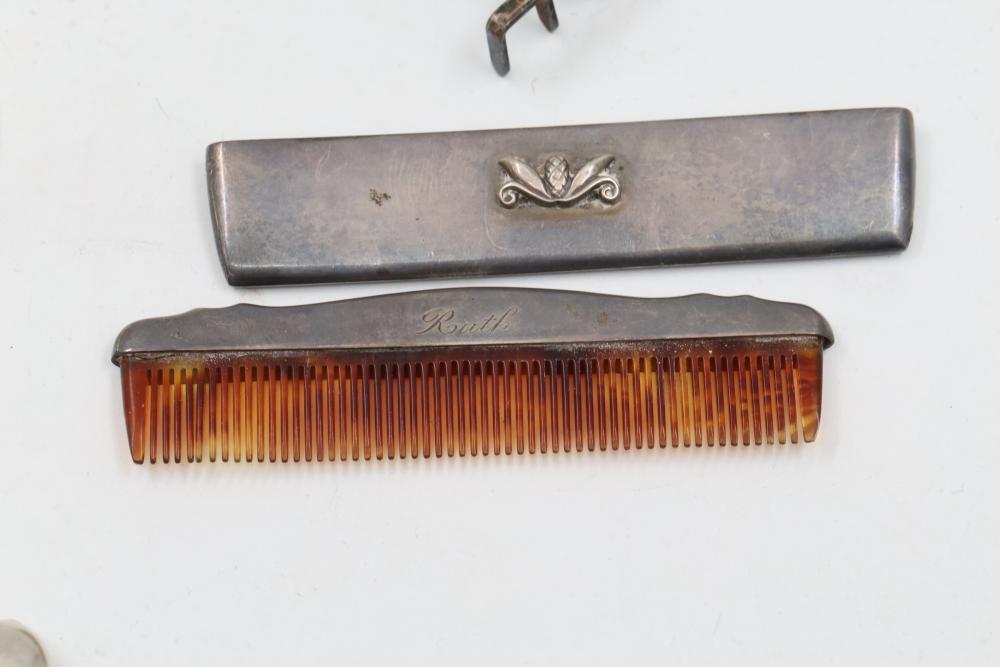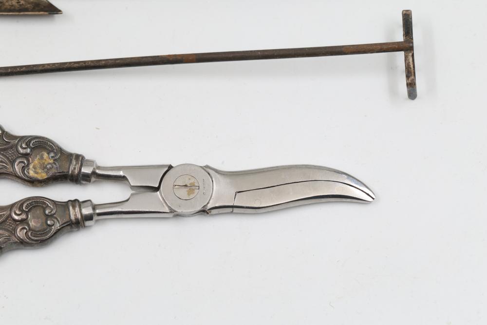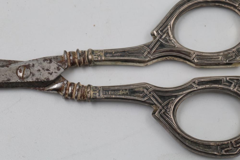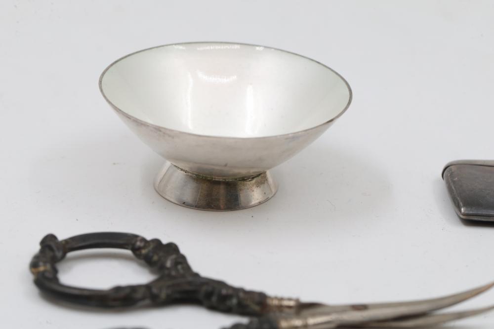 Sterling and Silver Decorative scissors, shears, box, small bowl, and metal hand tools. Includes ornate scissors with detailed silver handles, shears with a locking mechanism and shaped blade, a small storage box with hinged lid, a bowl with marked "sterling 925", and metal tools such as a rake and spade-shaped implement. Handles are sterling. Total weight being 248 grams.