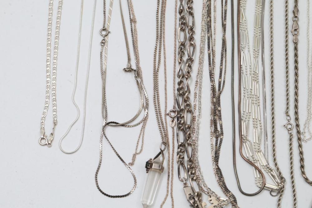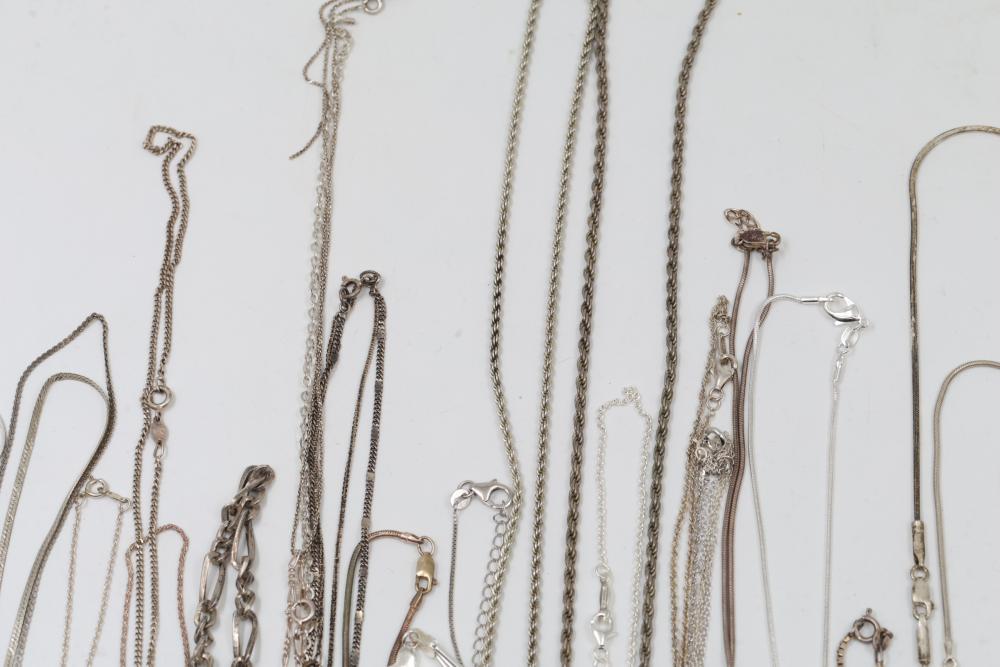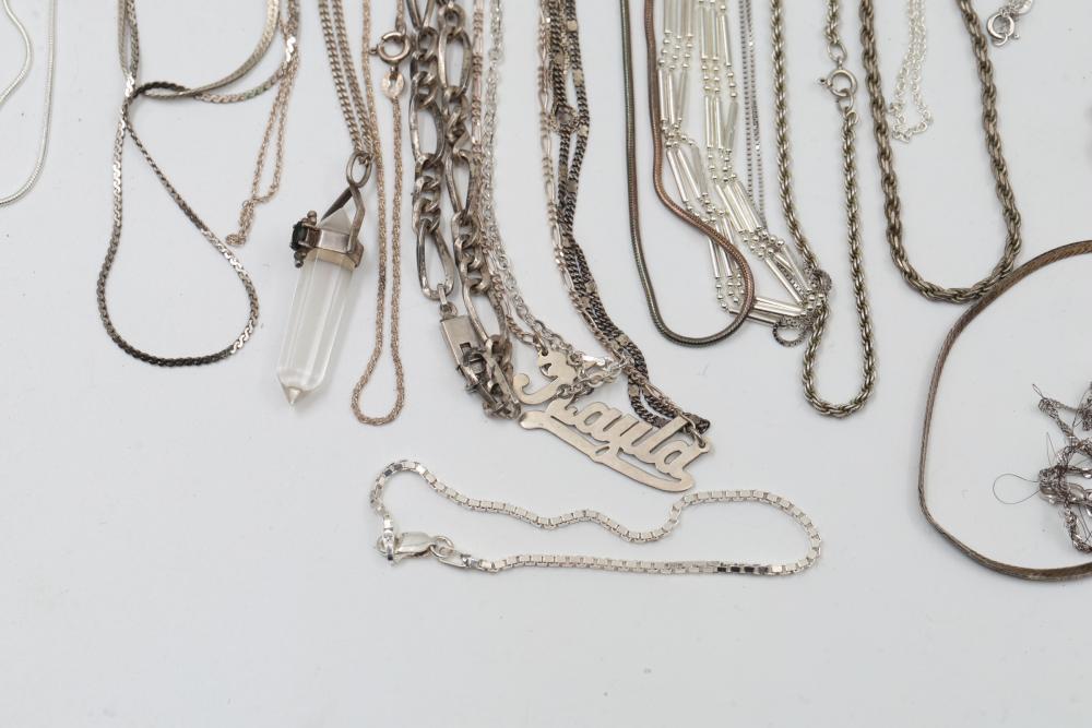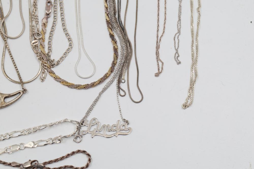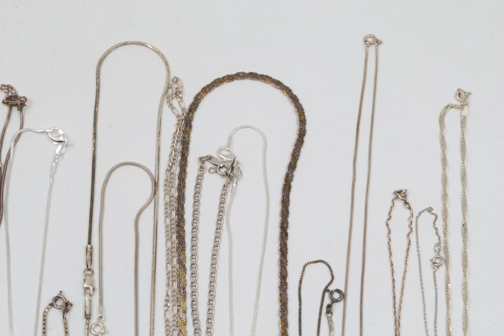 Silver and "925" marked metal necklaces featuring various chain styles and designs. Includes a variety of link patterns, metal tones, and some with pendants. Total weight being 220 grams.