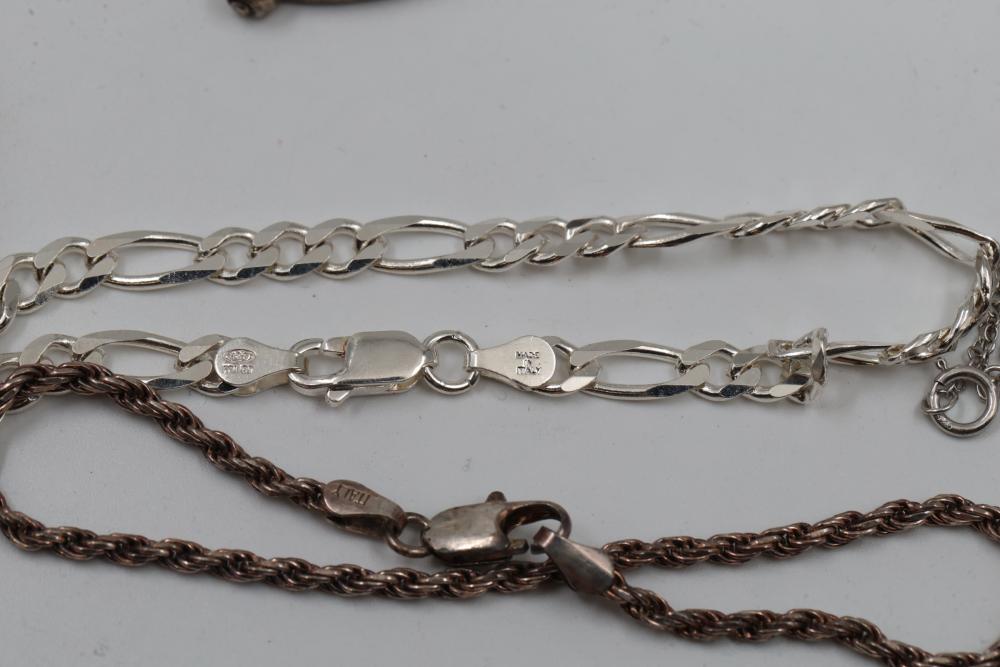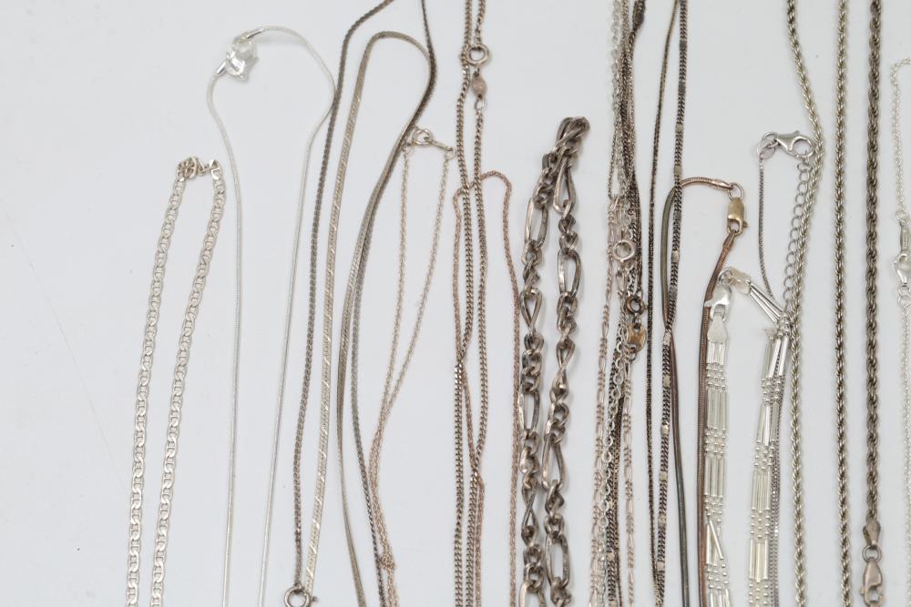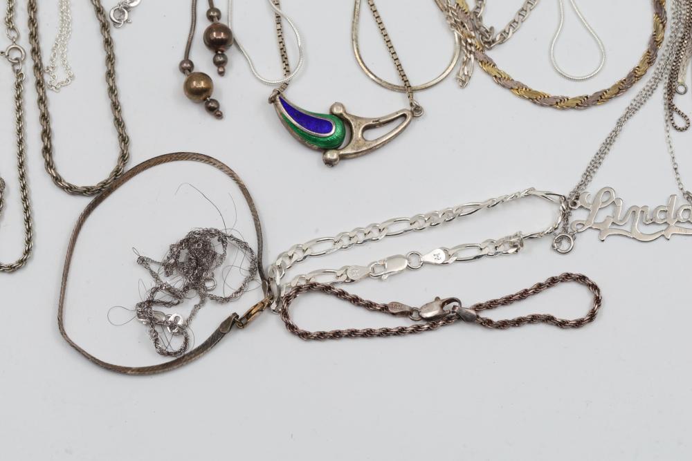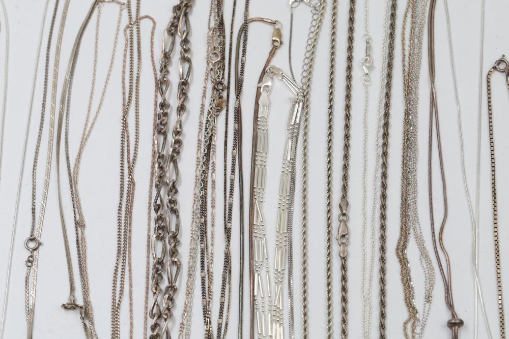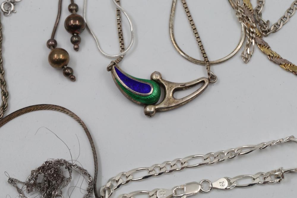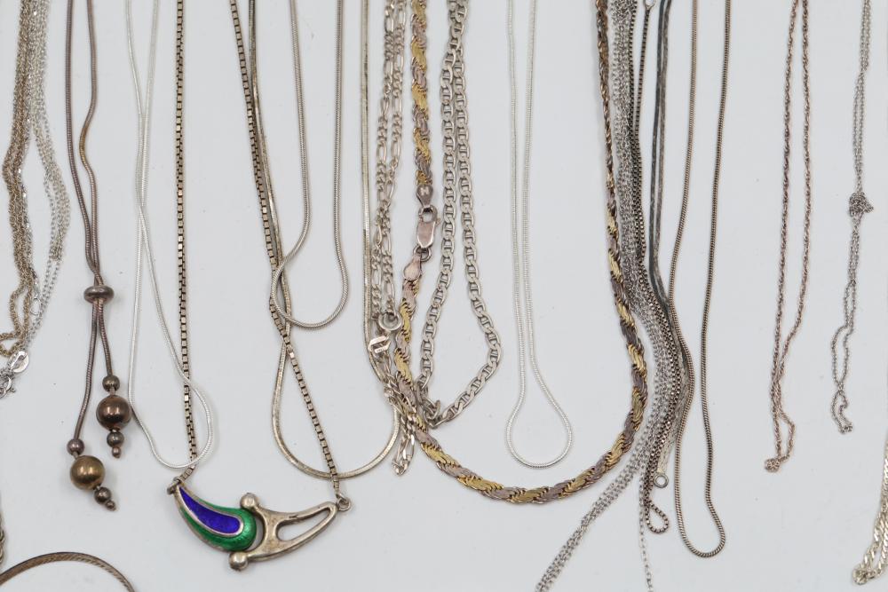 Silver and "925" marked metal necklaces featuring various chain styles and designs. Includes a variety of link patterns, metal tones, and some with pendants. Total weight being 220 grams.
