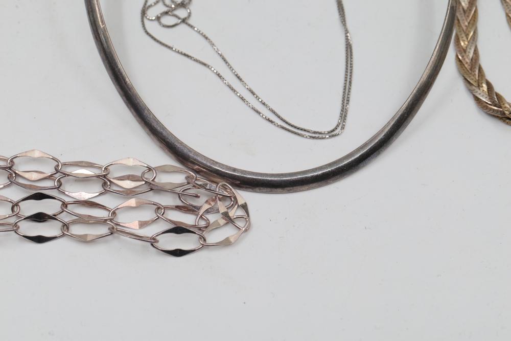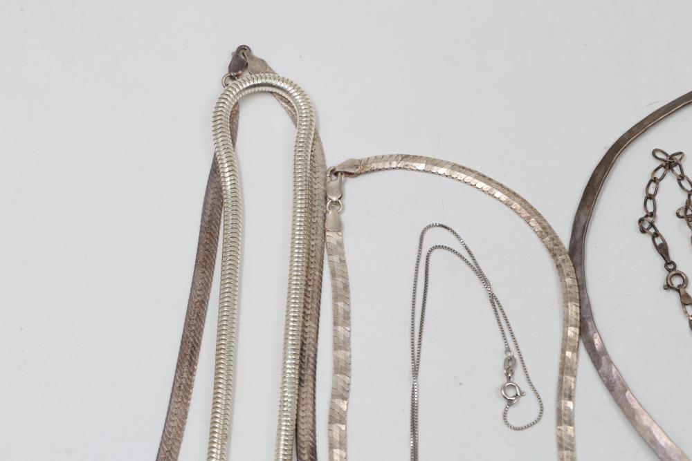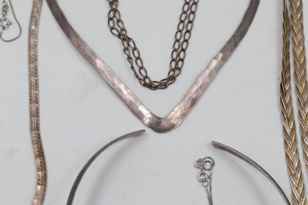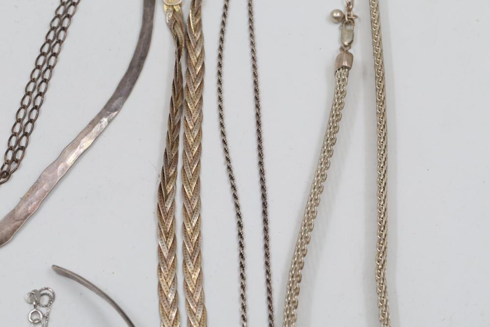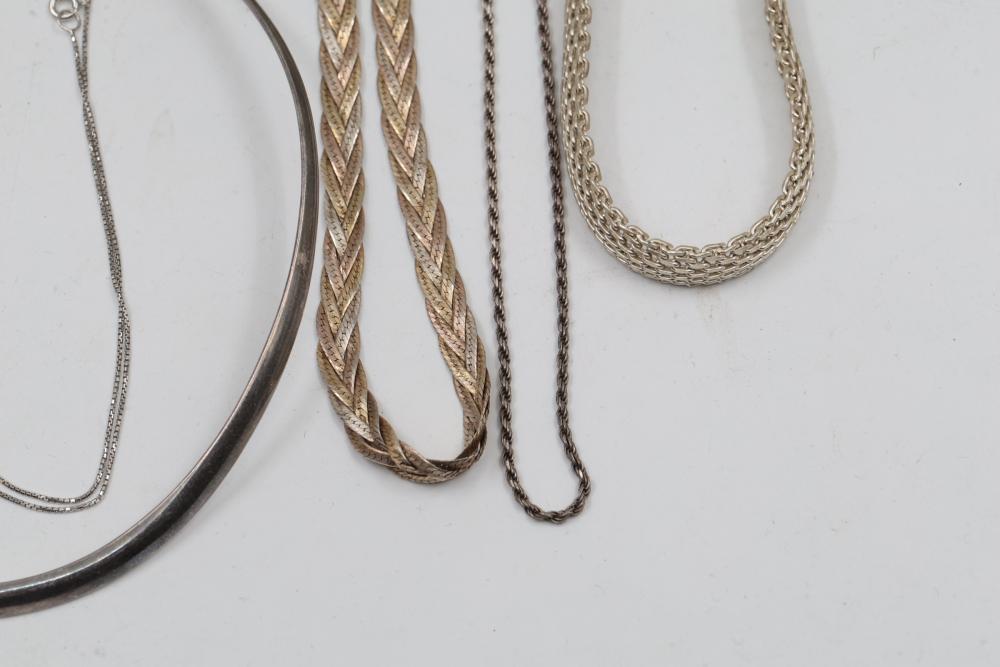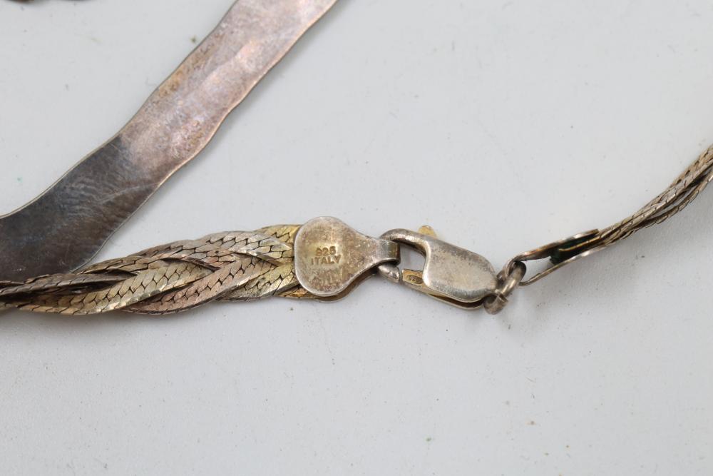 Silver-Tone and Gold-Tone Necklaces and Bracelets. This grouping includes various chains, braided designs, and flat-banded pieces featuring both silver-tone and gold-tone metals. Some items bear visible markings such as "925" and "Italy." Total silver weight being 215 grams.