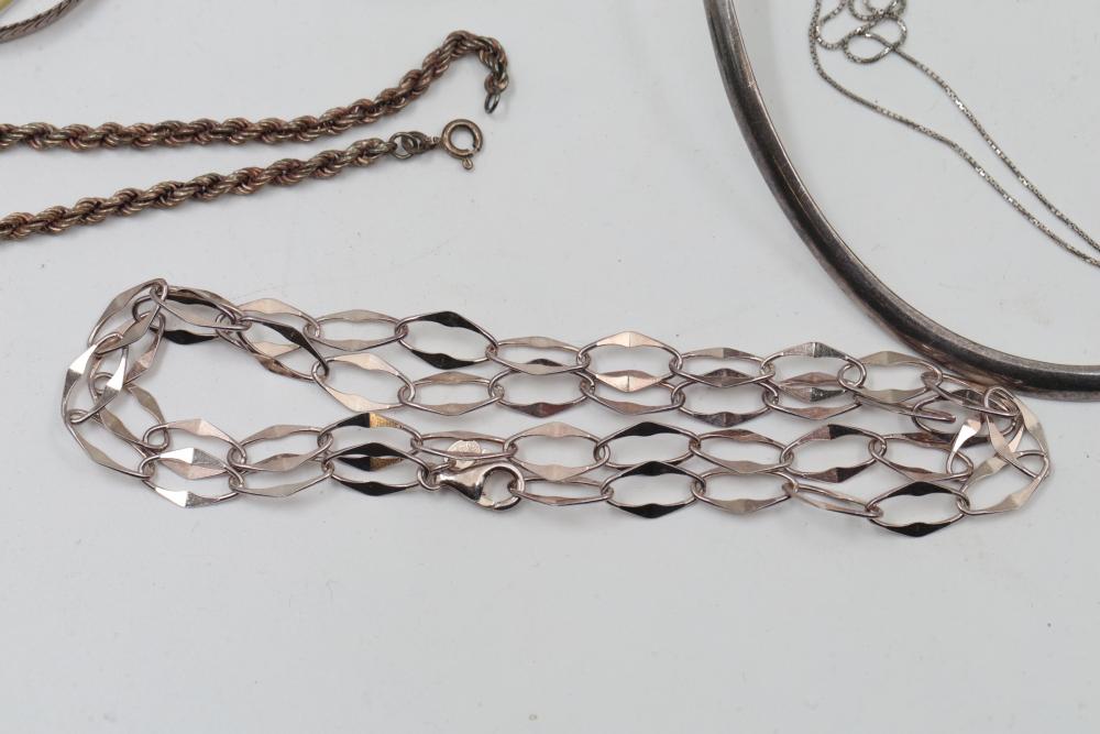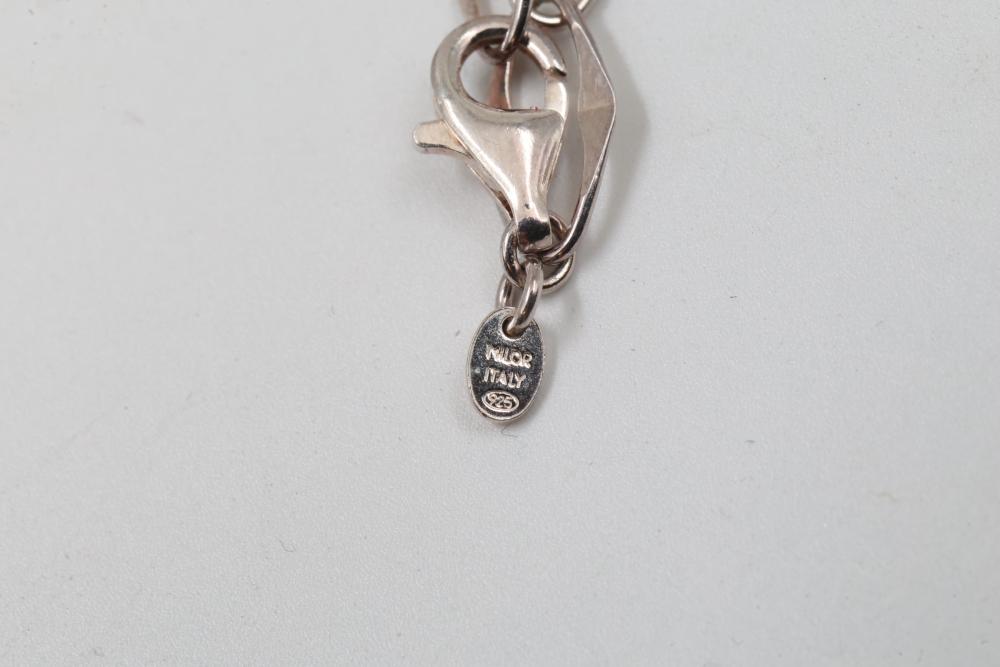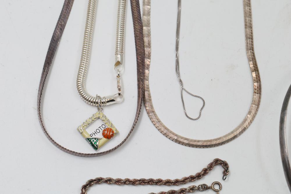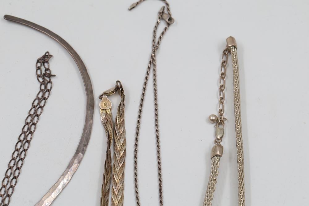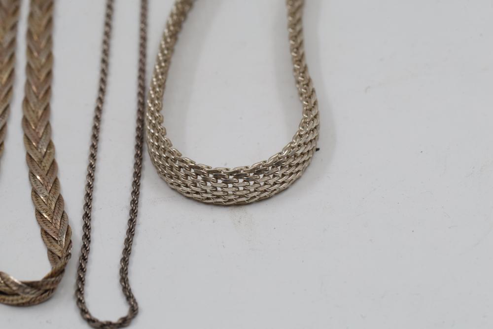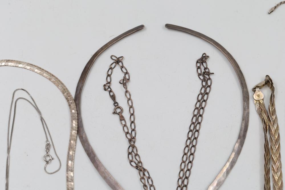 Silver-Tone and Gold-Tone Necklaces and Bracelets. This grouping includes various chains, braided designs, and flat-banded pieces featuring both silver-tone and gold-tone metals. Some items bear visible markings such as "925" and "Italy." Total silver weight being 215 grams.