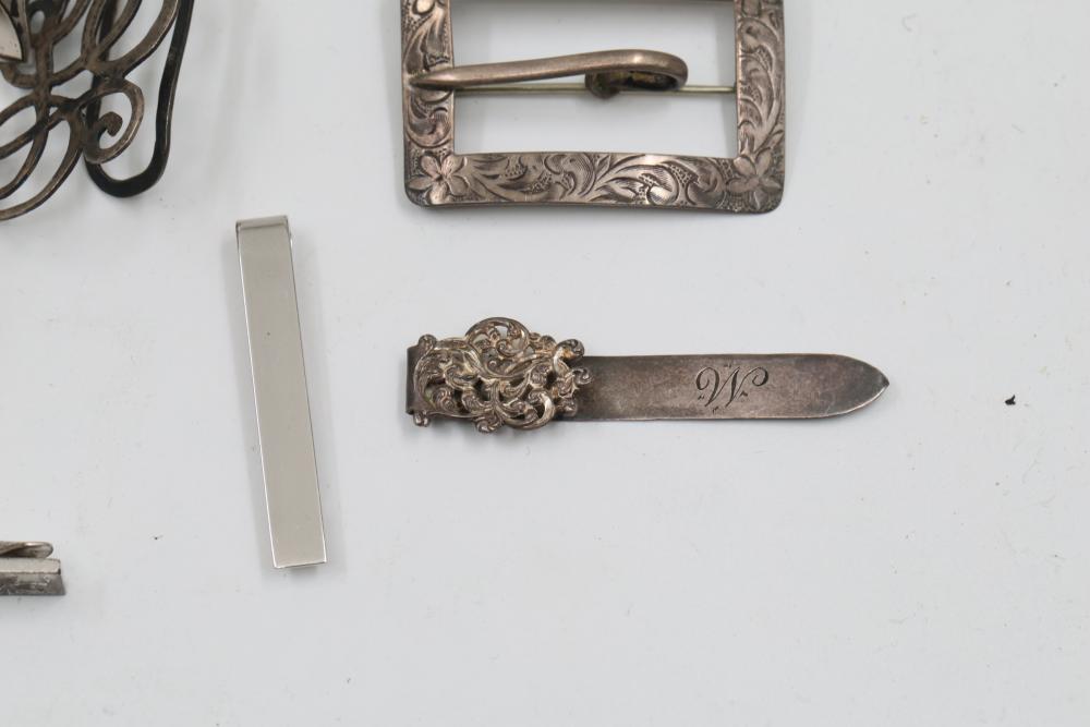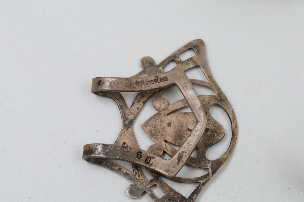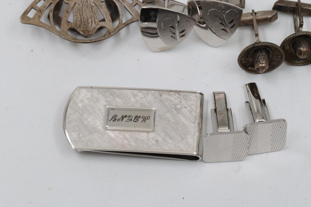 Sterling silver and metal accessories, including buckles, cufflinks, money clips, and other small items. Notable markings include "Sterling" and engraved initials or designs on several pieces. Total silver weight being 263 grams.