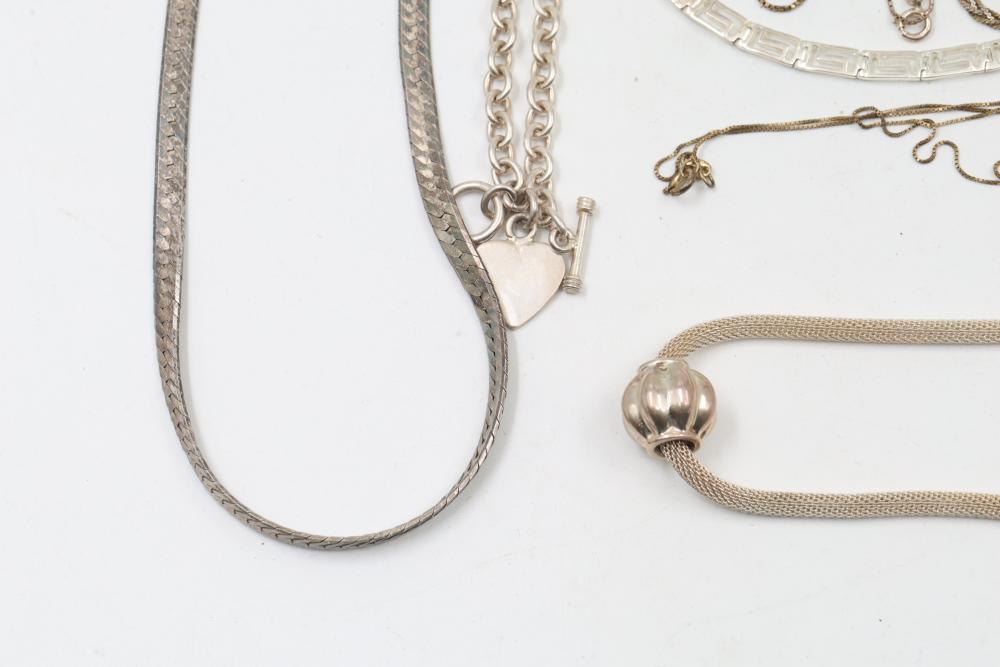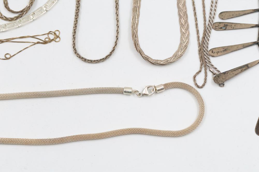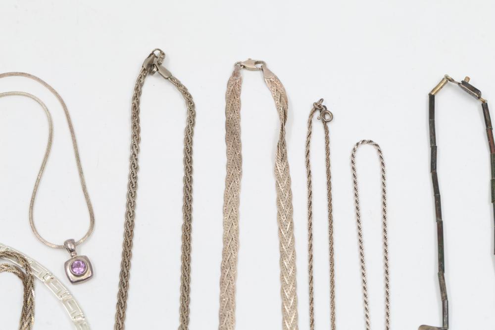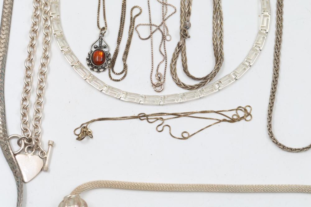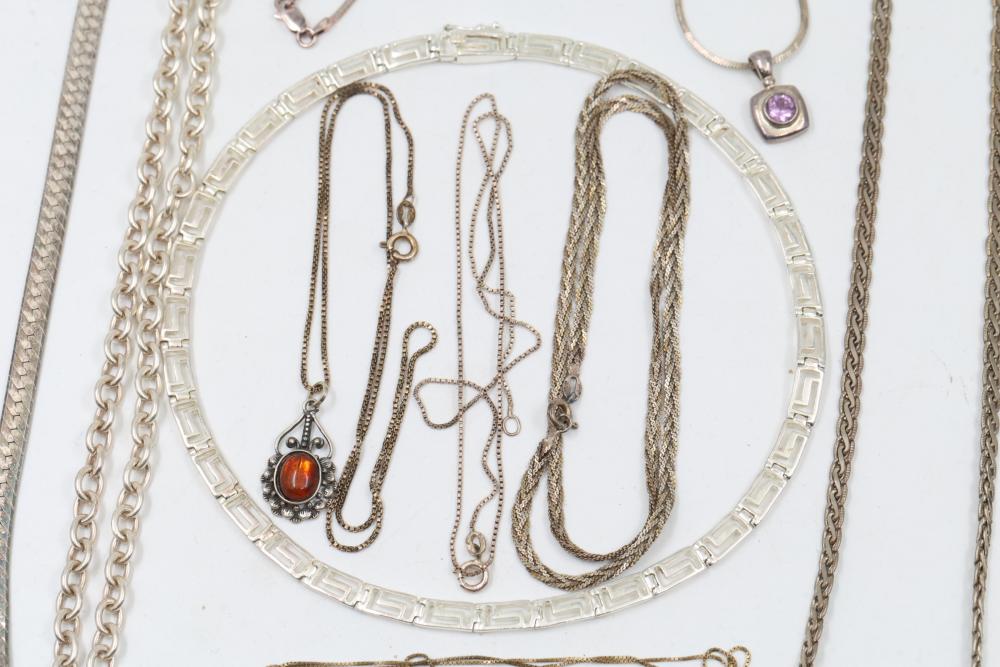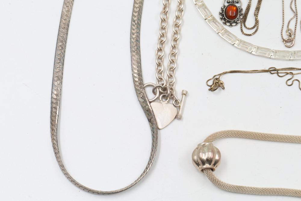 Silver and silver-tone necklaces with decorative elements, including chain-link, braided, and pendant designs. Features details like a heart-shaped clasp, amethyst-like stone pendant, and amber-tone pendant. Includes designs with a variety of textures and clasp styles. Total silver weight being 201 grams.