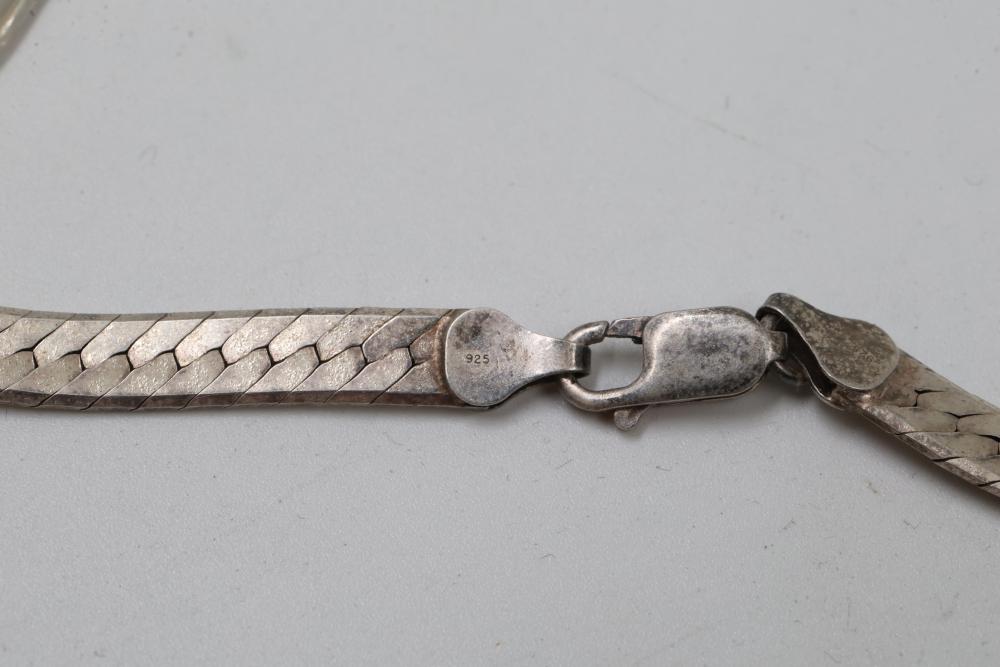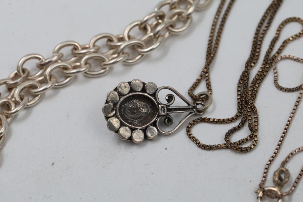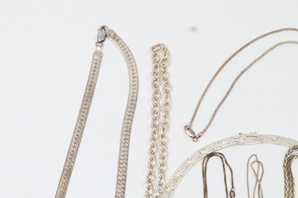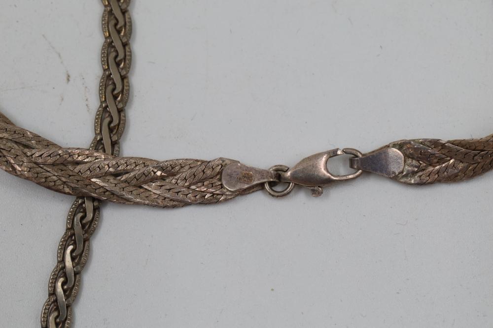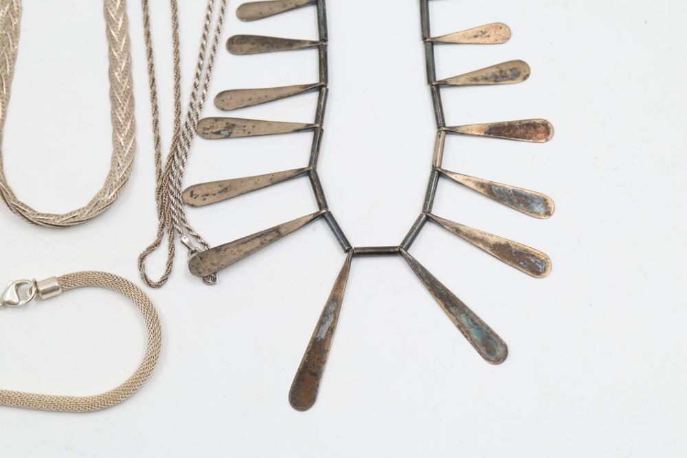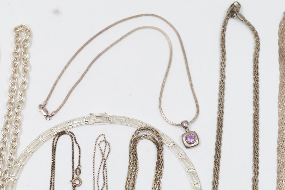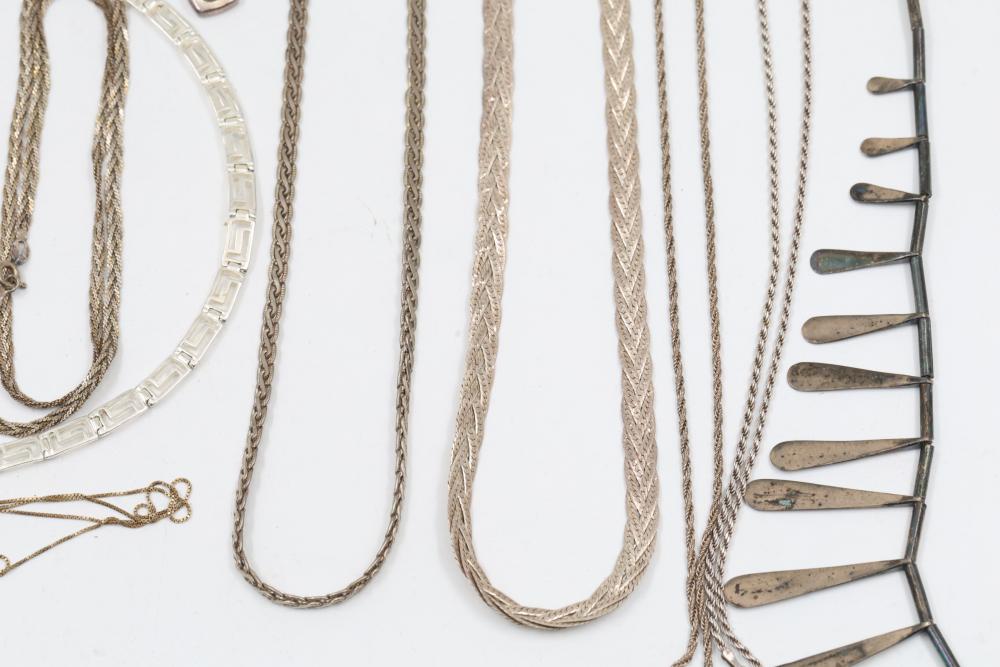 Silver and silver-tone necklaces with decorative elements, including chain-link, braided, and pendant designs. Features details like a heart-shaped clasp, amethyst-like stone pendant, and amber-tone pendant. Includes designs with a variety of textures and clasp styles. Total silver weight being 201 grams.