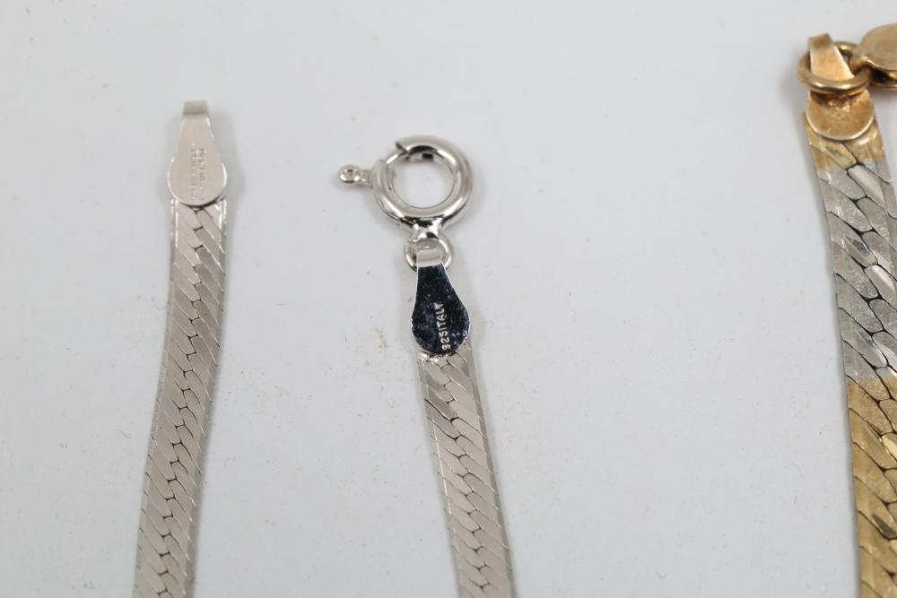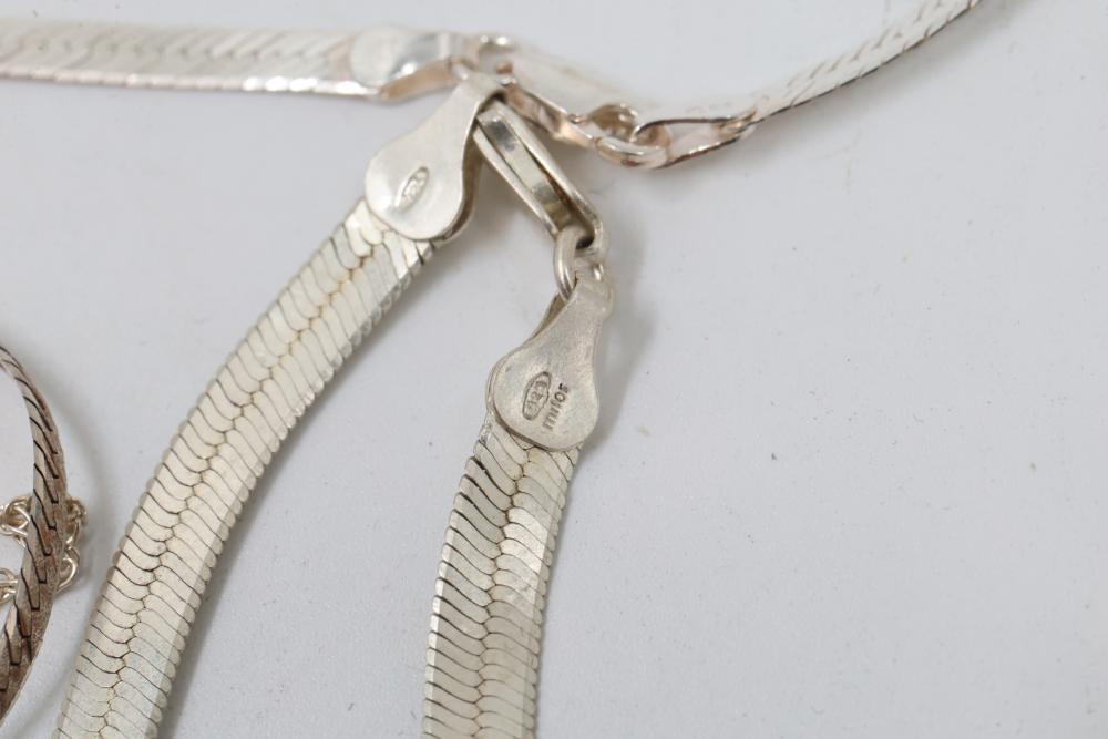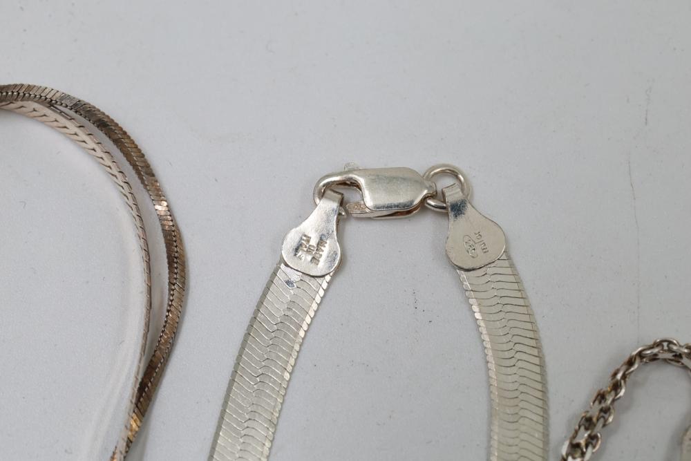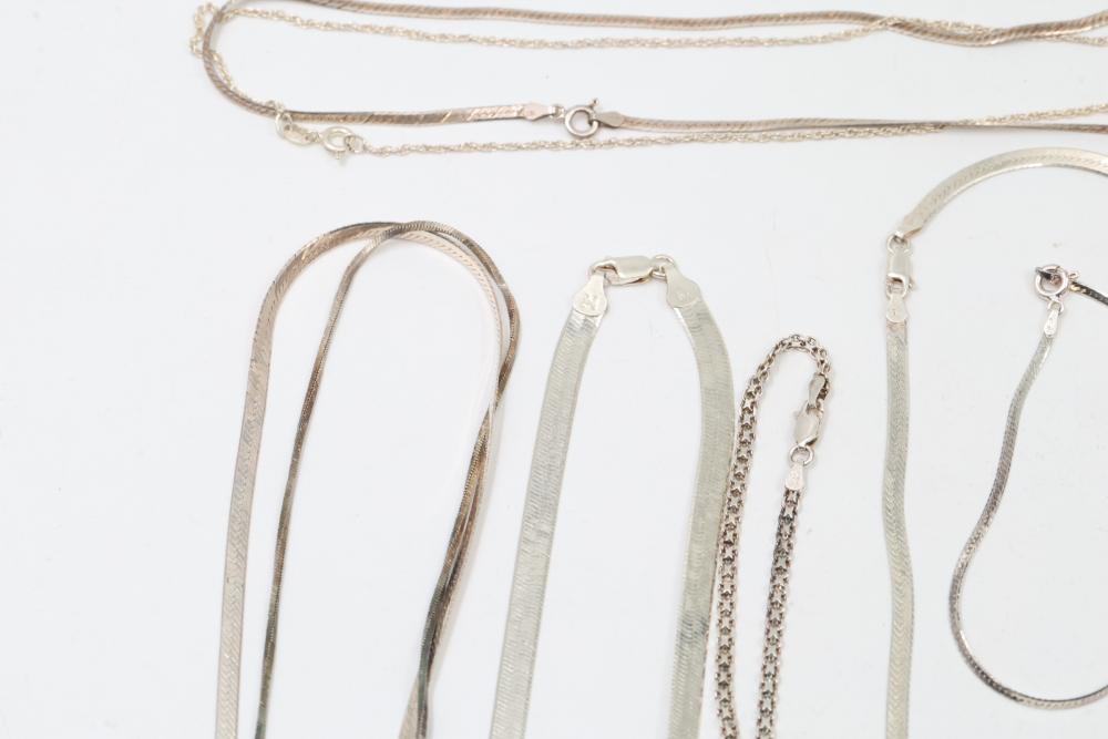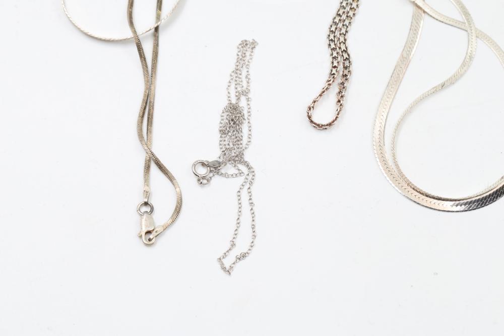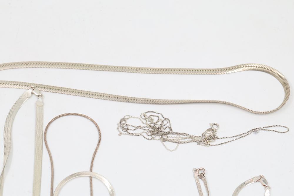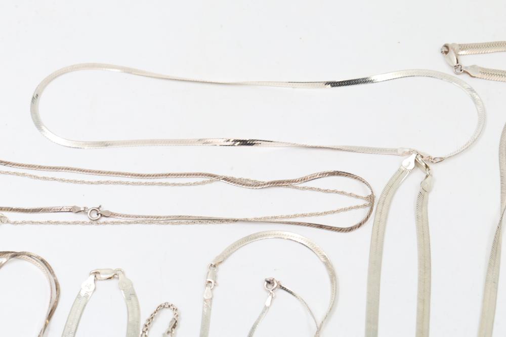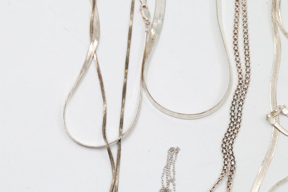 Sterling silver necklaces and chains with mixed designs, including polished and textured styles. Features elements like clasps and multi-tone accents. Variety includes straight and twisted chains with various lengths. Total silver weight being 213 grams.