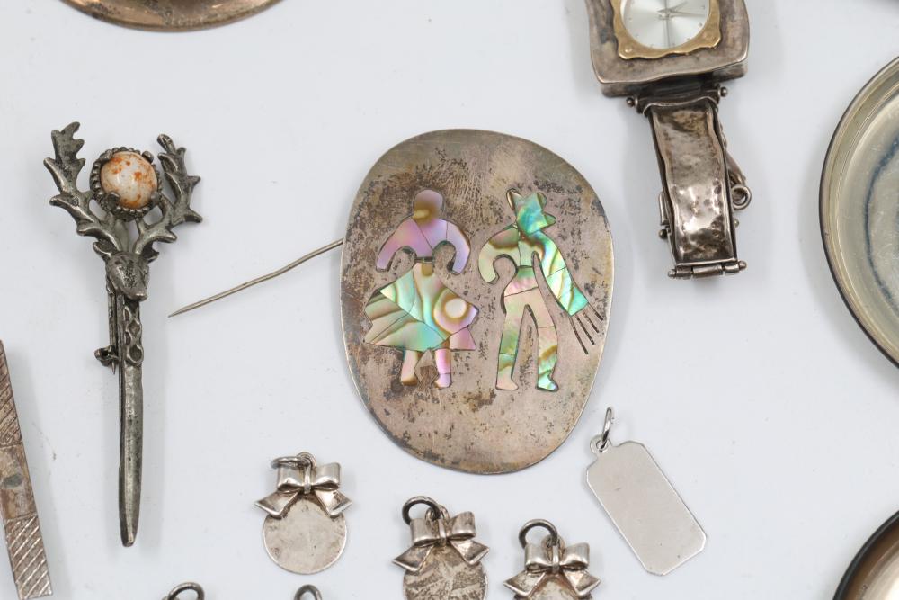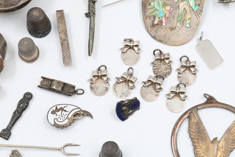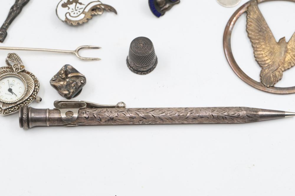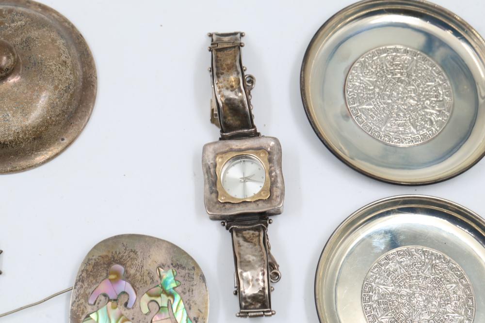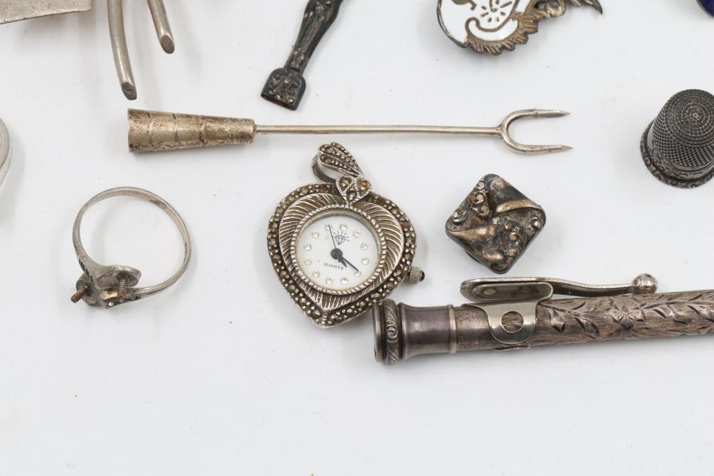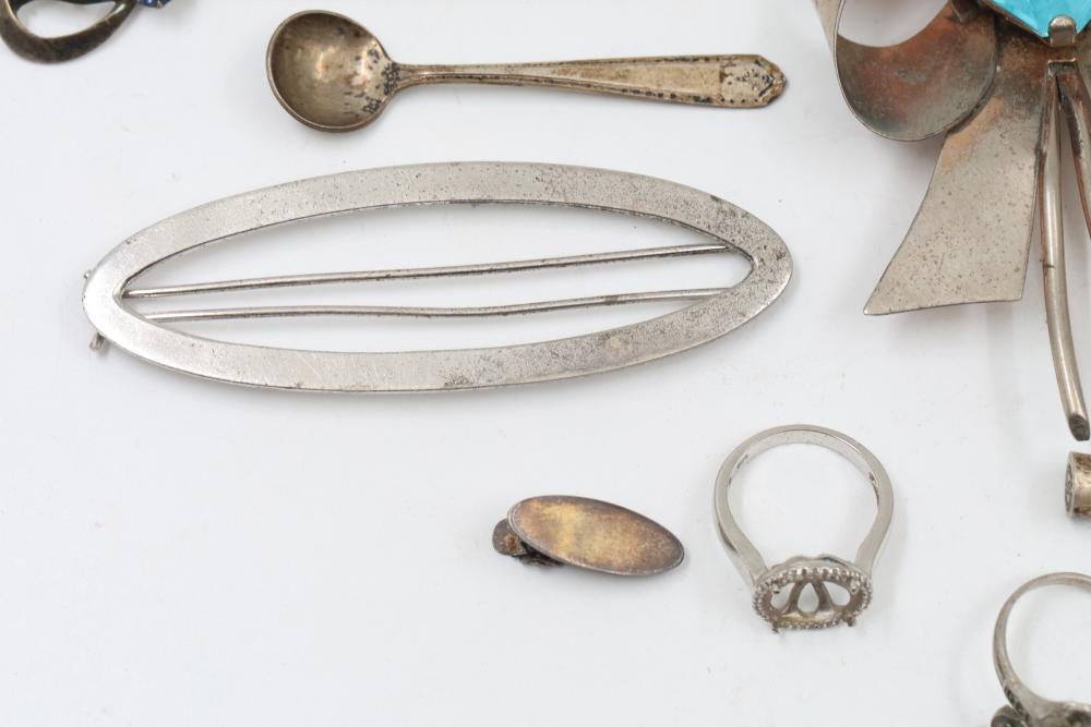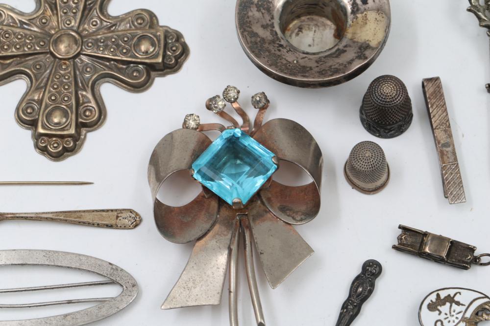 Sterling silver accessories and jewelry items, including pendants, brooches with inlay designs, bracelets, thimbles, hair accessories, spoons, a decorative pen, and watch faces. Includes pieces featuring etched, engraved, and enameled details. Some items marked "925" and sterling. Total weight being 382 grams.