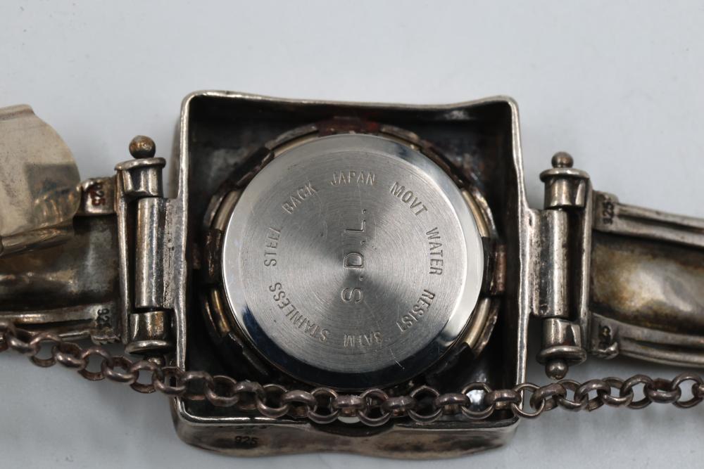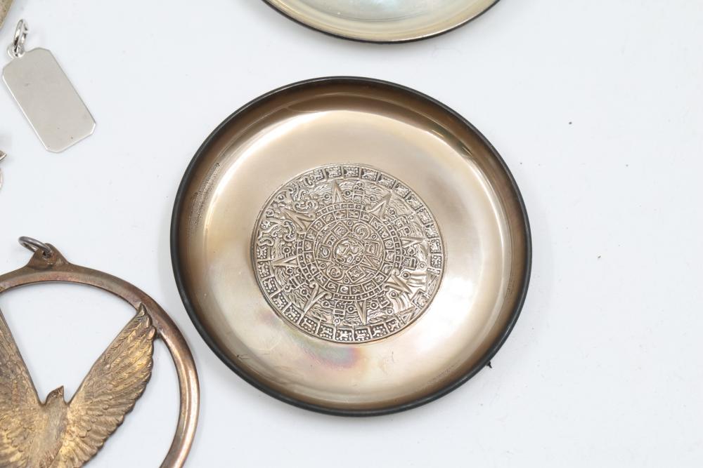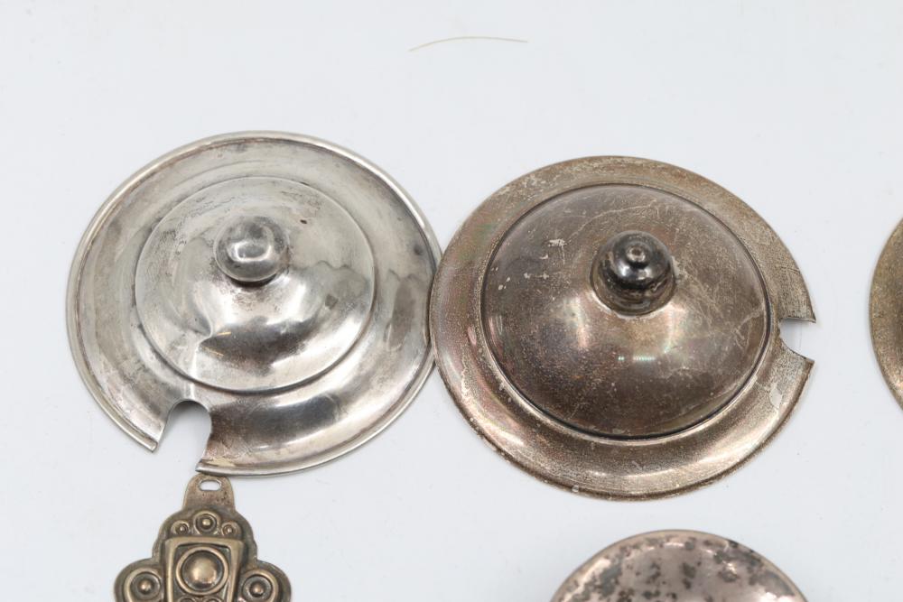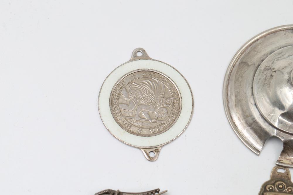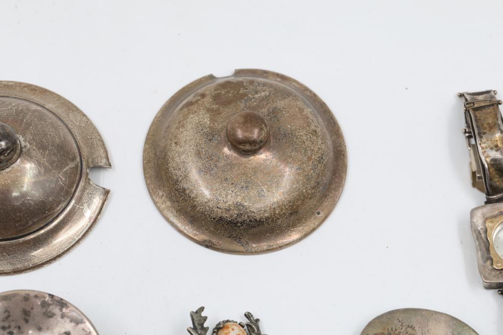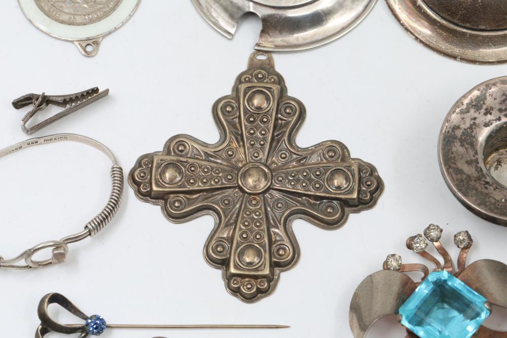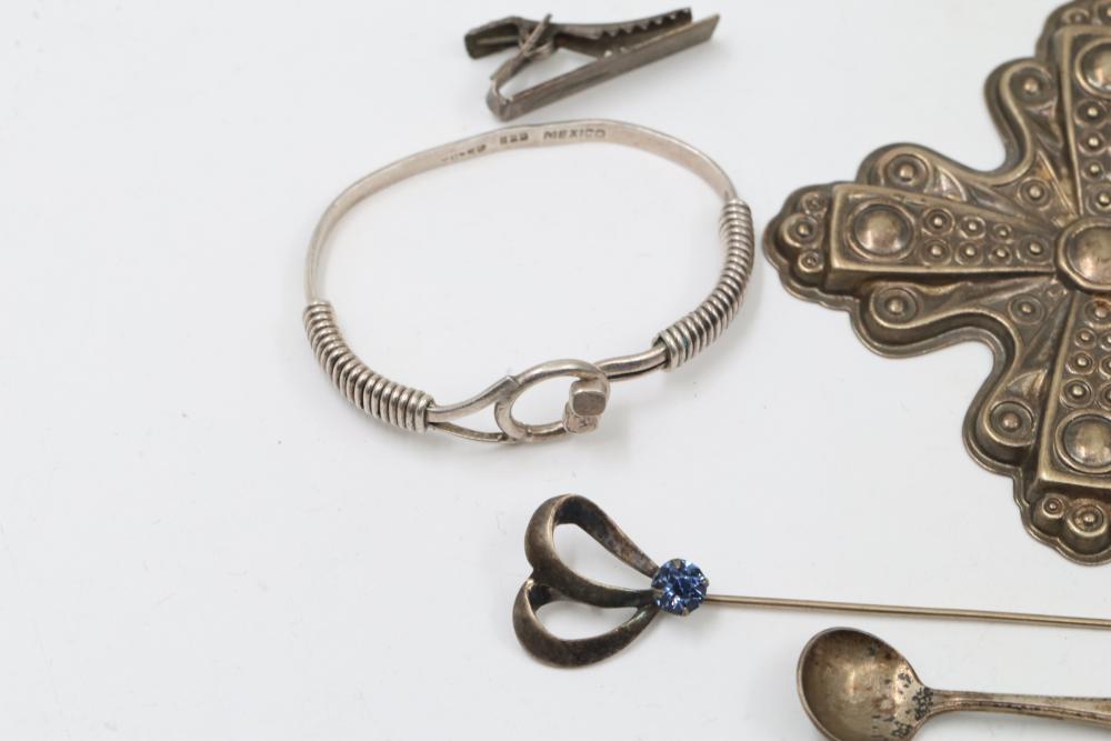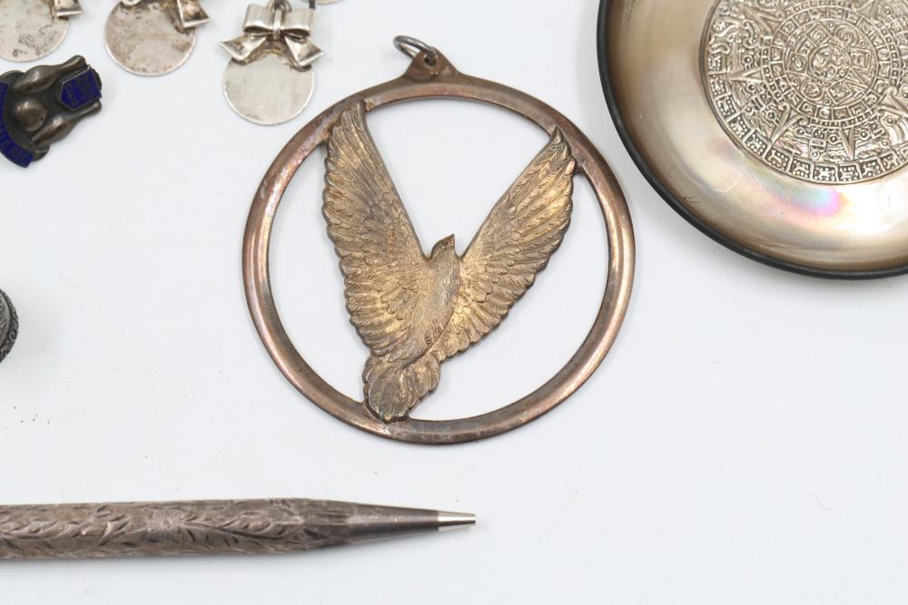 Sterling silver accessories and jewelry items, including pendants, brooches with inlay designs, bracelets, thimbles, hair accessories, spoons, a decorative pen, and watch faces. Includes pieces featuring etched, engraved, and enameled details. Some items marked "925" and sterling. Total weight being 382 grams.