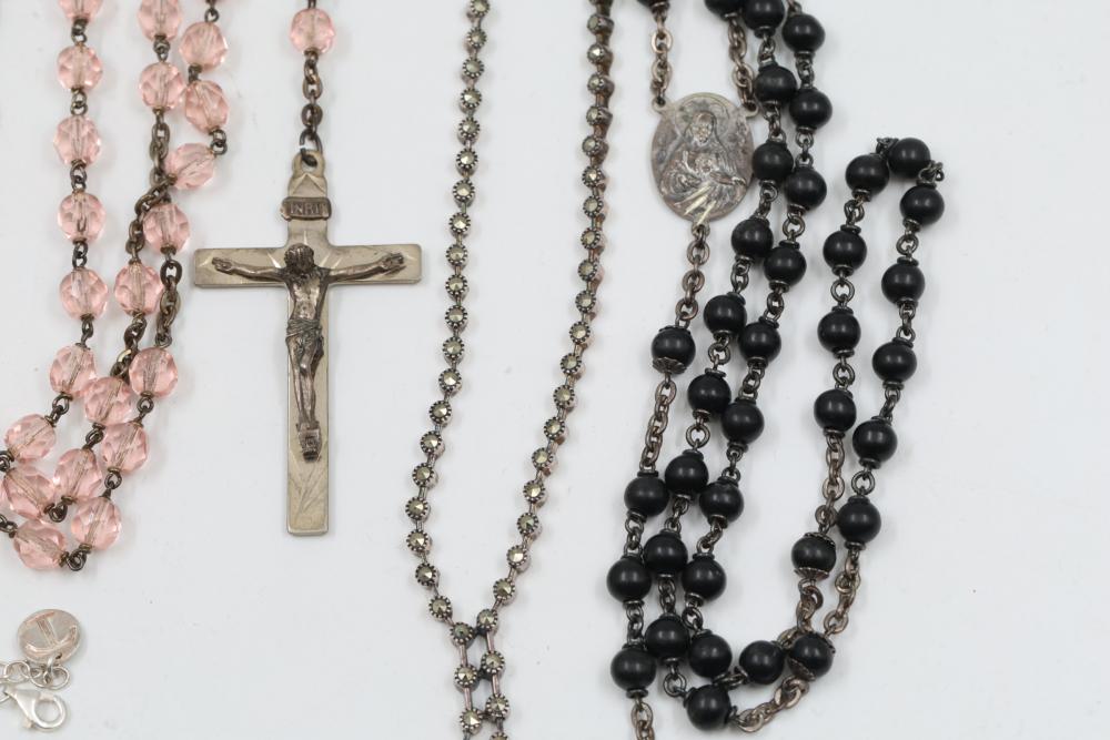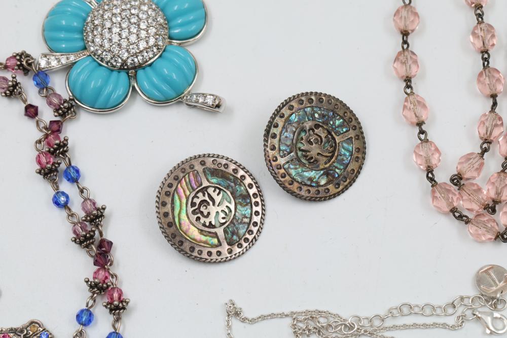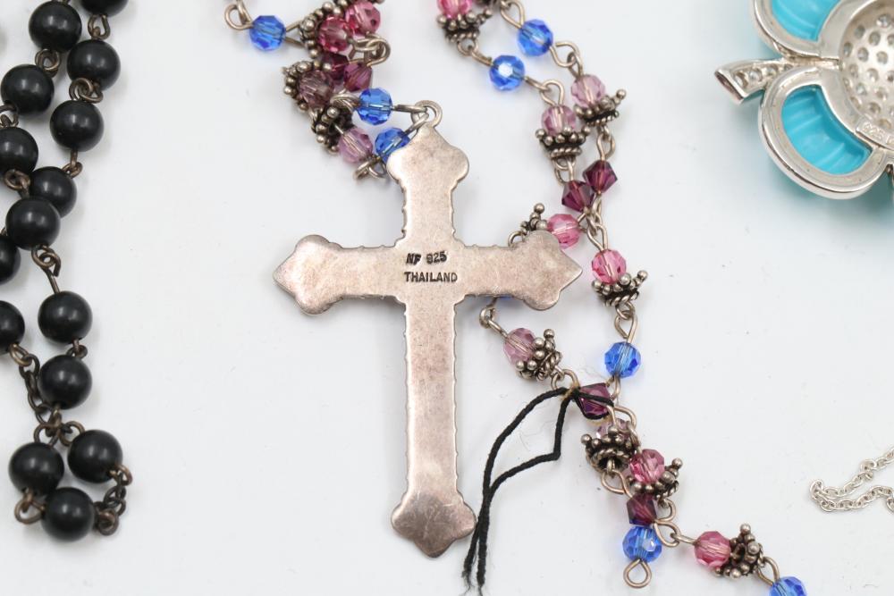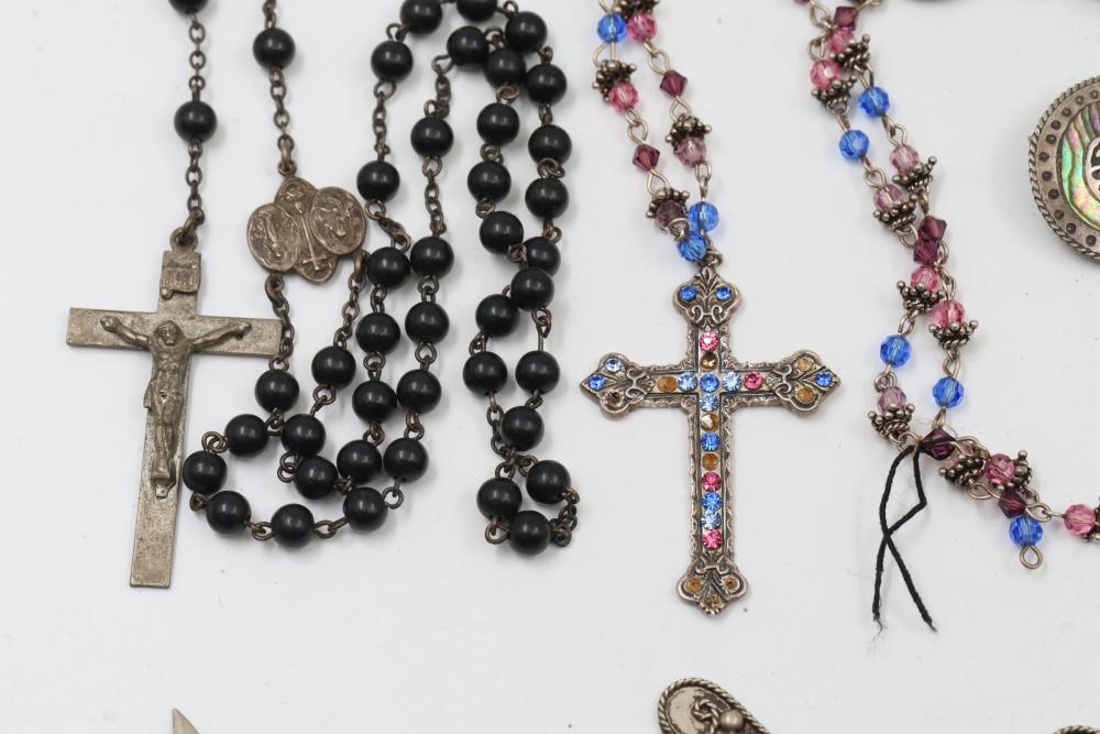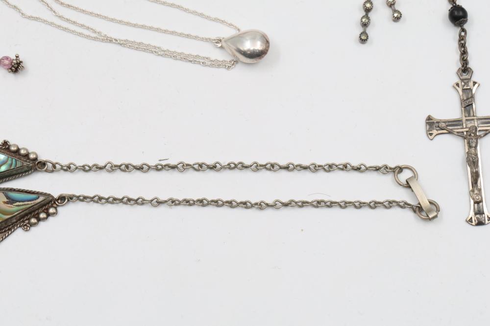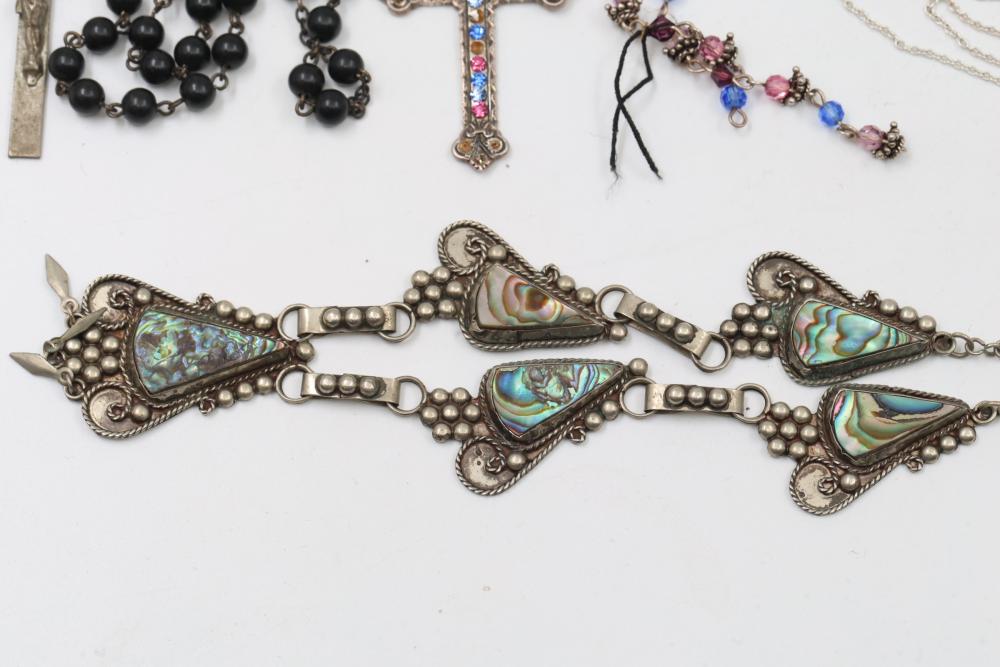 Sterling silver and fashion jewelry including a boxed sterling silver bracelet with engraved panels, a floral-shaped turquoise and rhinestone pendant, multiple rosaries with glass bead chains and cross pendants, abalone inset jewelry, and various stamped sterling silver pieces. Includes necklaces, pins, and decorative items. Some items marked "925" and sterling. Total weight being 135 grams.