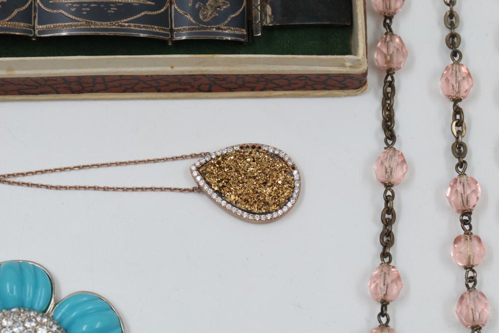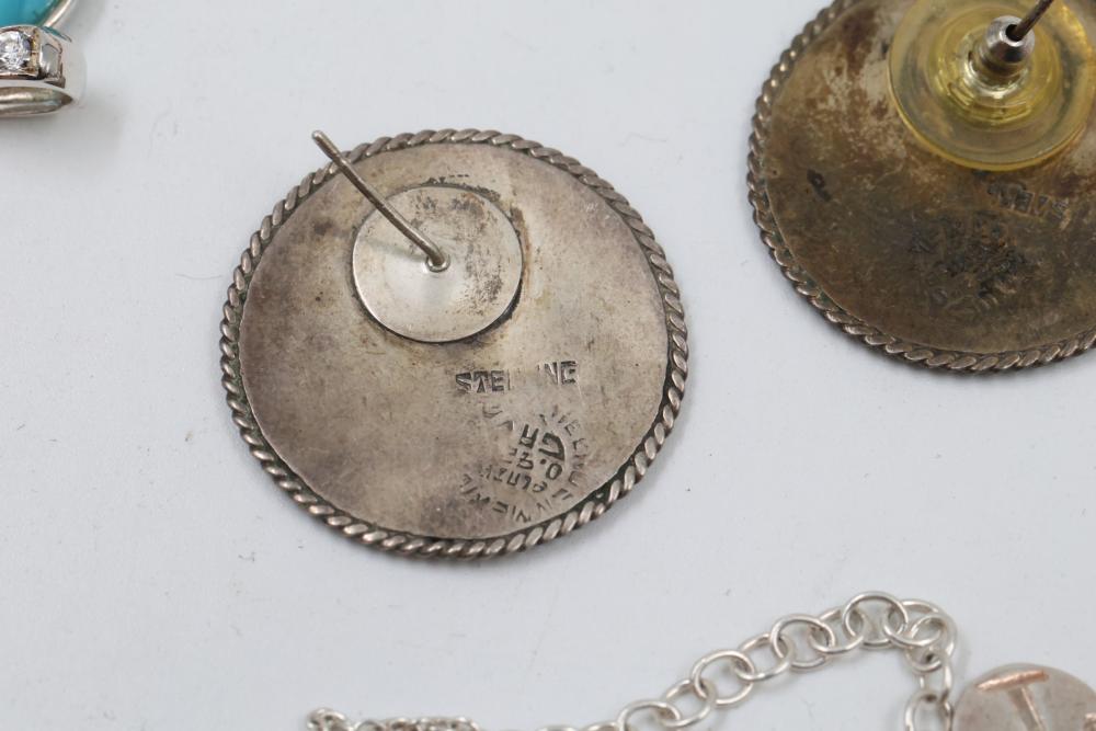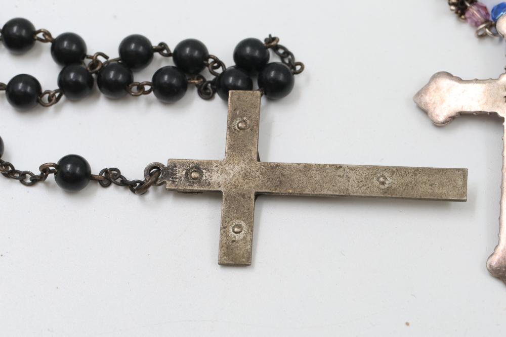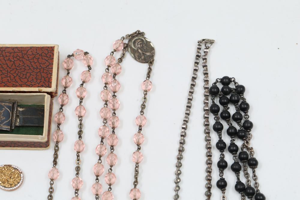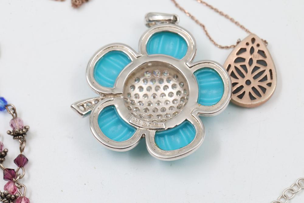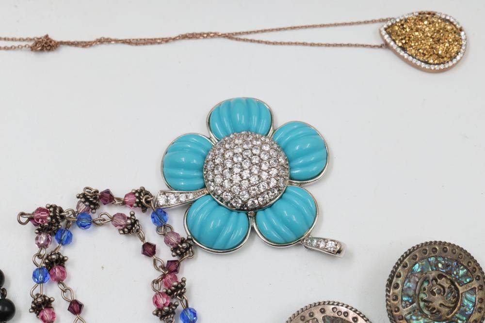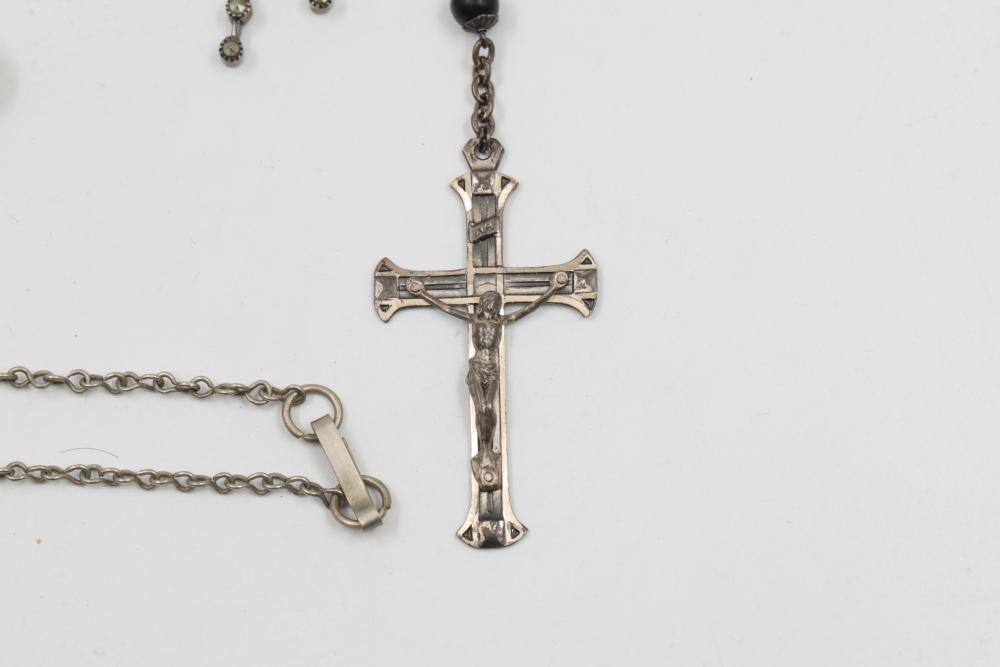 Sterling silver and fashion jewelry including a boxed sterling silver bracelet with engraved panels, a floral-shaped turquoise and rhinestone pendant, multiple rosaries with glass bead chains and cross pendants, abalone inset jewelry, and various stamped sterling silver pieces. Includes necklaces, pins, and decorative items. Some items marked "925" and sterling. Total weight being 135 grams.