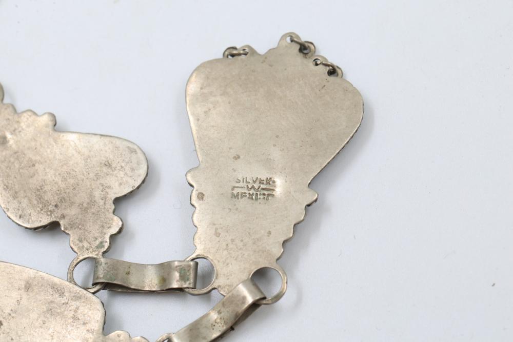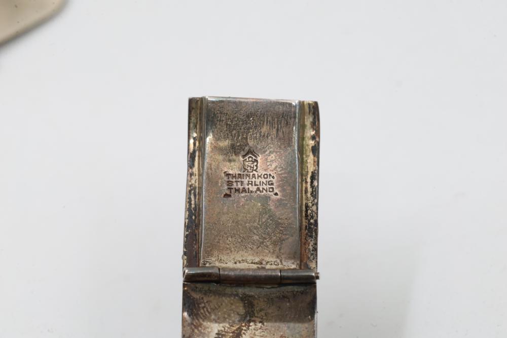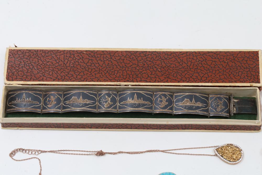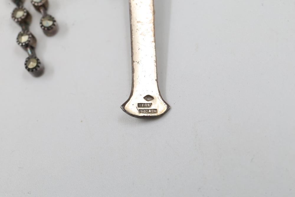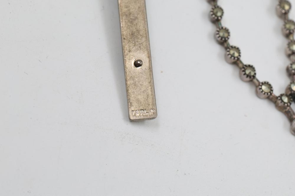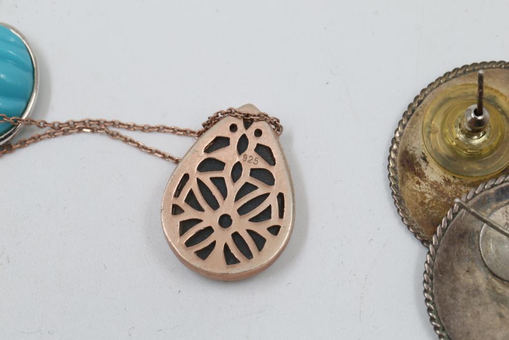 Sterling silver and fashion jewelry including a boxed sterling silver bracelet with engraved panels, a floral-shaped turquoise and rhinestone pendant, multiple rosaries with glass bead chains and cross pendants, abalone inset jewelry, and various stamped sterling silver pieces. Includes necklaces, pins, and decorative items. Some items marked "925" and sterling. Total weight being 135 grams.