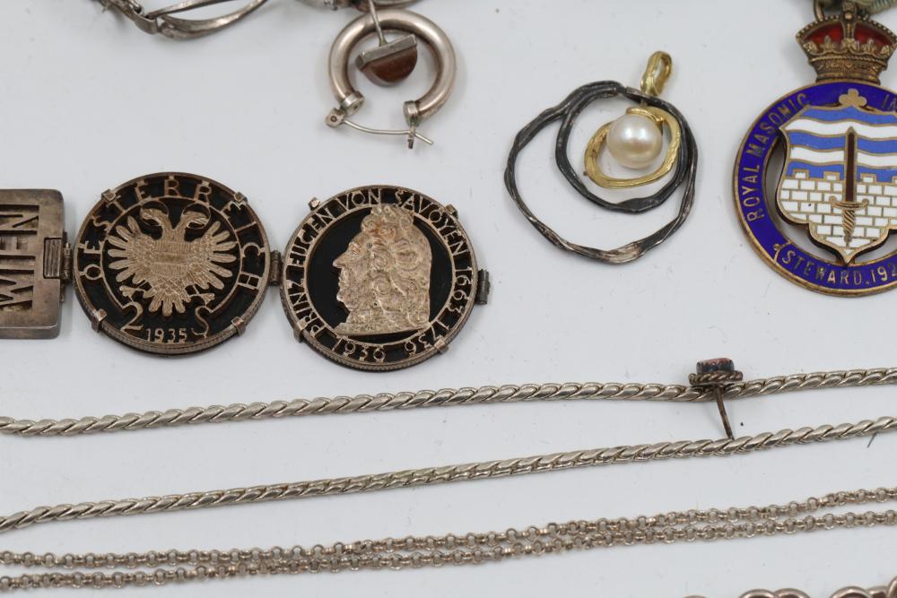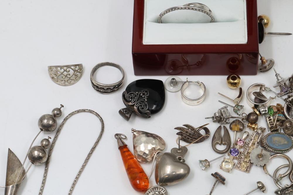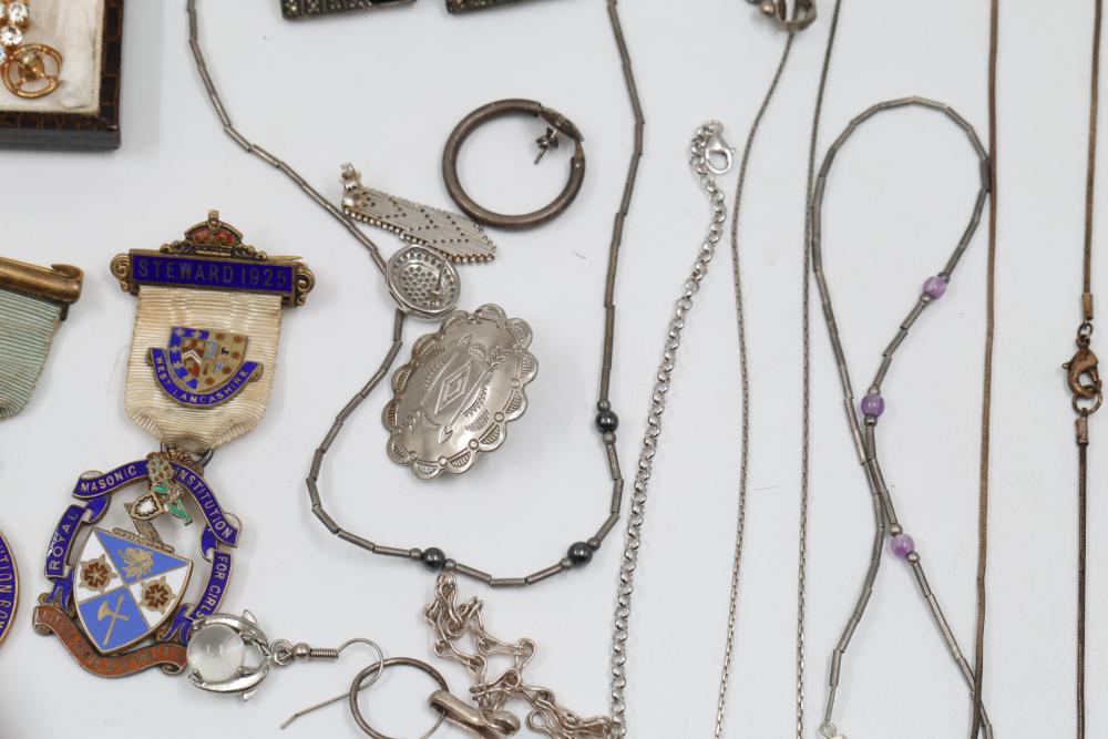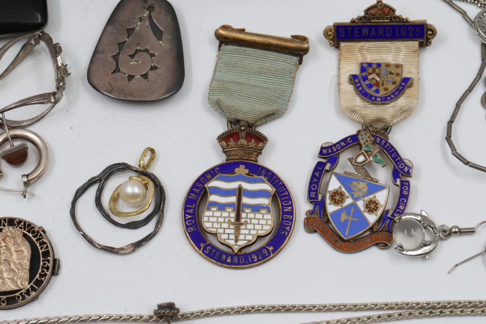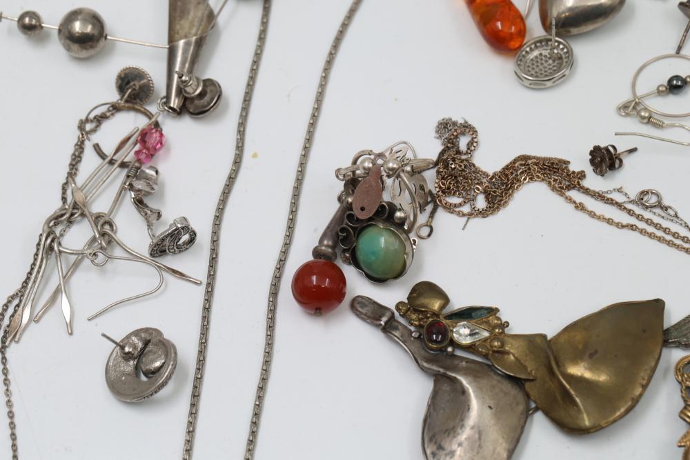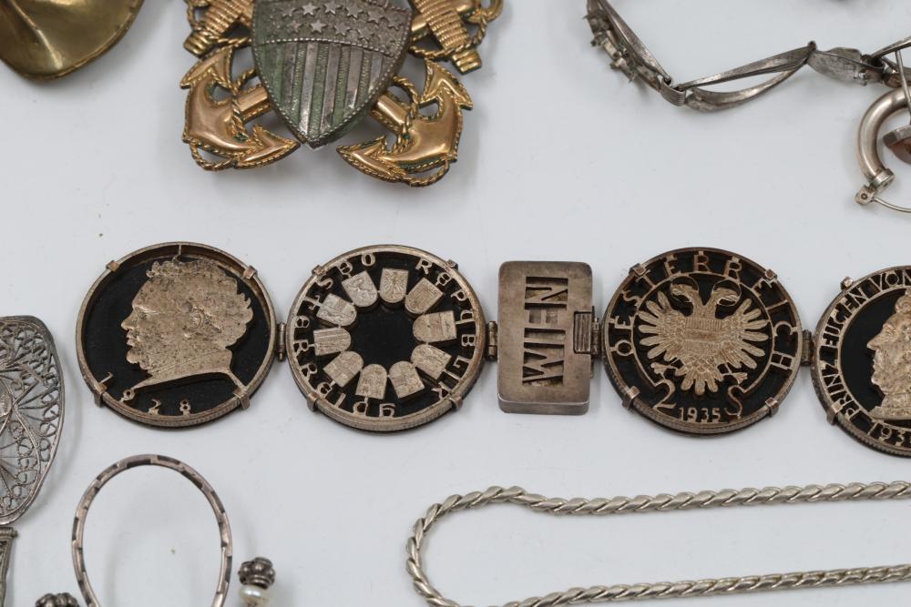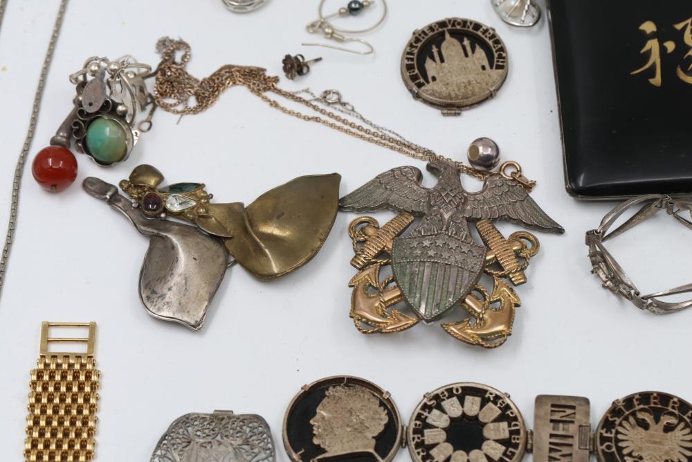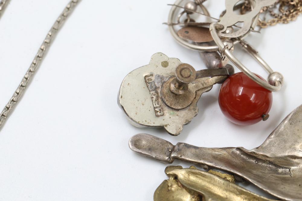 Jewelry including necklaces, rings, pins, earrings, pendants, and bracelets constructed with metallics, stones, and enamel elements. Includes a silver-tone ring with embedded stones in a display box, brooches, chains, medallions, and various decorative pieces.
