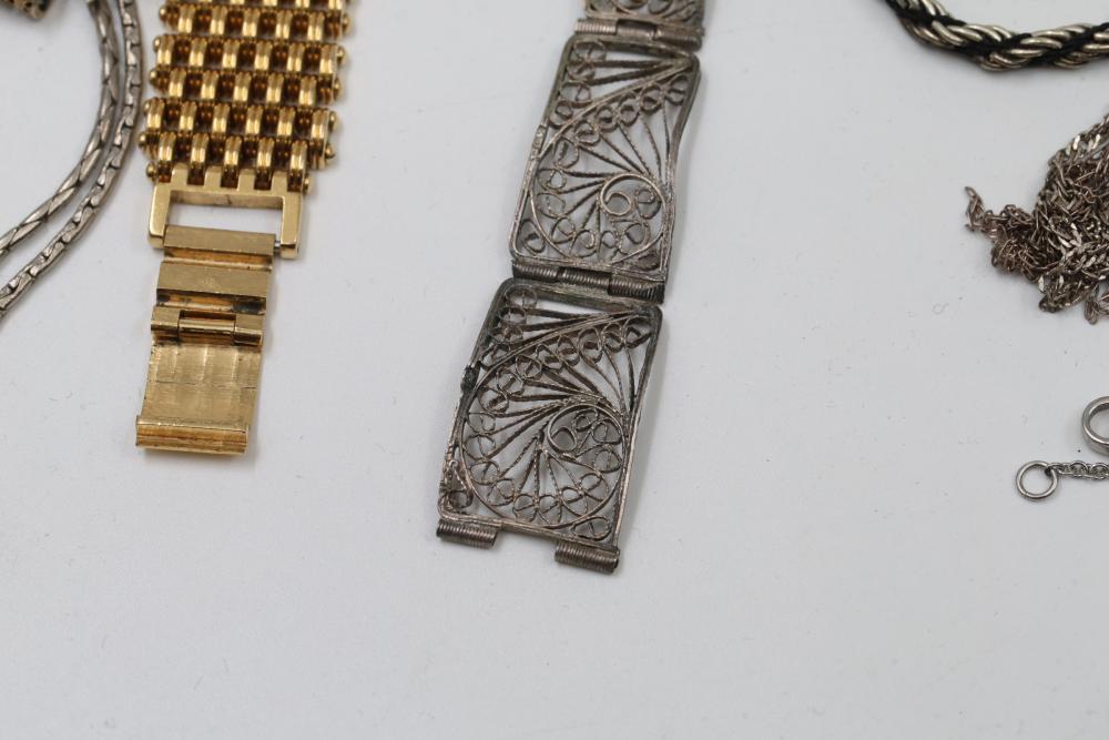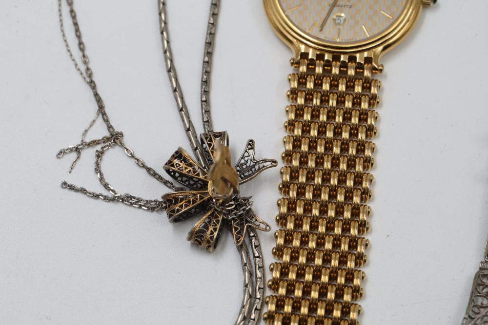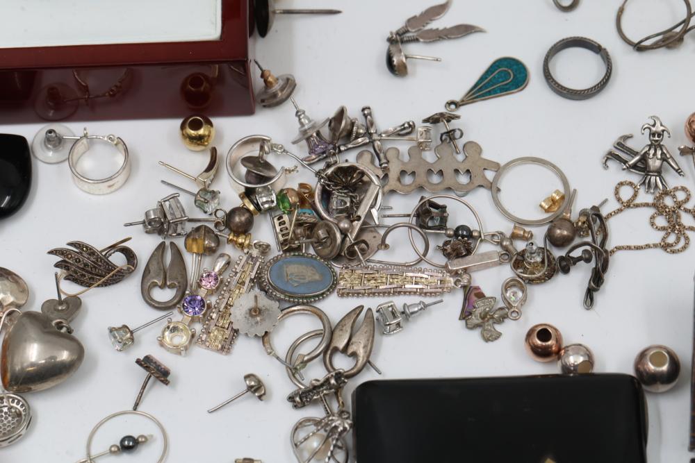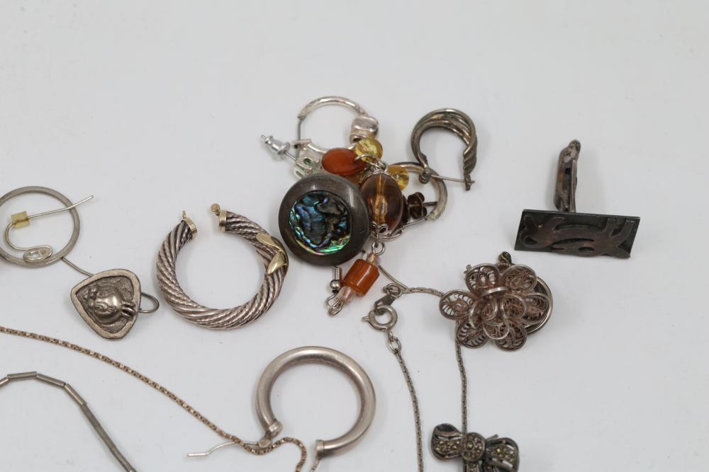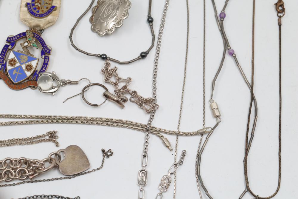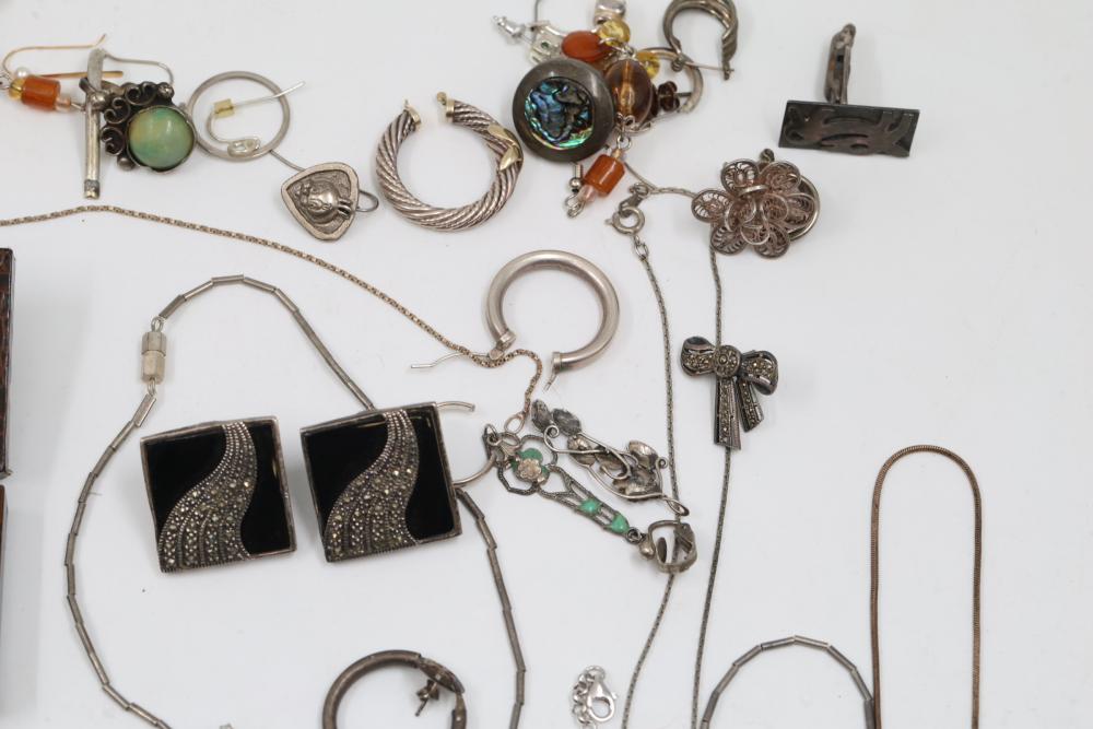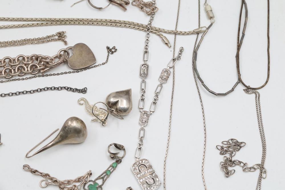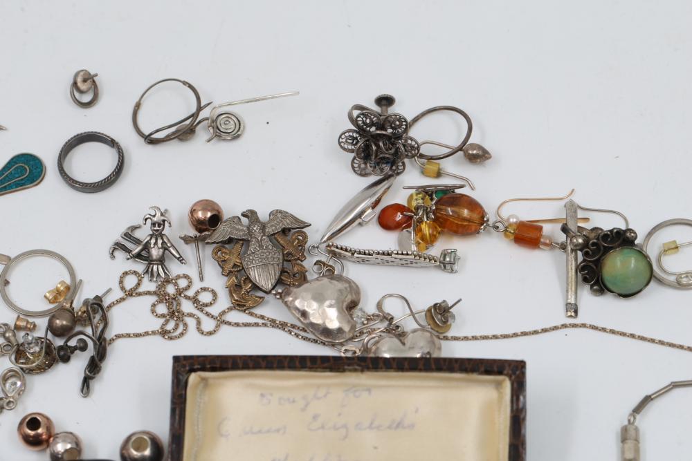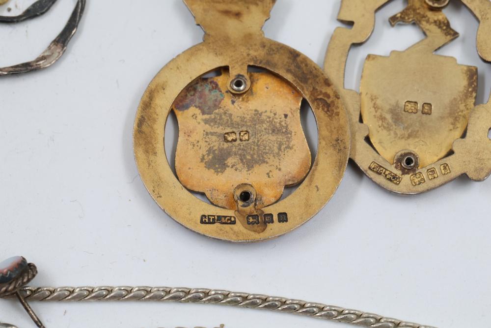Jewelry including necklaces, rings, pins, earrings, pendants, and bracelets constructed with metallics, stones, and enamel elements. Includes a silver-tone ring with embedded stones in a display box, brooches, chains, medallions, and various decorative pieces.