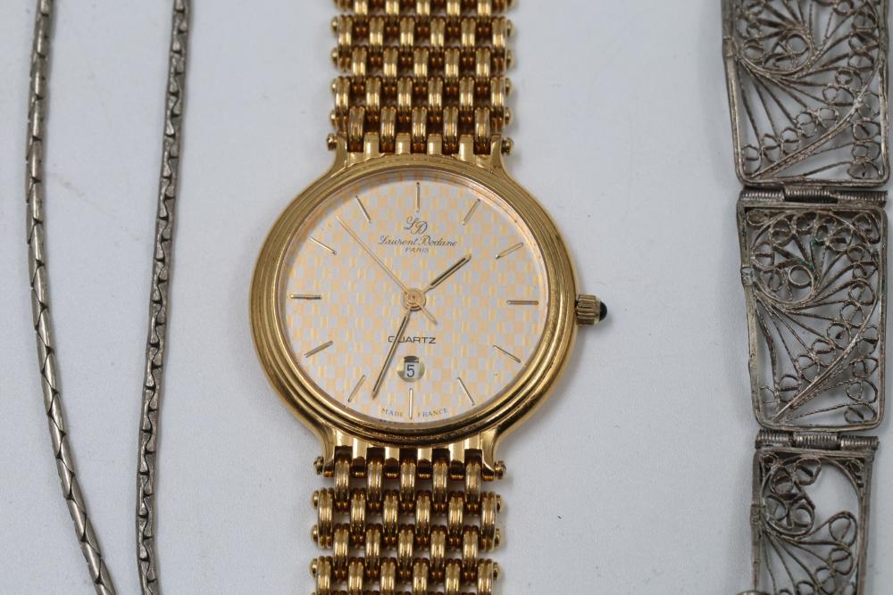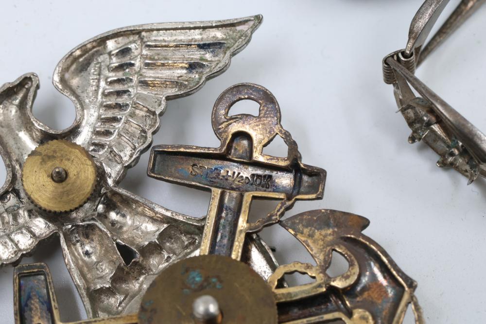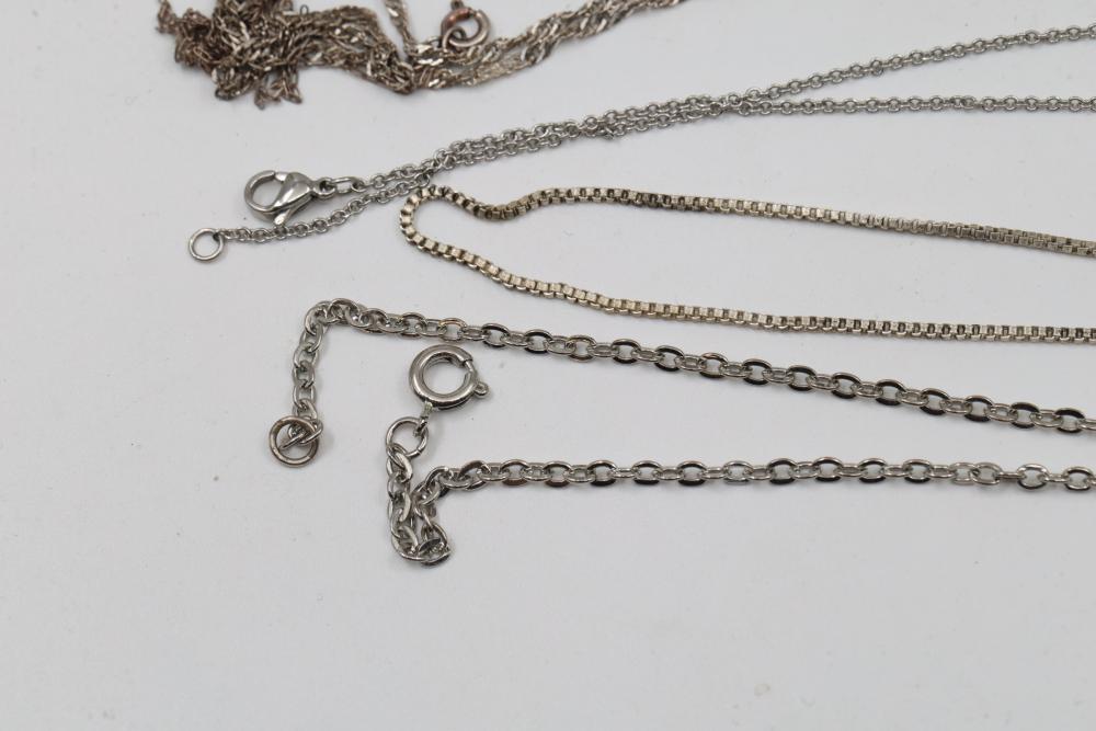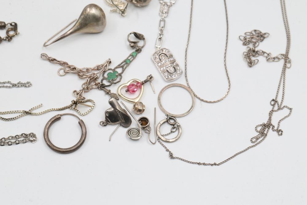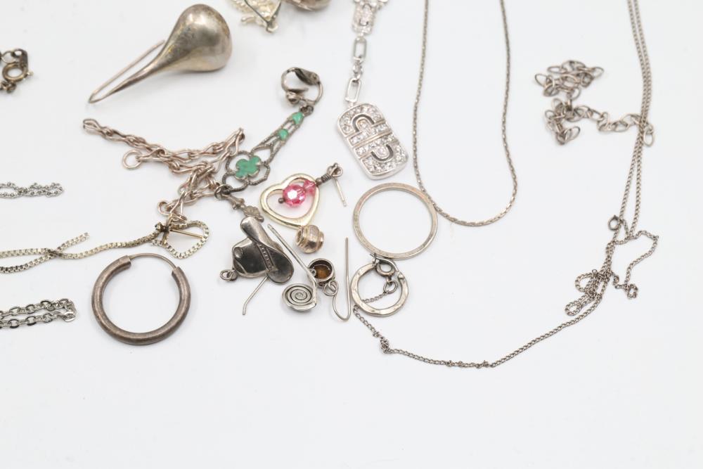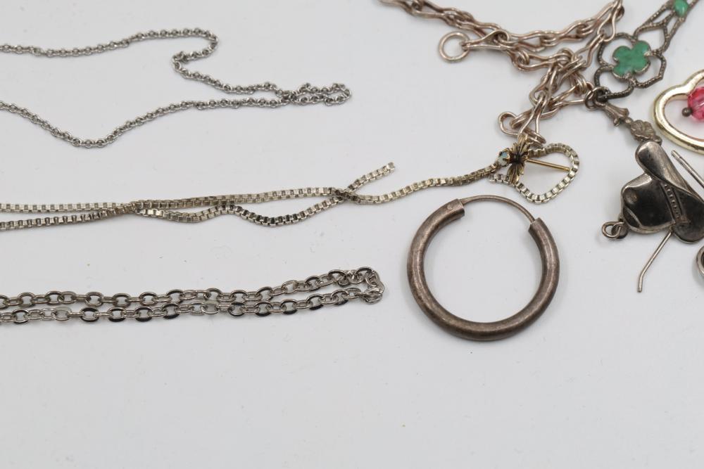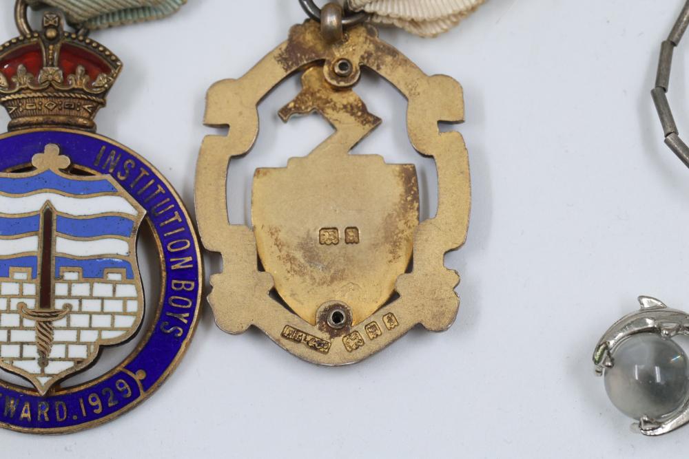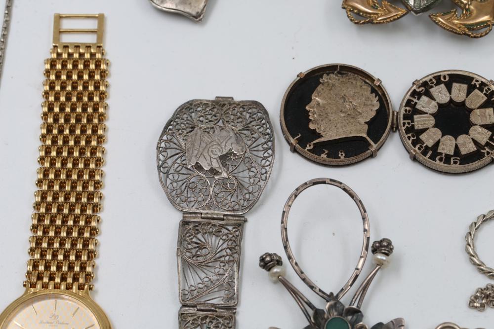 Jewelry including necklaces, rings, pins, earrings, pendants, and bracelets constructed with metallics, stones, and enamel elements. Includes a silver-tone ring with embedded stones in a display box, brooches, chains, medallions, and various decorative pieces.