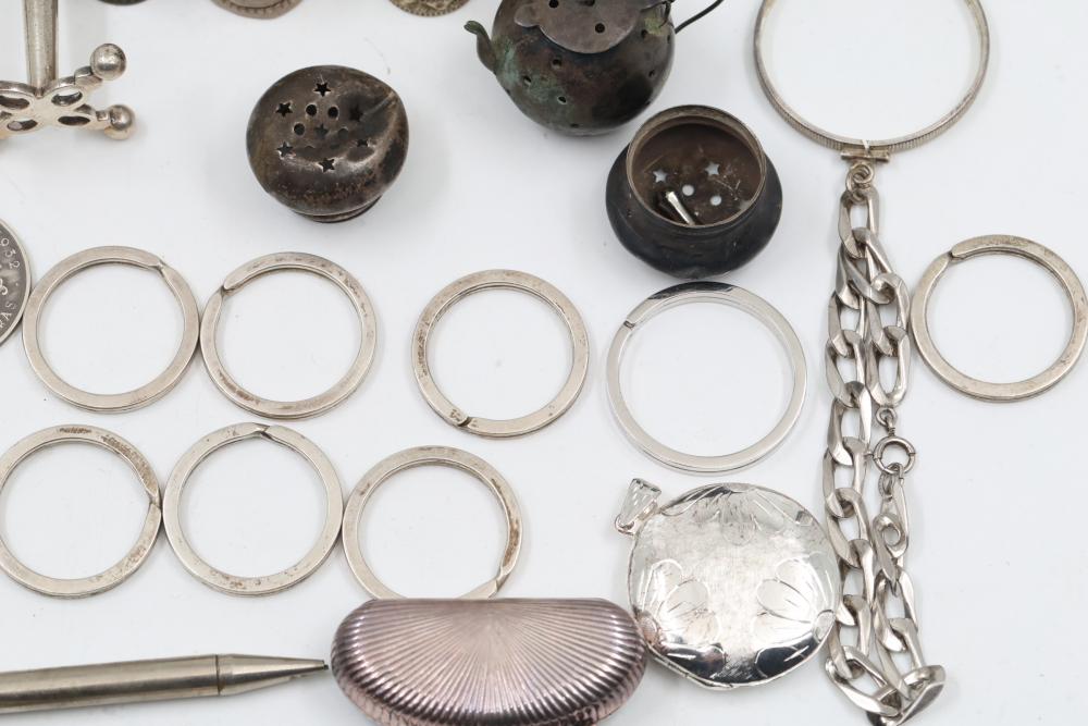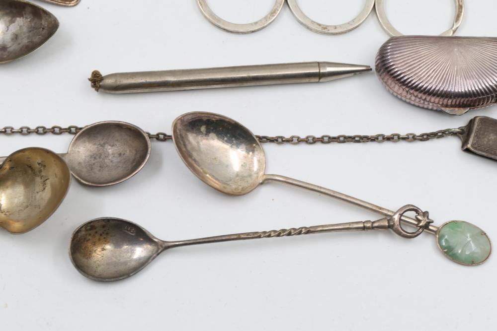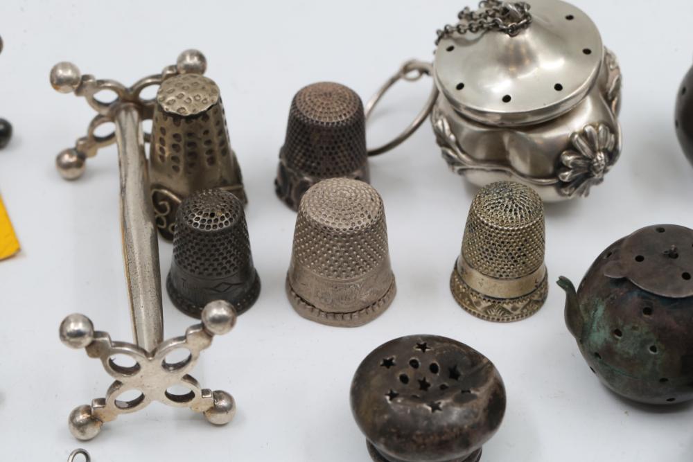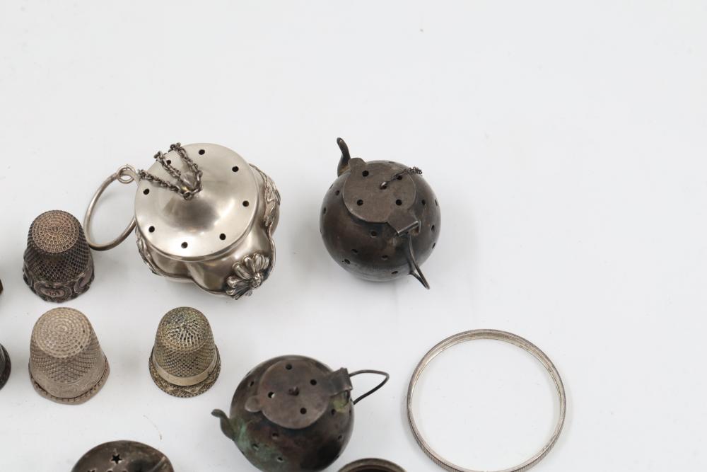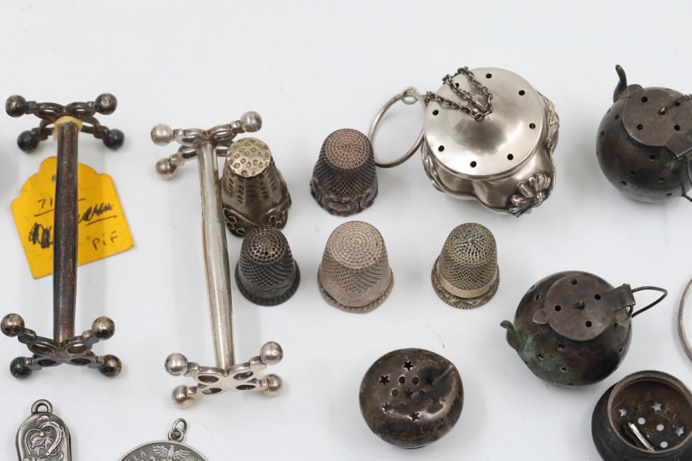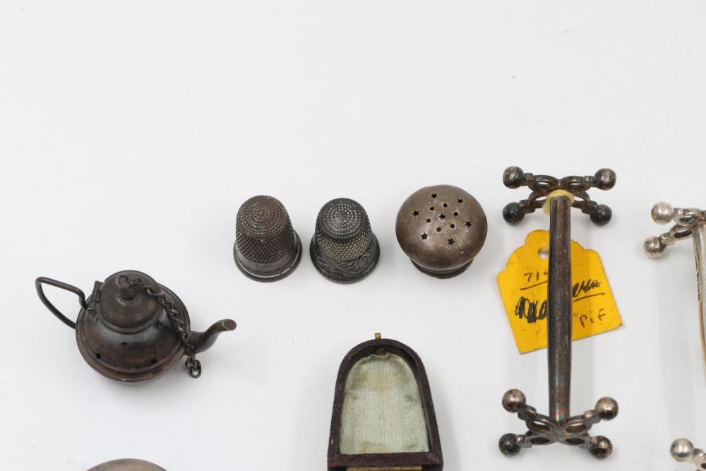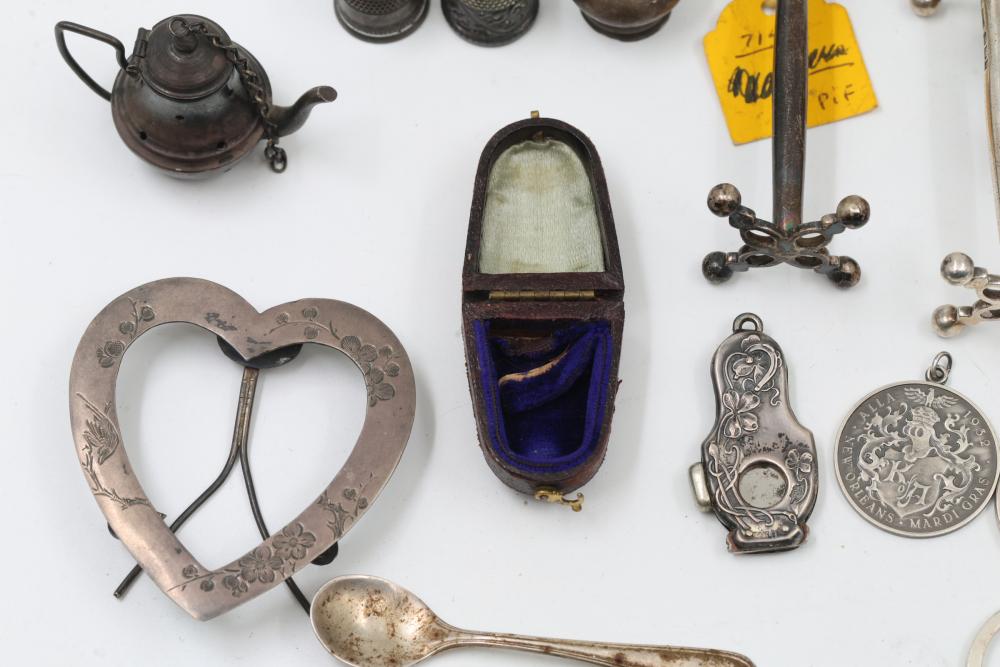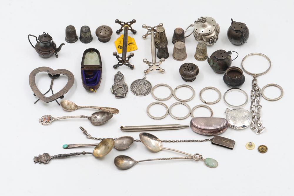 Metal decorative items including thimbles, spoons, napkin rings, miniature teapots, and figural accessories. Includes a mix of engraved spoons, small round containers, and various crafted pieces. Some items appear to have marks or inscriptions, such as "Paris 1887" and markings on spoons. Sterling weight is 65 grams.