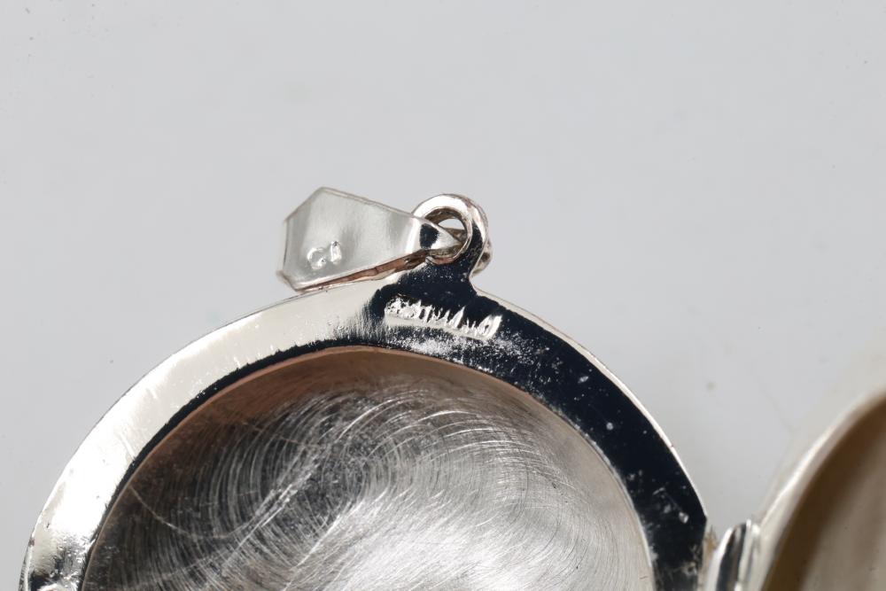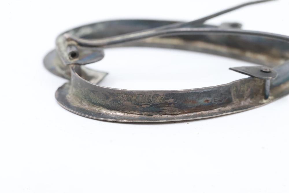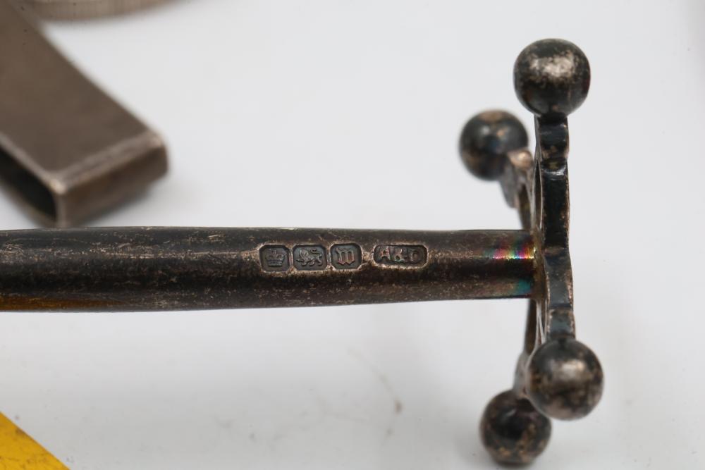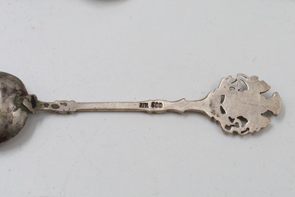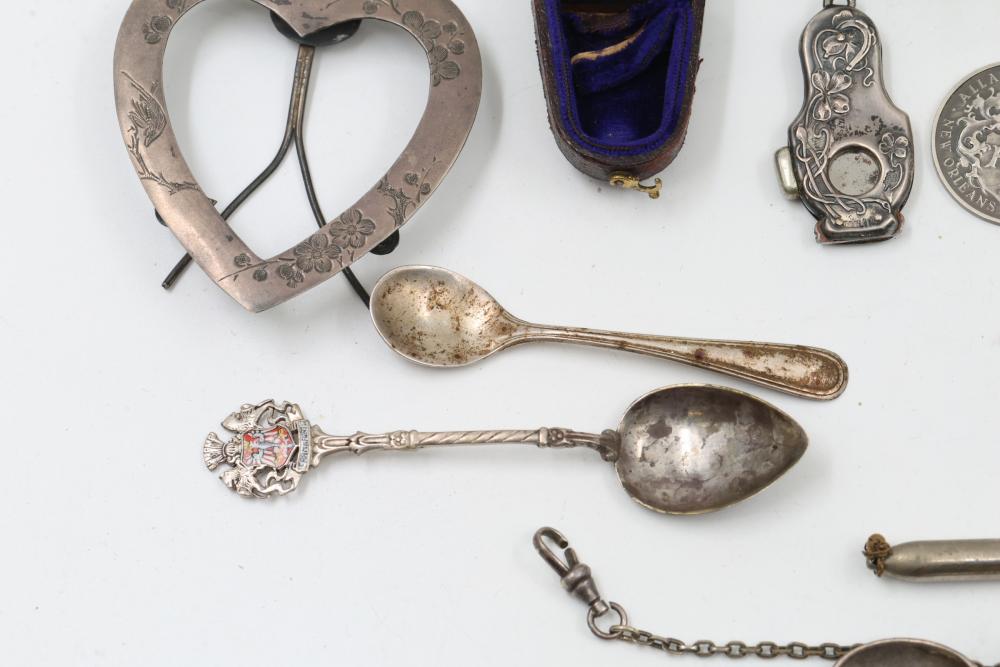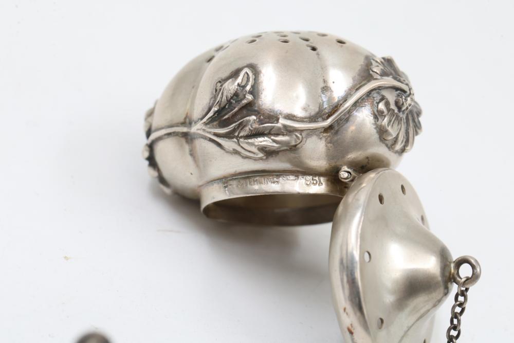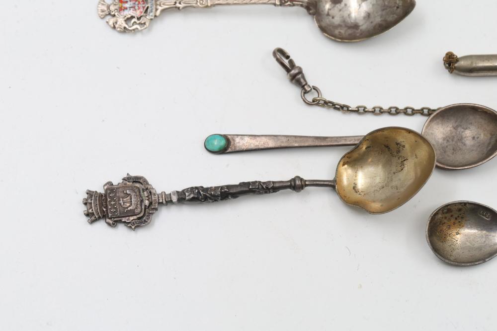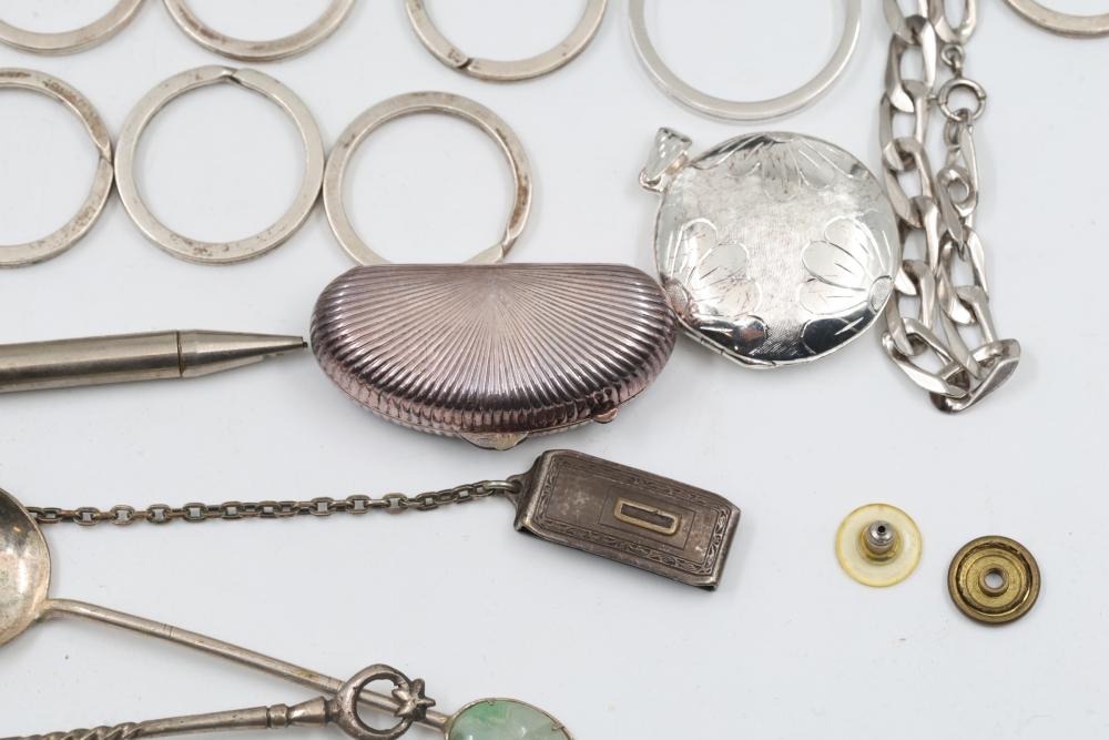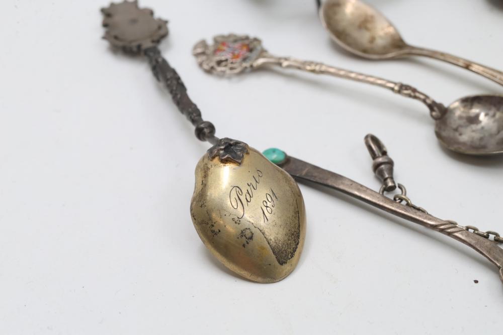 Metal decorative items including thimbles, spoons, napkin rings, miniature teapots, and figural accessories. Includes a mix of engraved spoons, small round containers, and various crafted pieces. Some items appear to have marks or inscriptions, such as "Paris 1887" and markings on spoons. Sterling weight is 65 grams.