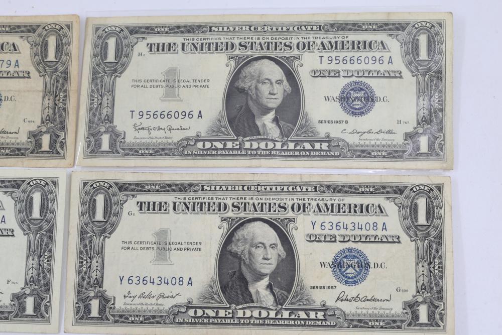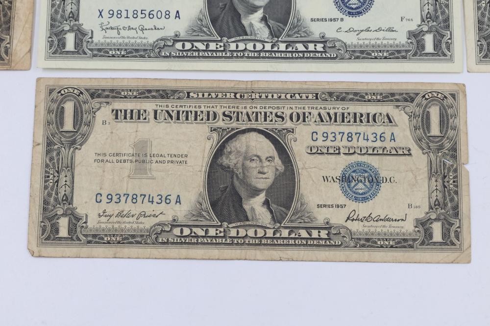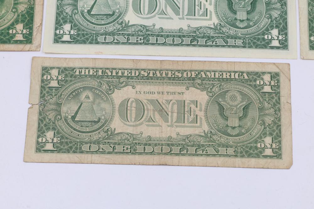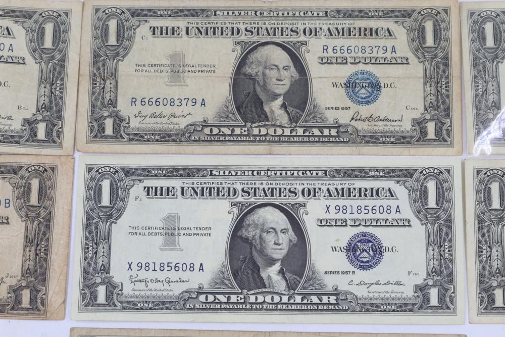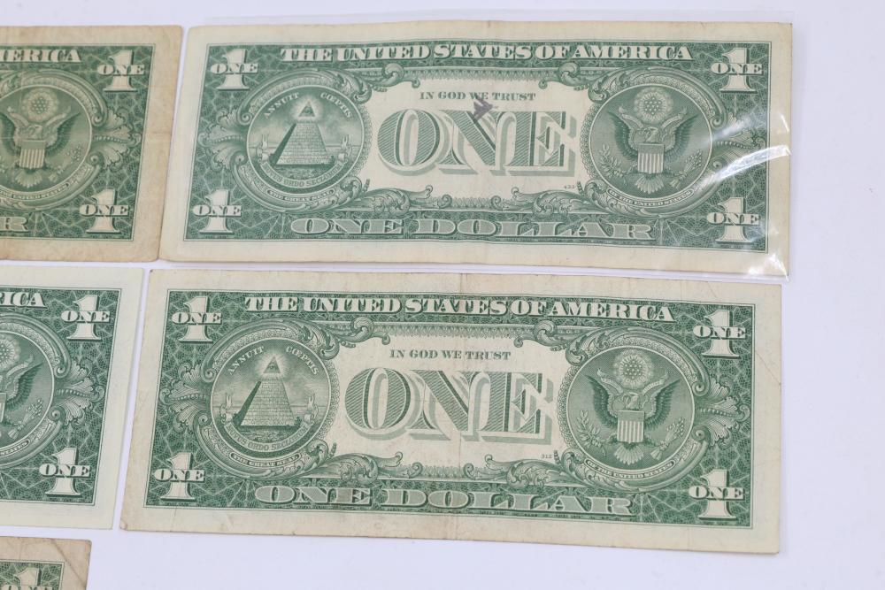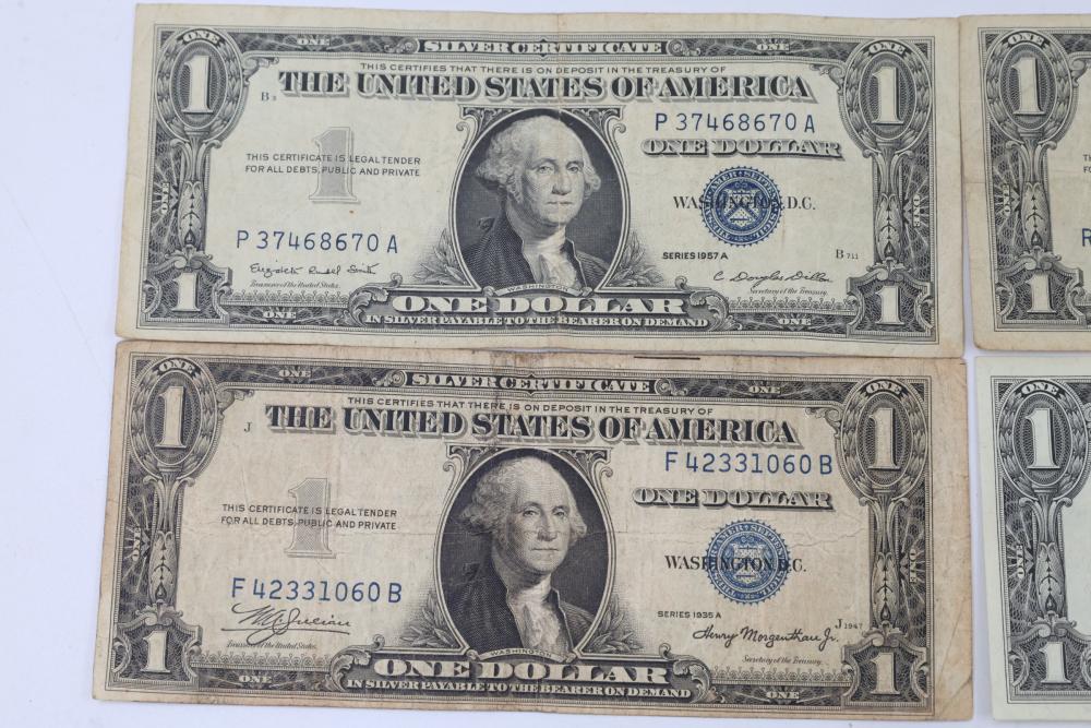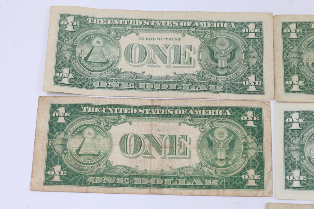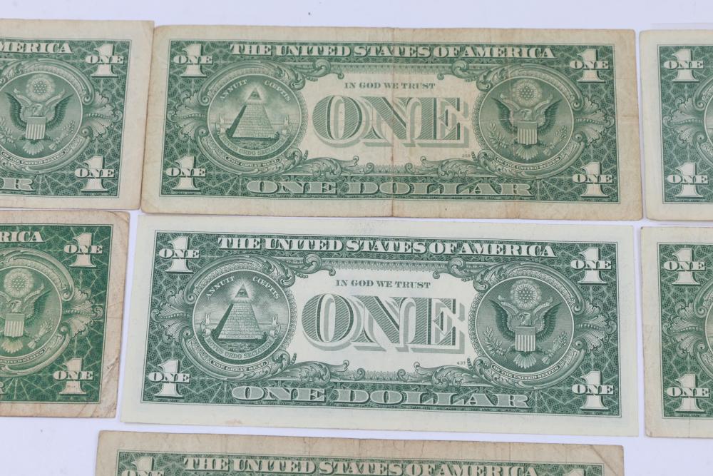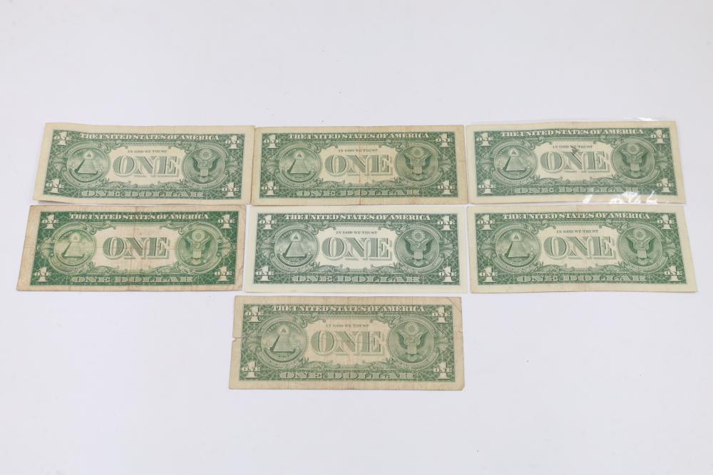 Series of Seven Silver Certificate One Dollar Bills. Features front engravings of George Washington and blue Treasury seals. The reverse displays the standard "ONE" and "In God We Trust" engravings. Various serial numbers visible.