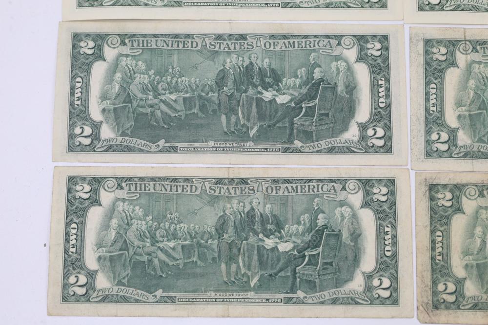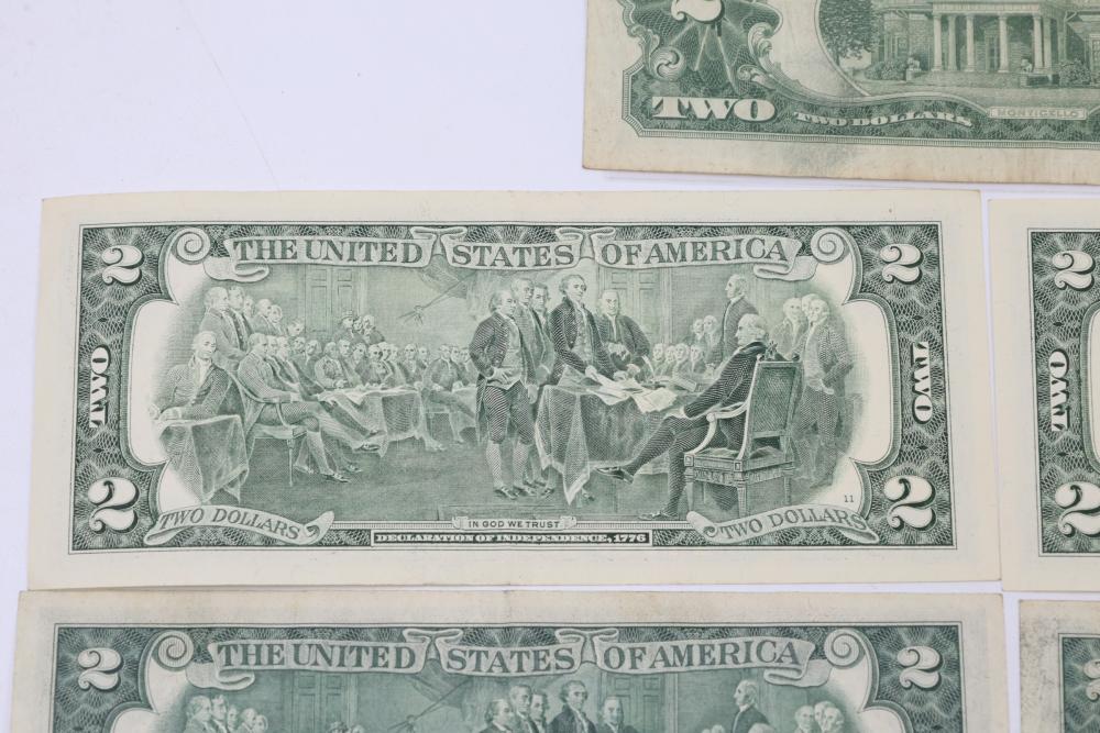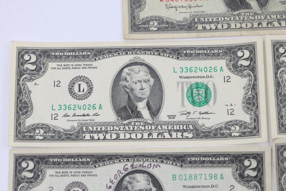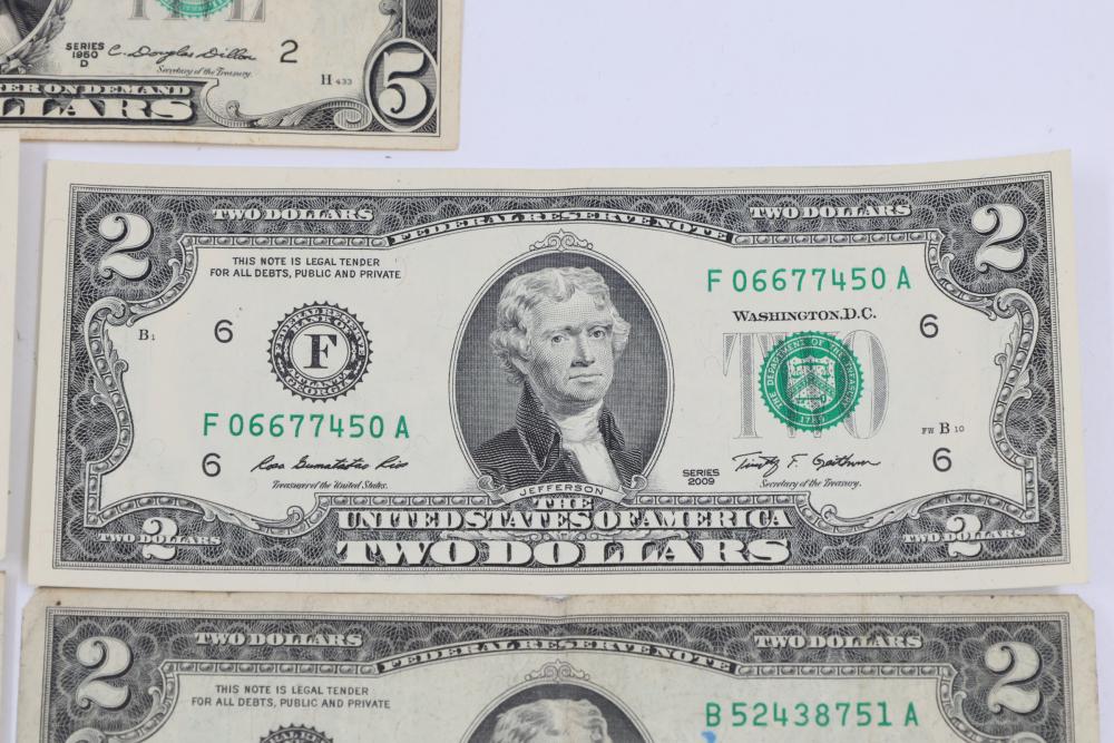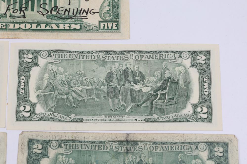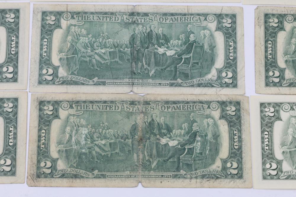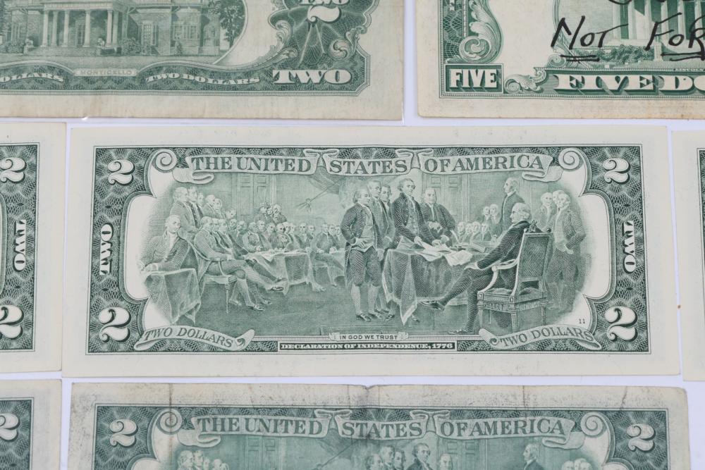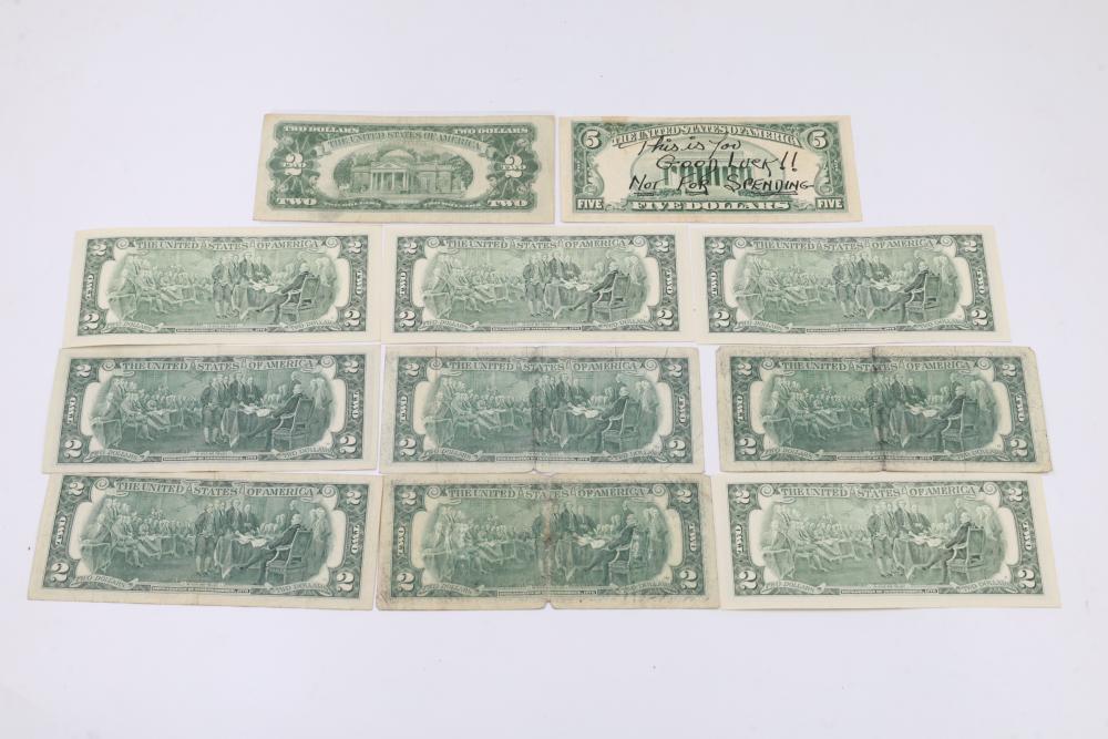Ten United States $2 and One $5 bill includes multiple $2 notes and a single $5 note with varied series years and conditions. Reverse designs feature historical imagery such as the Signing of the Declaration of Independence.